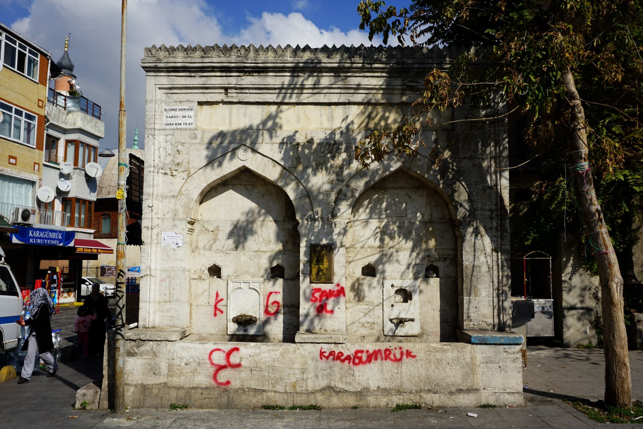 The Fountain is situated at Hırka-i Şerif Neighborhood, at the junction of Karabulut Street and Karagümrük Meydanı Street. There is no information on construction date and builder of the fountain as it has no epitaph. Its pointed arches and rumi palmets on its capstone suggests that the fountain was built in the 16th Century. The artifact that historic maps refer to as square fountain is known to be removed from its original location and moved to the corner of the street right behind. Its facade is visible at the area its was moved. The cut stone packed fountain has pointed arches that repeat each other while there are marble stone slabs and two bowl niches inside the arches. There are empty rectangular inscriptions on the niches on both facades. Rumi decorations on the inscription cover the fountain from one side to the other. The fountain was cleaned and regained water.