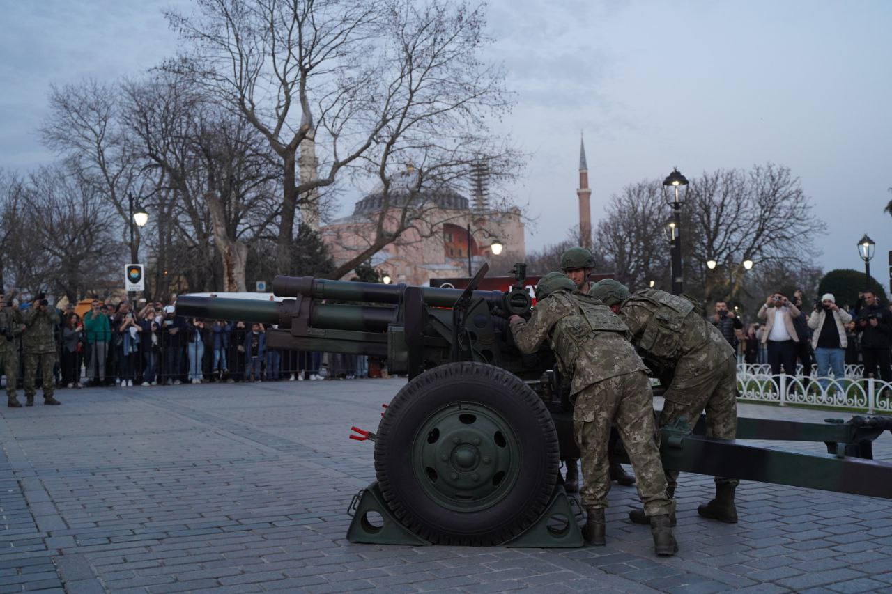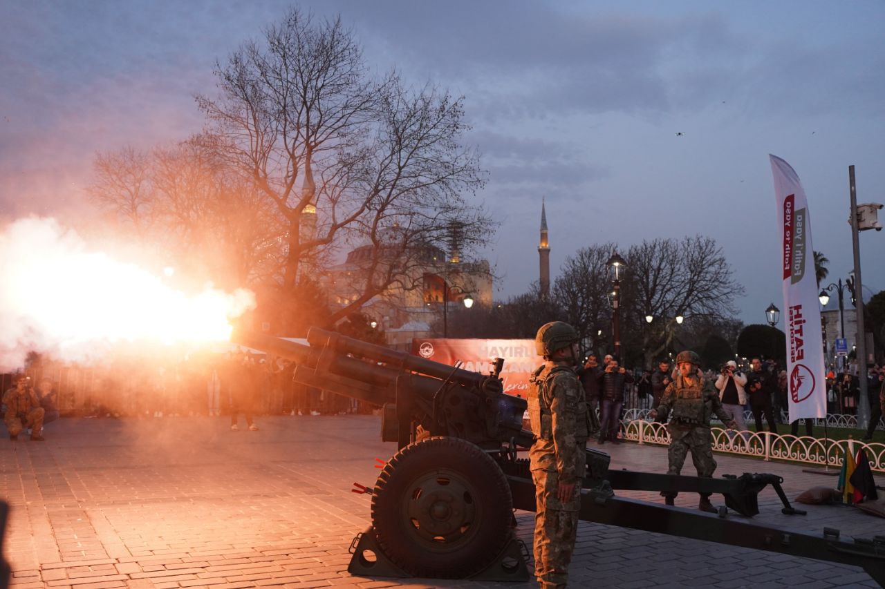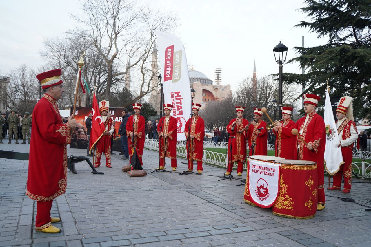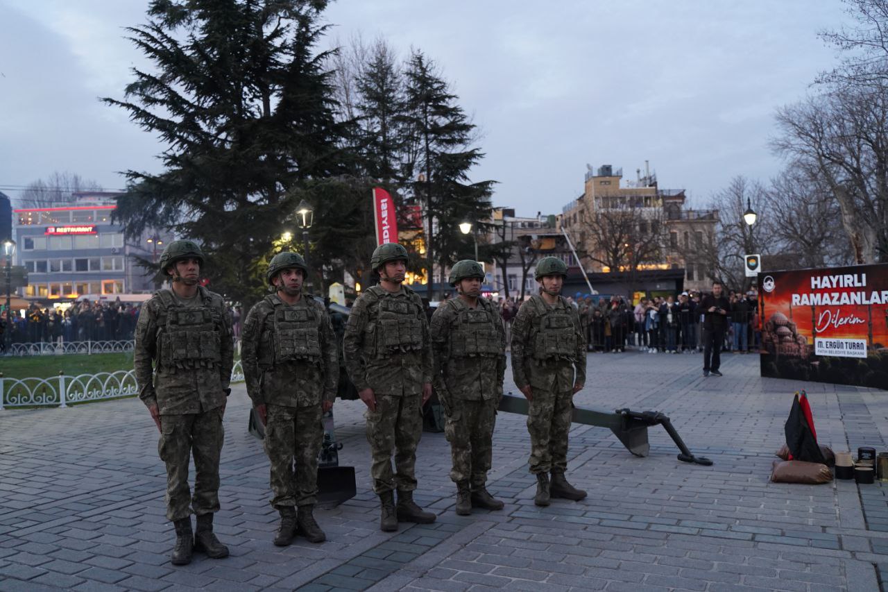 In the fast breaking program organized by the Fatih Municipality at Sultanahmet Square, first fast breaking took place accompanied by performance of the Mehter band and Koran chanting followed by cannon shot of the artillery unit under the First Army Command. The program that was organized at Sultanahmet Square attracted attention of citizens. The fast break stated with Koran chanting and followed by concert of the Mehter band. After traditional cannon shot of the artillery unit citizens broke their fasts. Many visitors from Türkiye and abroad in addition to Fatih and Istanbul came together at a spiritual fast breaking table.