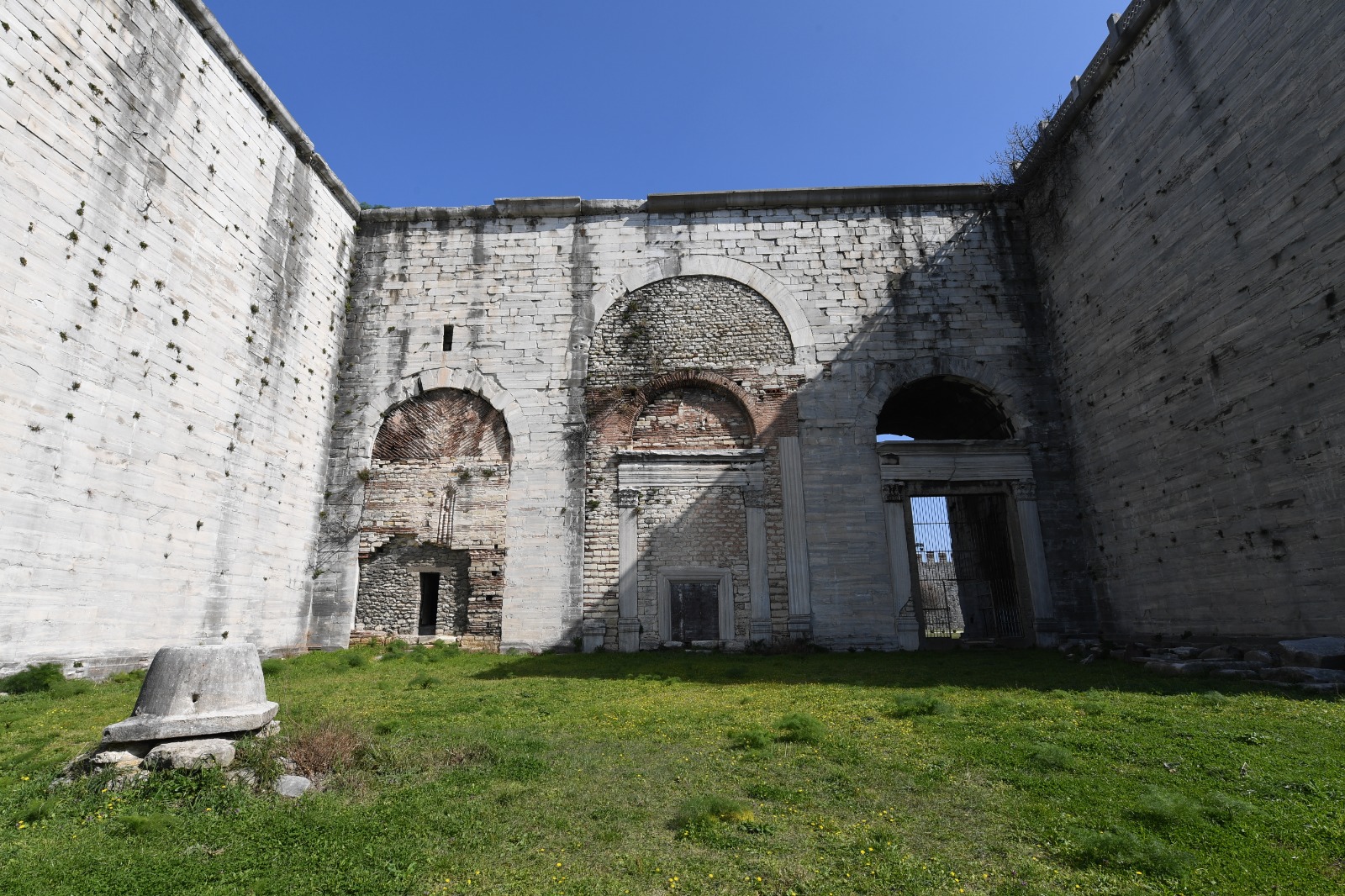 As part of the 1st stage works, the structural reinforcement work on the statically fragile wall between the North Pylon Tower and Ahmet III Tower and the Fatih Masjid Minaret has been completed. In addition, as part of the improvement of the middle courtyard; Cleaning, jointing, and repair work was carried out on certain wall surfaces. In addition, excavations were carried out on Fatih Masjid in Yedikule Fortress under the supervision of the Istanbul Turkish and Islamic Arts Museum Directorate, and the original foundations of the mosque were reached.