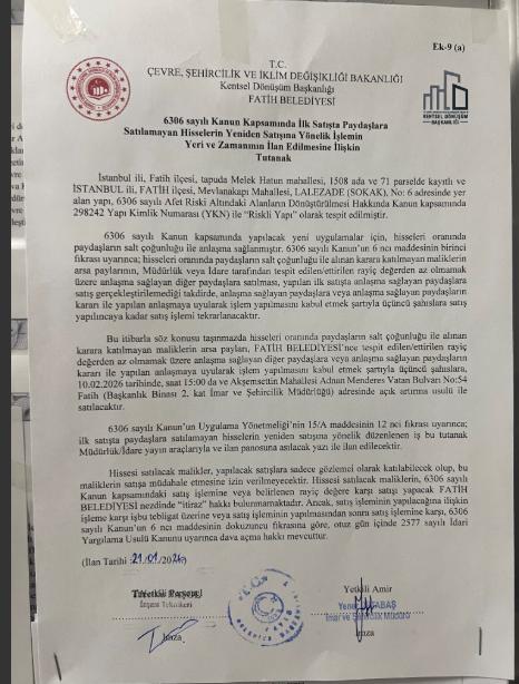 İlçemiz, Mevlanakapı Mahallesi, Lalezade Sokak, No: 6 adresinde yer alan taşınmazda, 6306 sayılı Afet Riski Altındaki Alanların Dönüştürülmesi İlan