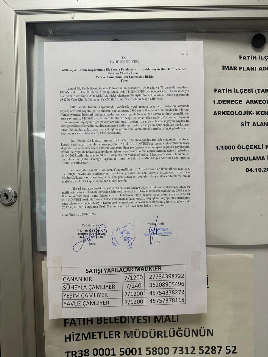İstanbul ili, Fatih ilçesi, tapuda Fatma Sultan mahallesi, 1900 ada ve 73 parselde kayıtlı ve israNgul ili. FATİH ilçesi, Topkapı Mahallesi, ETHEM EFENDİ (SOKAK), No: 1 adresinde yer alan yapı, 6306 sayılı Afet Riski Altındaki Alanlann Dönüştürülmesi Hakkında Tebligat