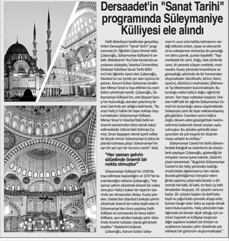 Dersaadet'in "Sanat Tarihi" programında Süleymaniye Külliyesi ele alındı 28.4.2021 - İstanbul Gazetesi