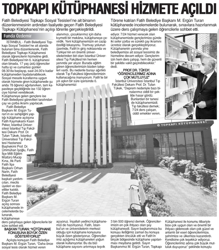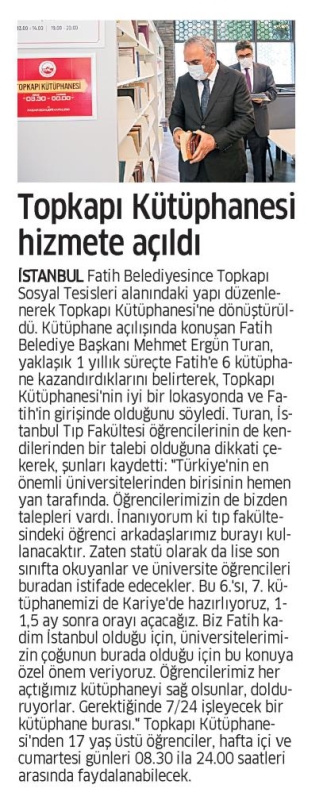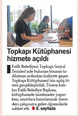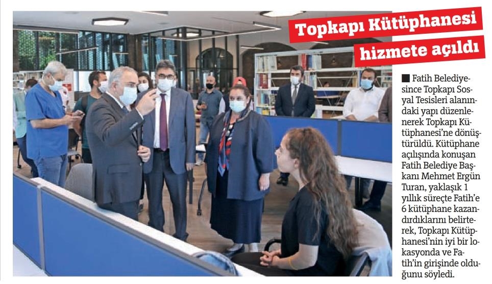 Topkapı Kütüphanesi Hizmete Açıldı 9.6.2020 - Türkiye Gazetesi