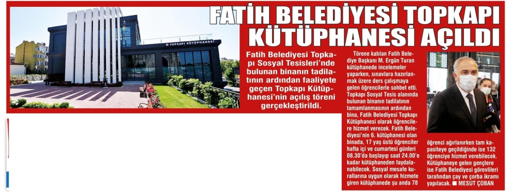 Topkapı Kütüphanesi Hizmete Açıldı 10.6.2020 - Yeni Çağrı Gazetesi