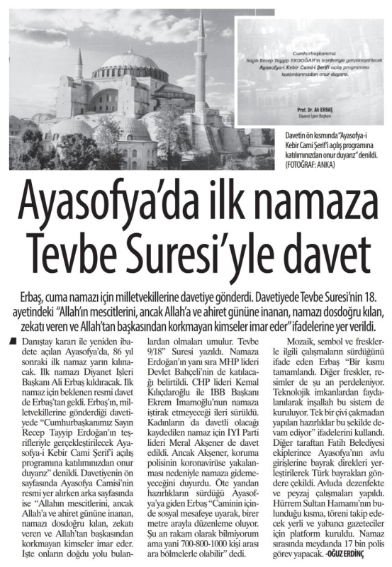 Ayasofya'da İlk Namaza Tevbe Suresi'yle Davet 23.7.2020 - Karar Gazetesi