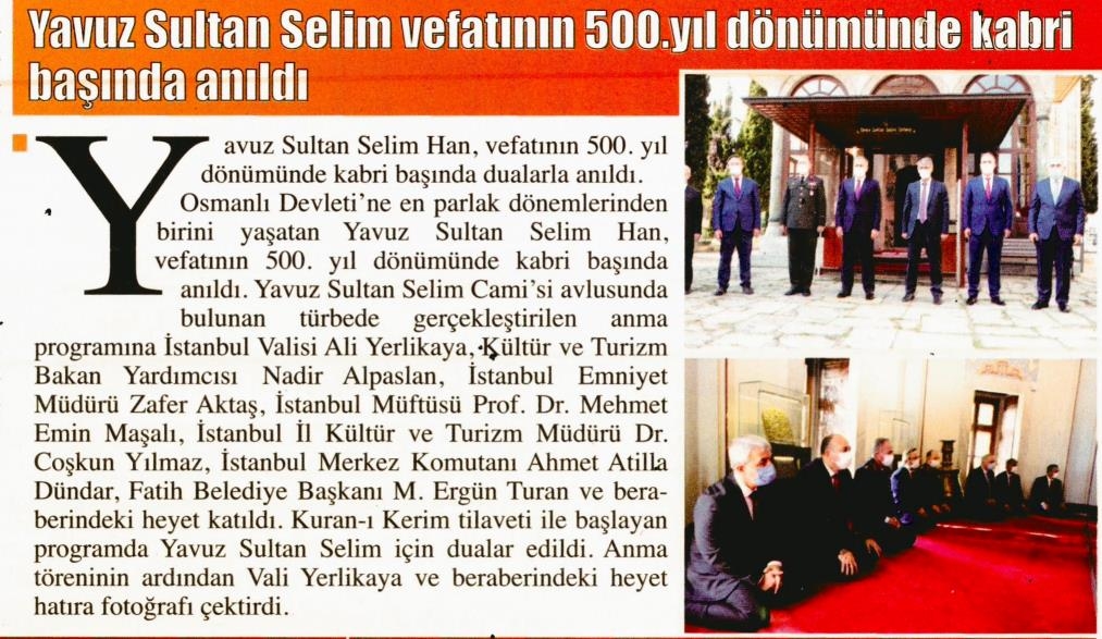 Yavuz Sultan Selim Vefatının 500.Yıl Dönümünde Kabri Başında Anıldı 28.9.2020 - Yazar Gazetesi