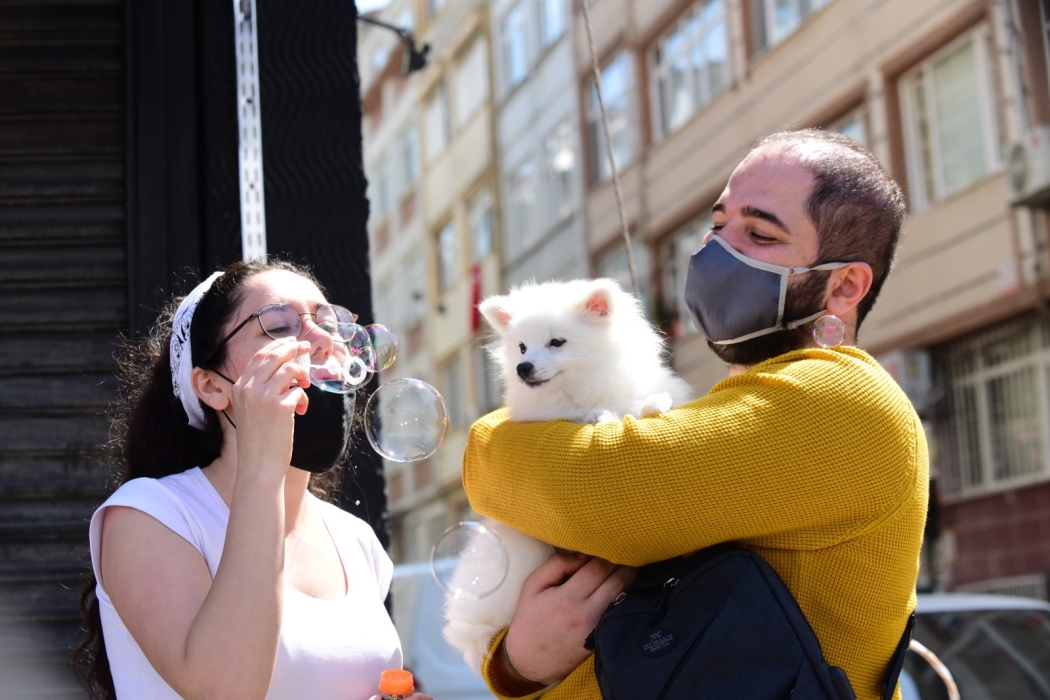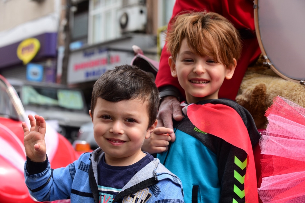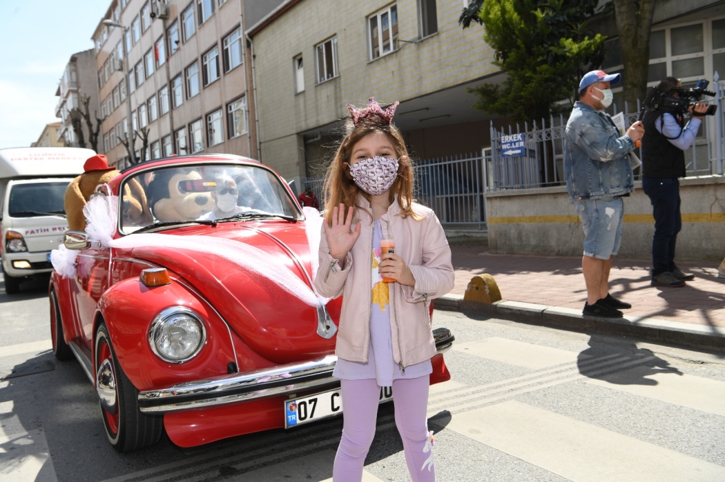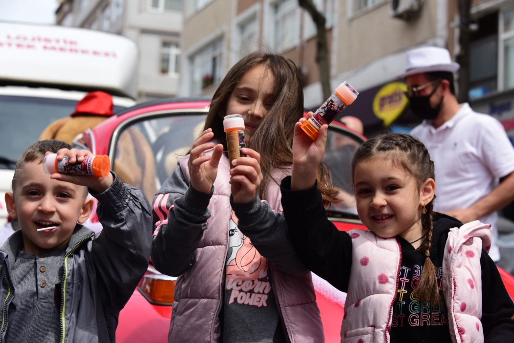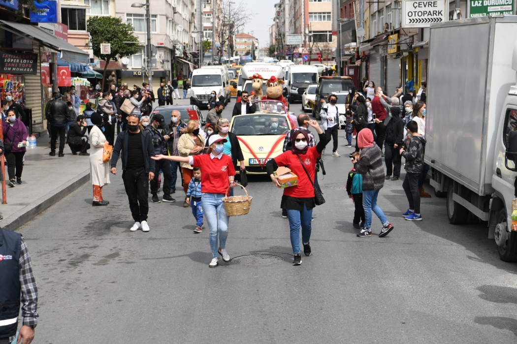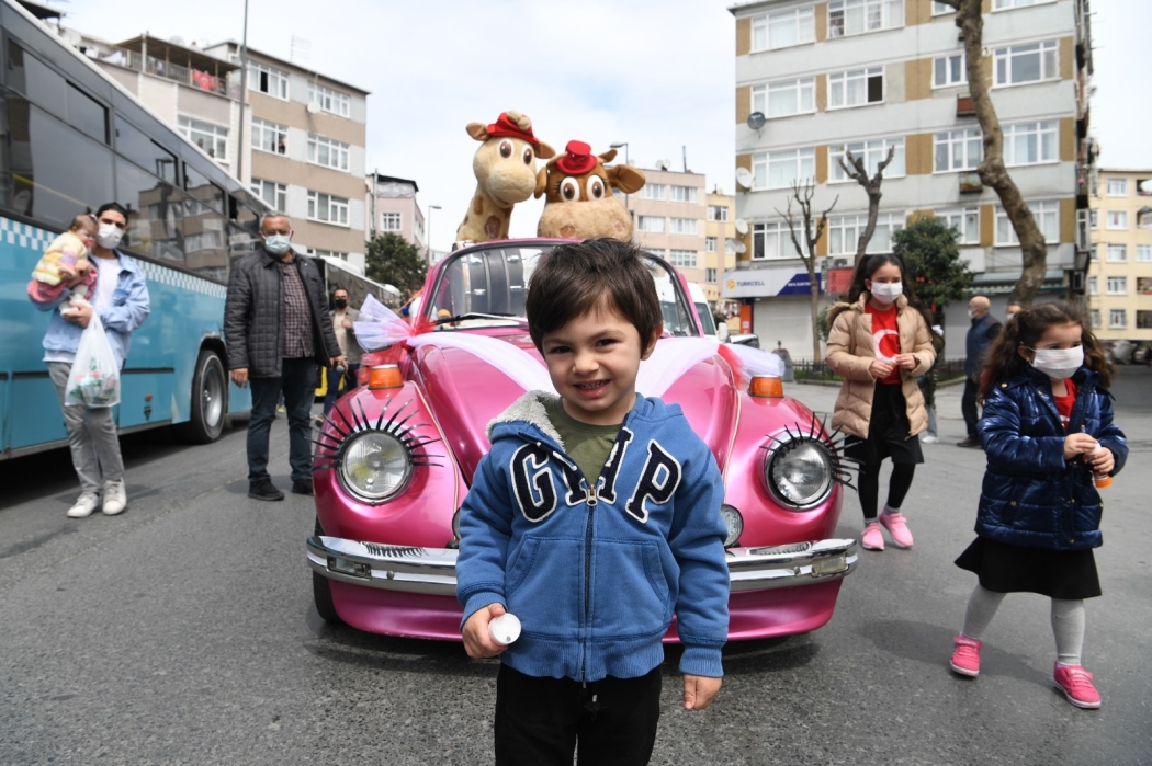 Korona virüs tedbirleri kapsamında alınan kısıtlama kararından dolayı çocuklar bu sene de 23 Nisan’ı evlerinde kutluyor. Fatih Belediyesi çocukların burukluğunu biraz olsun gidermek amacıyla düzenlediği etkinlikle maskot bando ve üstü açık vosvoslardan oluşan kortej eşliğinde ilçede sokakları dolaşarak miniklere köpük balon hediye etti. Köpük balon hediyelerini kapılarının önünden, evlerinin camlarından ve balkonlarından sarkıttıkları sepetlerden alan çocukların yüzlerindeki gülümseme ve mutluluk görülmeye değerdi. Aldıkları hediye ile hemen köpükler yapmaya başlayan çocuklar, cadde ve sokaklarda renkli görüntüler oluşturdu.