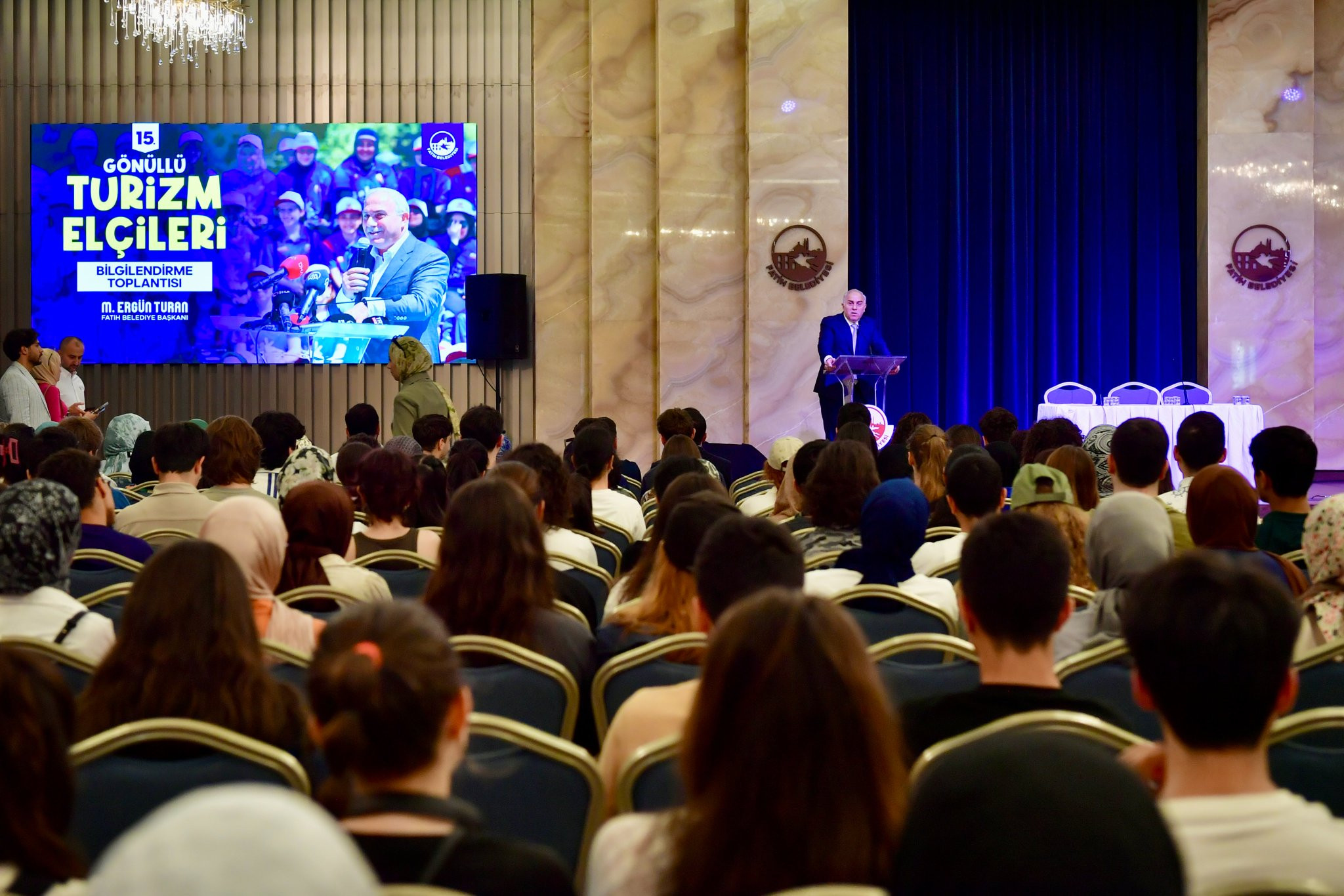 Fatih Belediyesi, İstanbul Ticaret Odası ve TUGEV (Turizm Geliştirme ve Eğitim Vakfı) iş birliğiyle geleneksel olarak sürdürülen Gönüllü Turizm Elçileri Programı’nın 15. yılı kapsamında bir bilgilendirme toplantısı, Fatih Belediye Başkanı M. Ergün Turan’ın katılımıyla Neslişah Sultan Kültür Merkezi’nde düzenlendi. Yazılı ve sözlü sınav süreçlerini başarıyla tamamlayarak programa dahil olmaya hak kazanan 400 genç, bu yaz Fatih’i ziyaret eden yerli ve yabancı turistlere tarihî ve kültürel rehberlik yapacak.