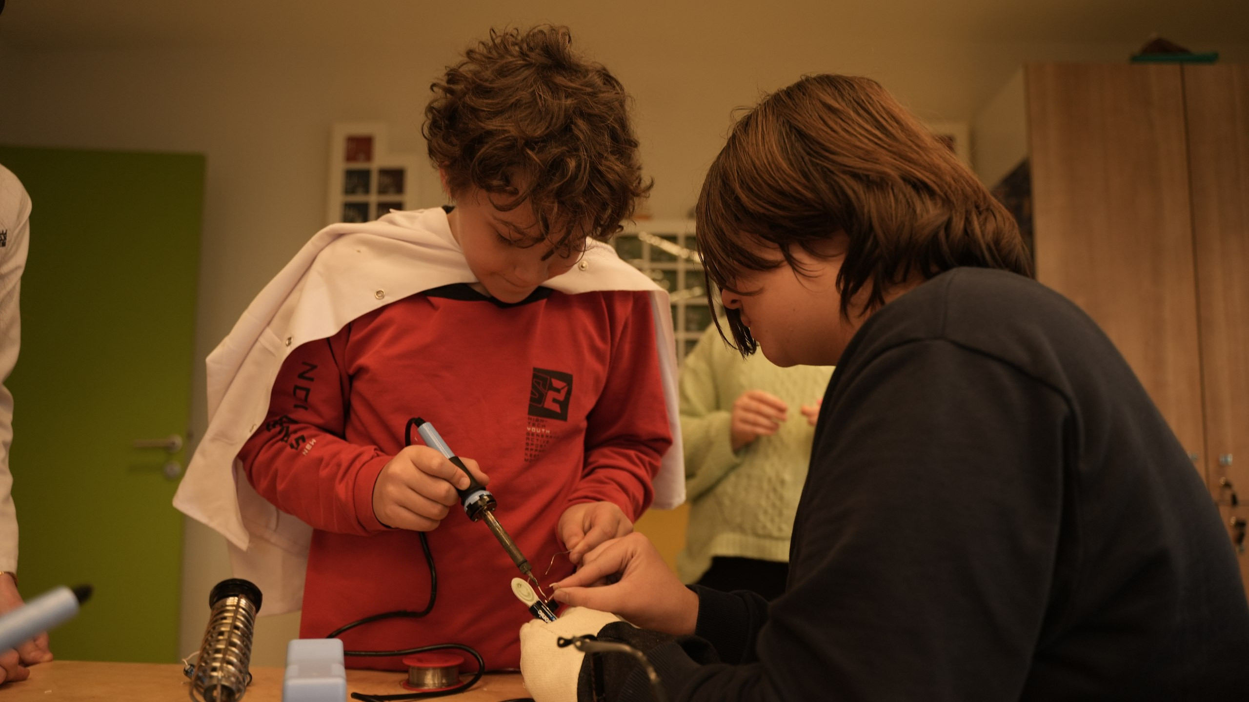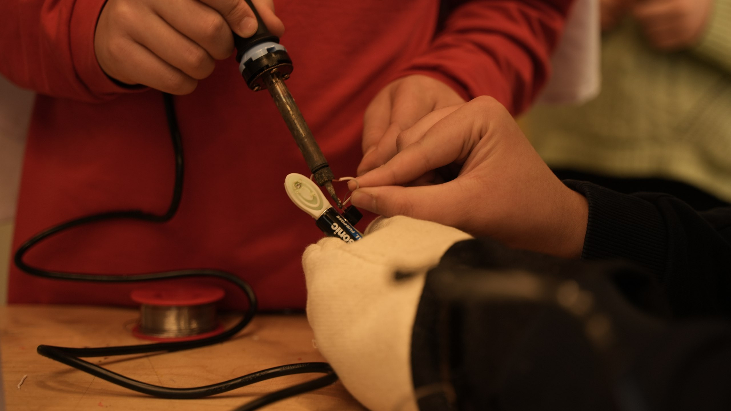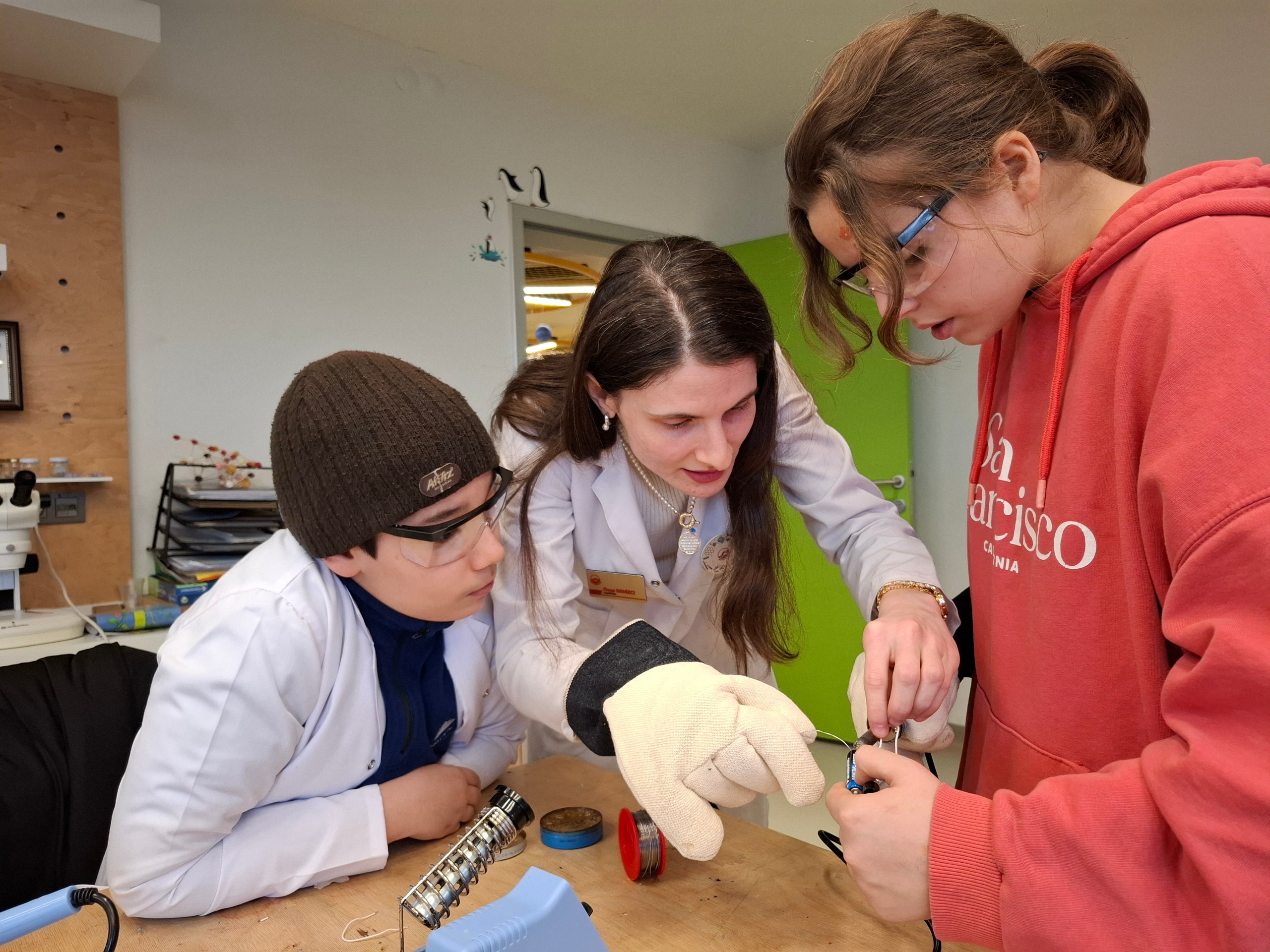 Uygulama sürecinin devamında öğrenciler, havya kullanarak lehimleme çalışmaları gerçekleştirdi. Devre elemanlarını doğru ve güvenli biçimde birleştiren öğrenciler, kendi alarm sistemlerini üretmenin sorumluluğunu üstlendi. Bu süreç, öğrencilerin el becerilerini geliştirmenin yanı sıra dikkat, sabır ve planlı çalışma alışkanlıklarını da güçlendirdi.