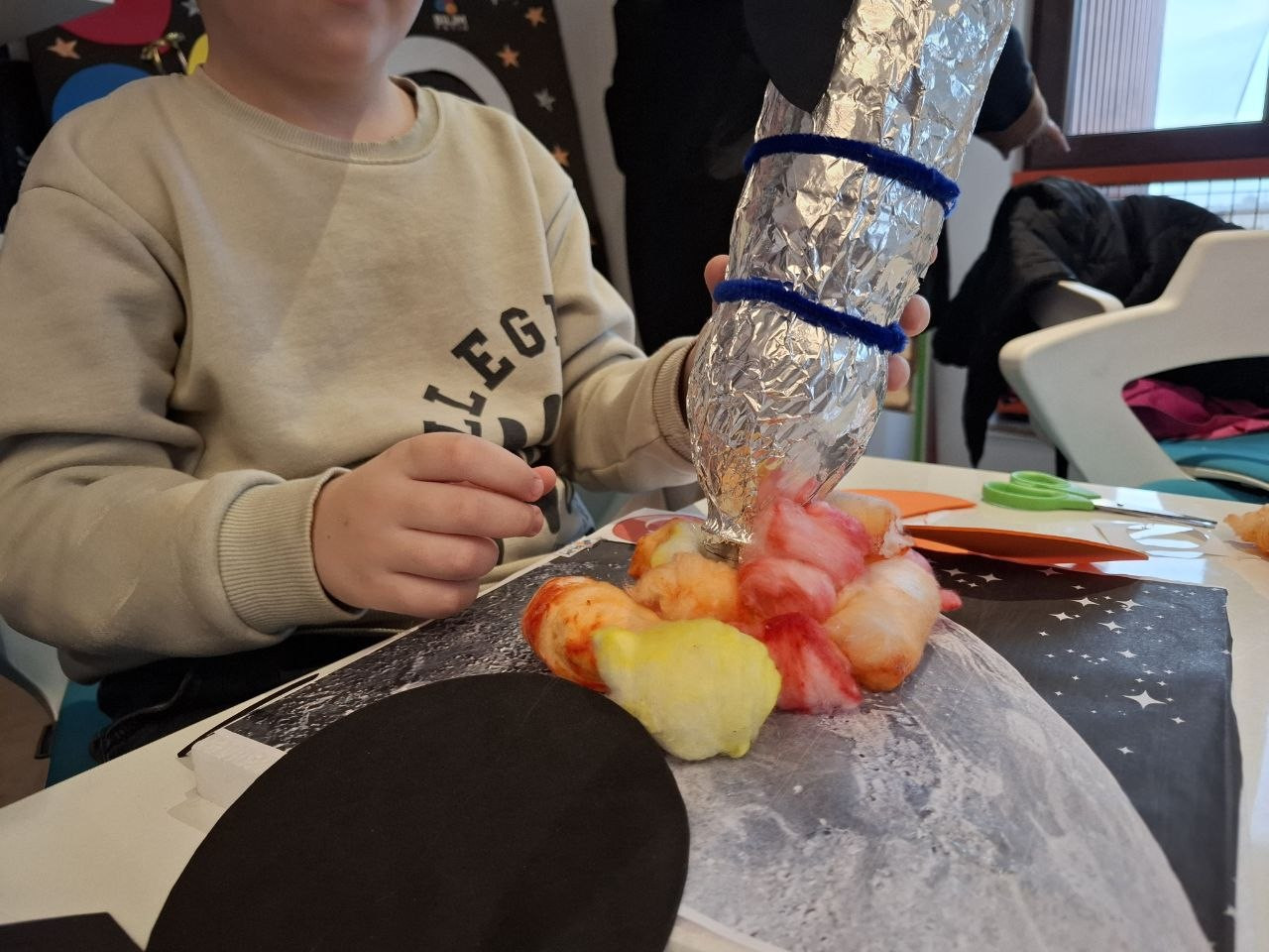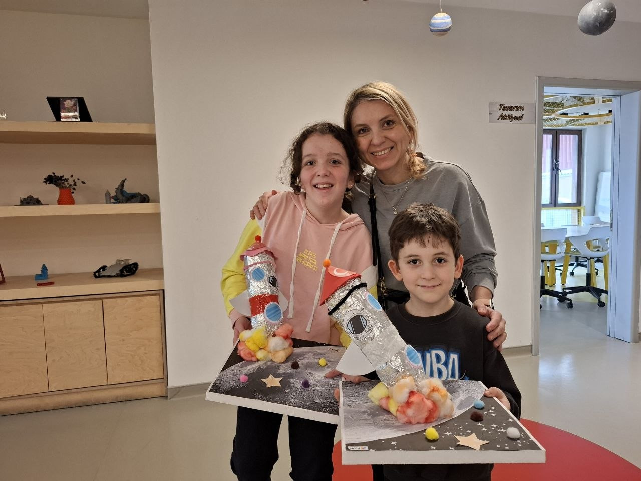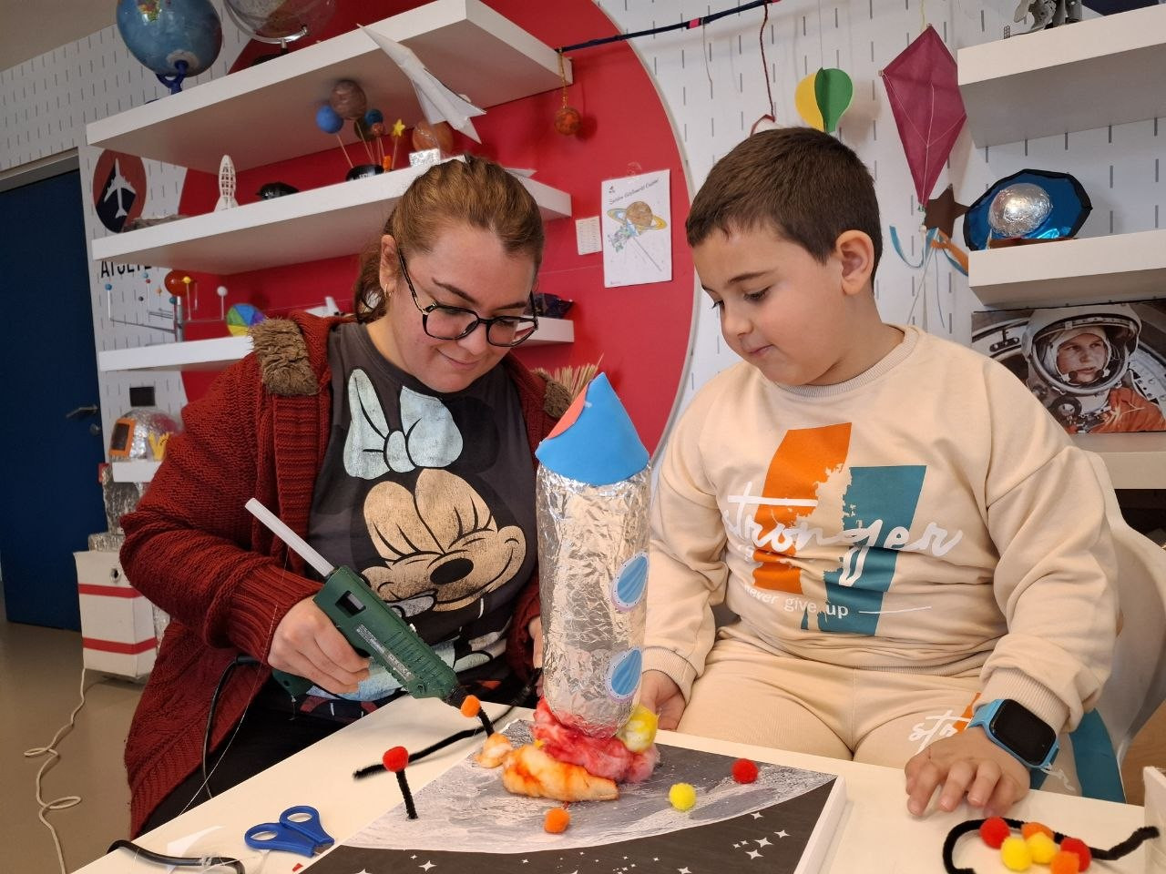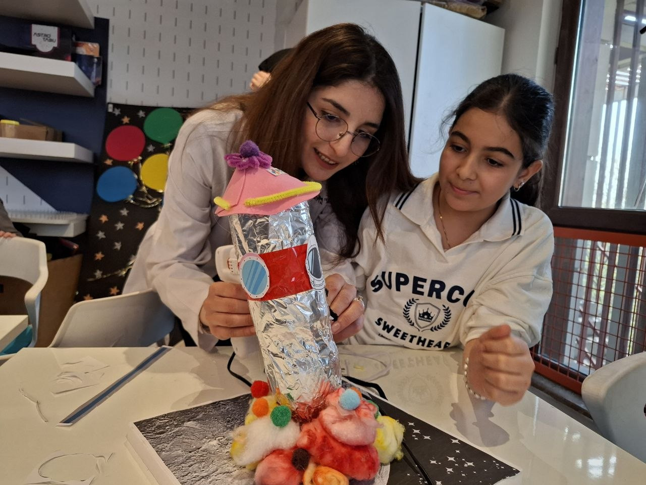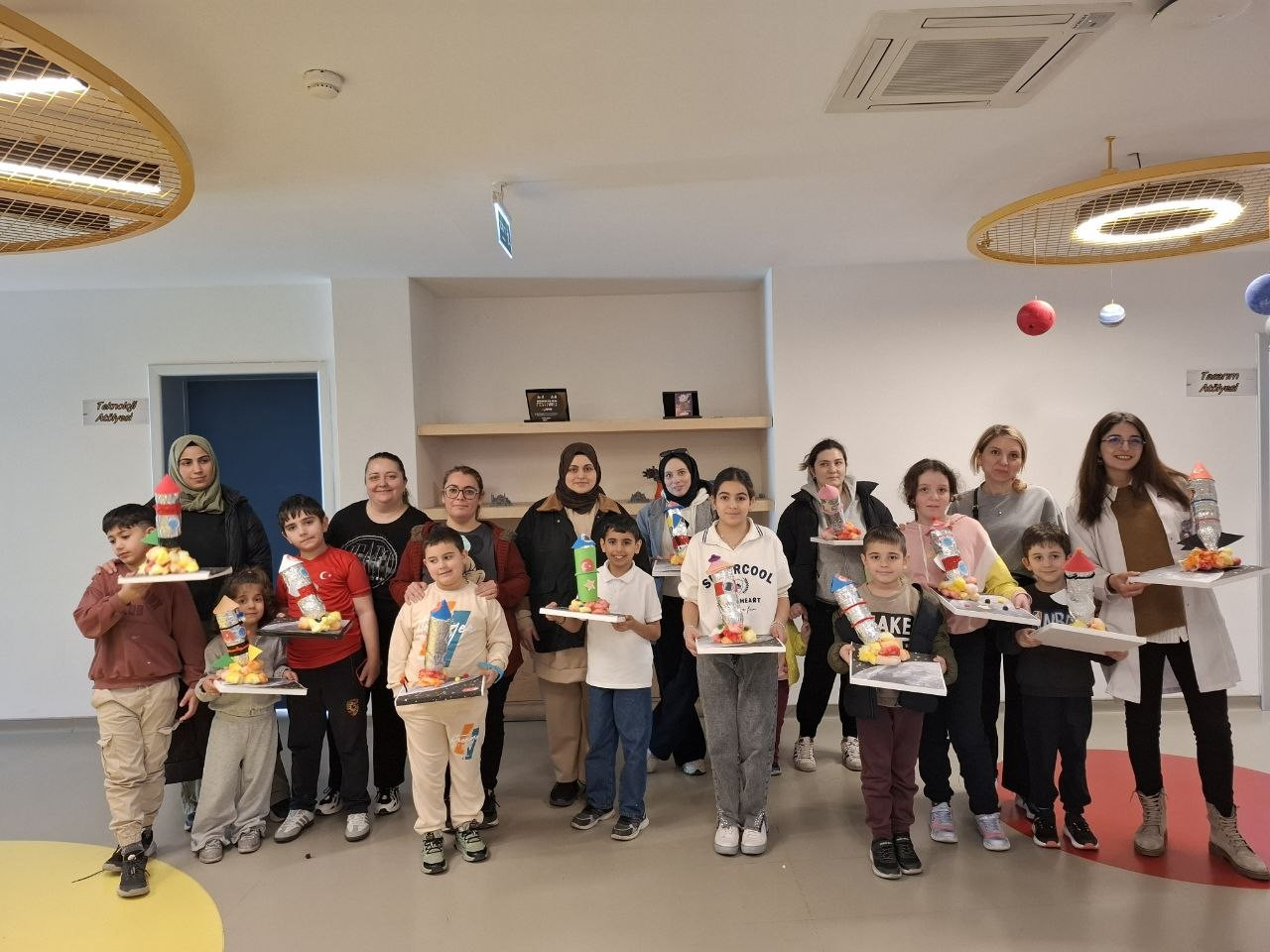 Program süresince katılımcılar, geri dönüştürülebilir malzemeler kullanarak roket tasarım sürecine dahil oldu. Özellikle pet şişelerin yeniden değerlendirilmesiyle gerçekleştirilen üretim aşamasında çocuklar; tasarımın planlanması, denge unsurlarının kurulması, parçaların bir araya getirilmesi ve işlevsel bir model oluşturulması gibi aşamaları birebir uyguladı. Bu süreç, çocukların üretim odaklı düşünme becerilerini desteklerken aynı zamanda problem çözme ve karar verme süreçlerine aktif katılımını sağladı.