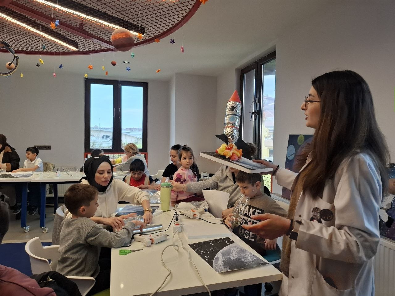 Bilim Fatih’te çocuklarımız, velileriyle geri dönüştürülebilir malzemelerle roket tasarladı; temel bilimsel kavramları uygulamalı olarak öğrendi.