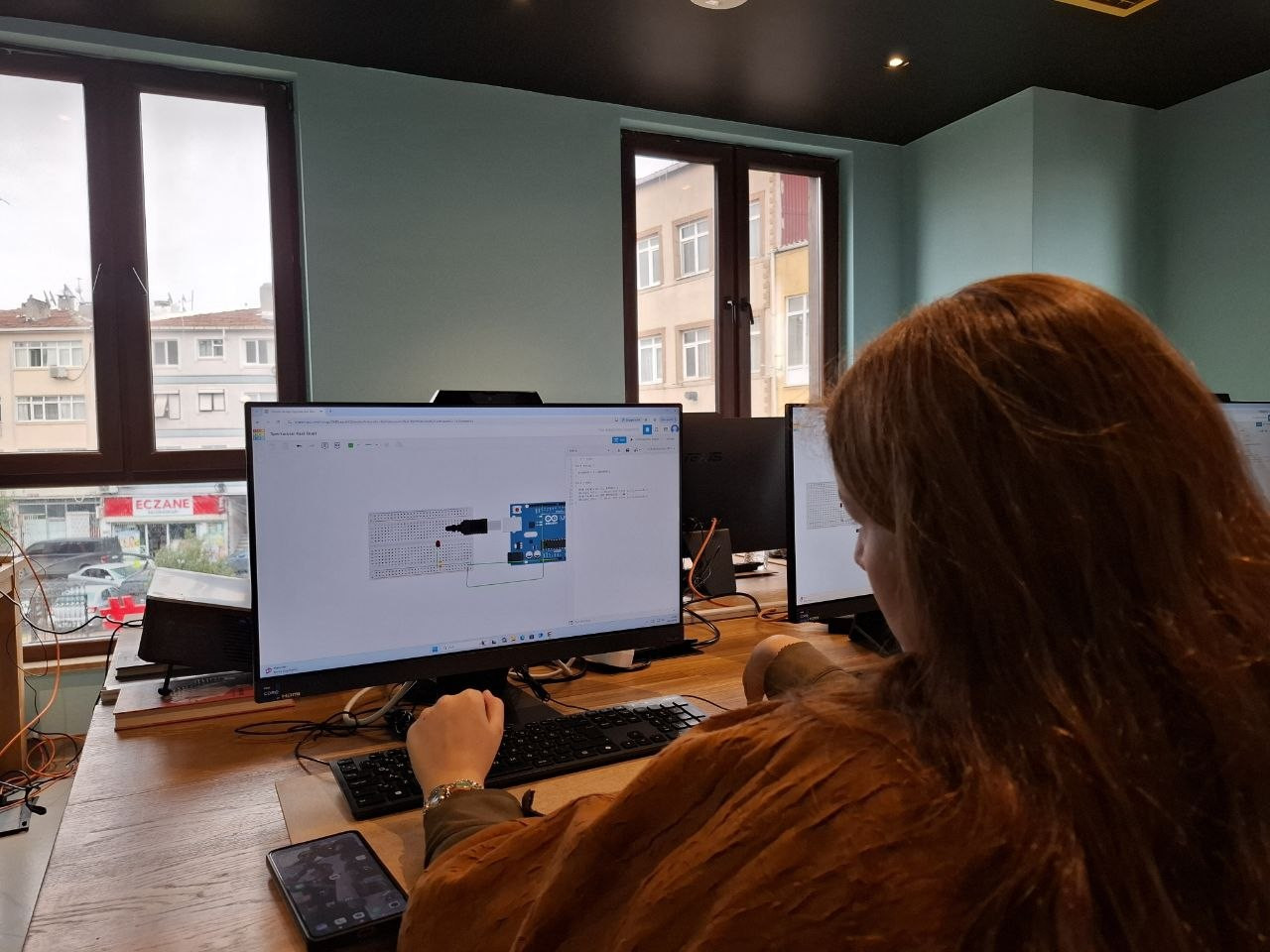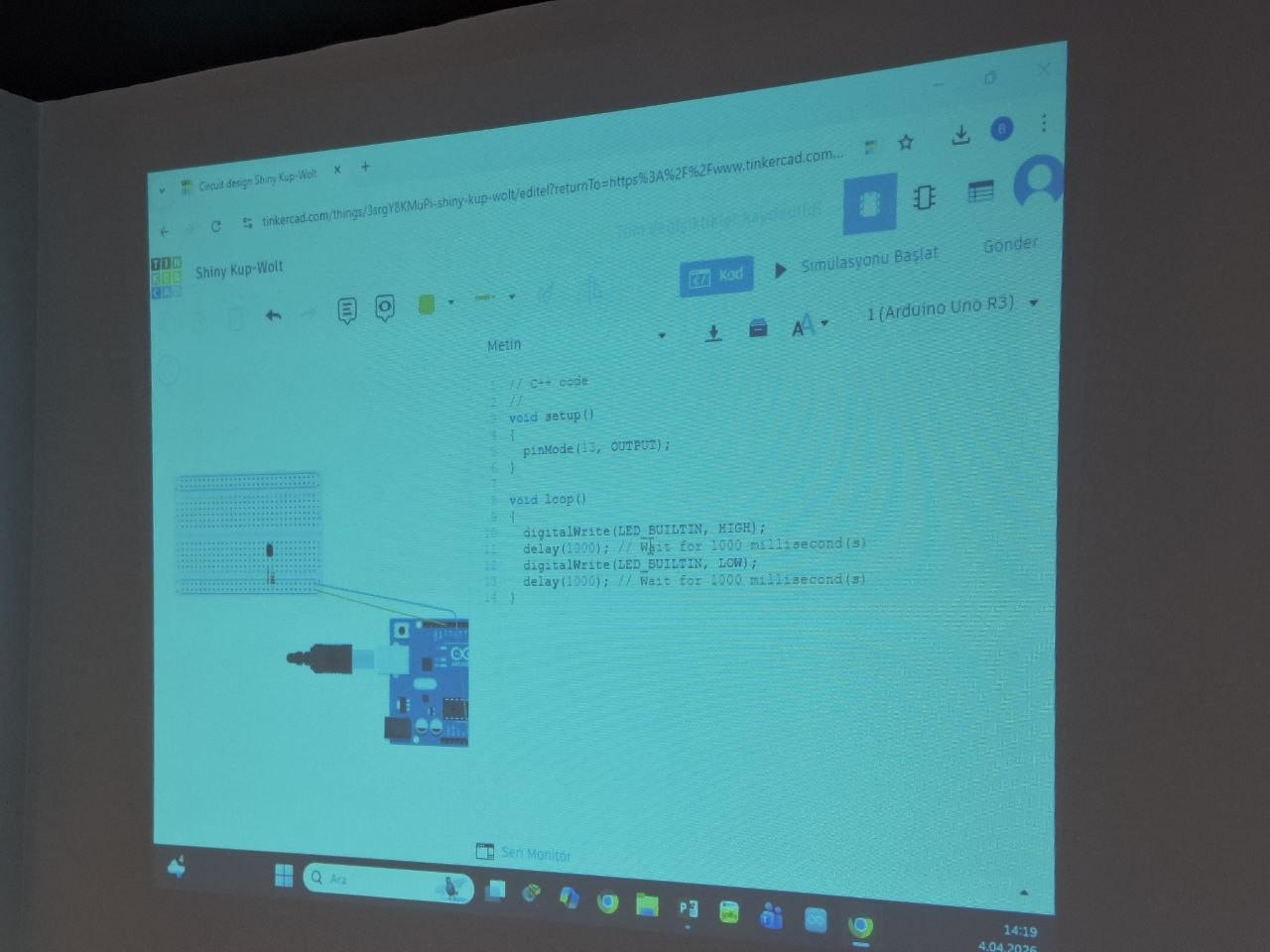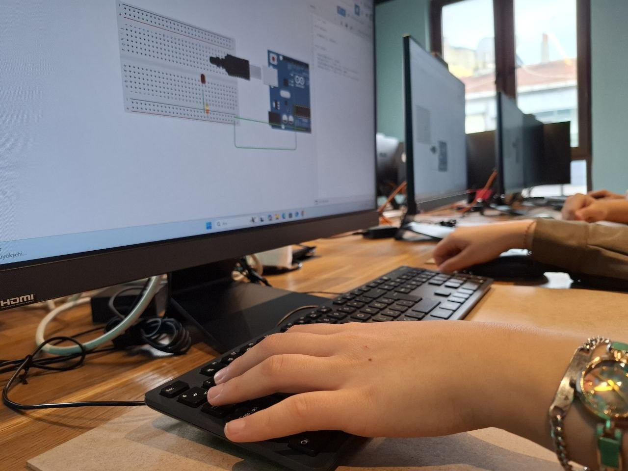 Program kapsamında katılımcılar, fiziksel donanım gereksinimi olmadan Tinkercad Circuits simülasyon platformu üzerinden devre kurma ve kod yazma uygulamaları gerçekleştirdi. Bu yöntem sayesinde öğrenciler, elektronik devre tasarımı ve kodlama süreçlerini güvenli bir dijital ortamda deneyimleme fırsatı buldu. Simülasyon tabanlı öğrenme yaklaşımı, katılımcıların deneme-yanılma yoluyla öğrenmesini desteklerken aynı zamanda projelerini kaydedip geliştirmelerine imkân tanıdı. Böylece öğrenciler, her ders sonunda elde ettikleri kazanımları bir sonraki aşamaya taşıyarak sistemli bir öğrenme sürecine dâhil oldu.