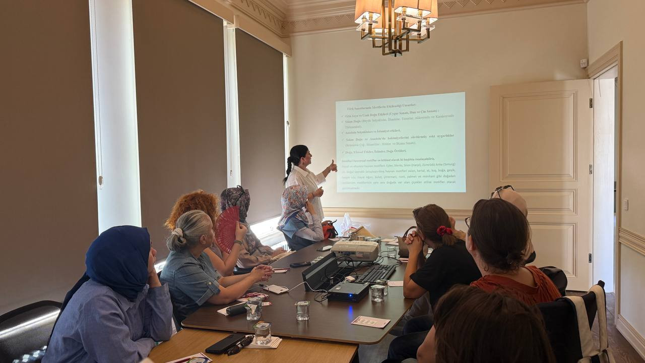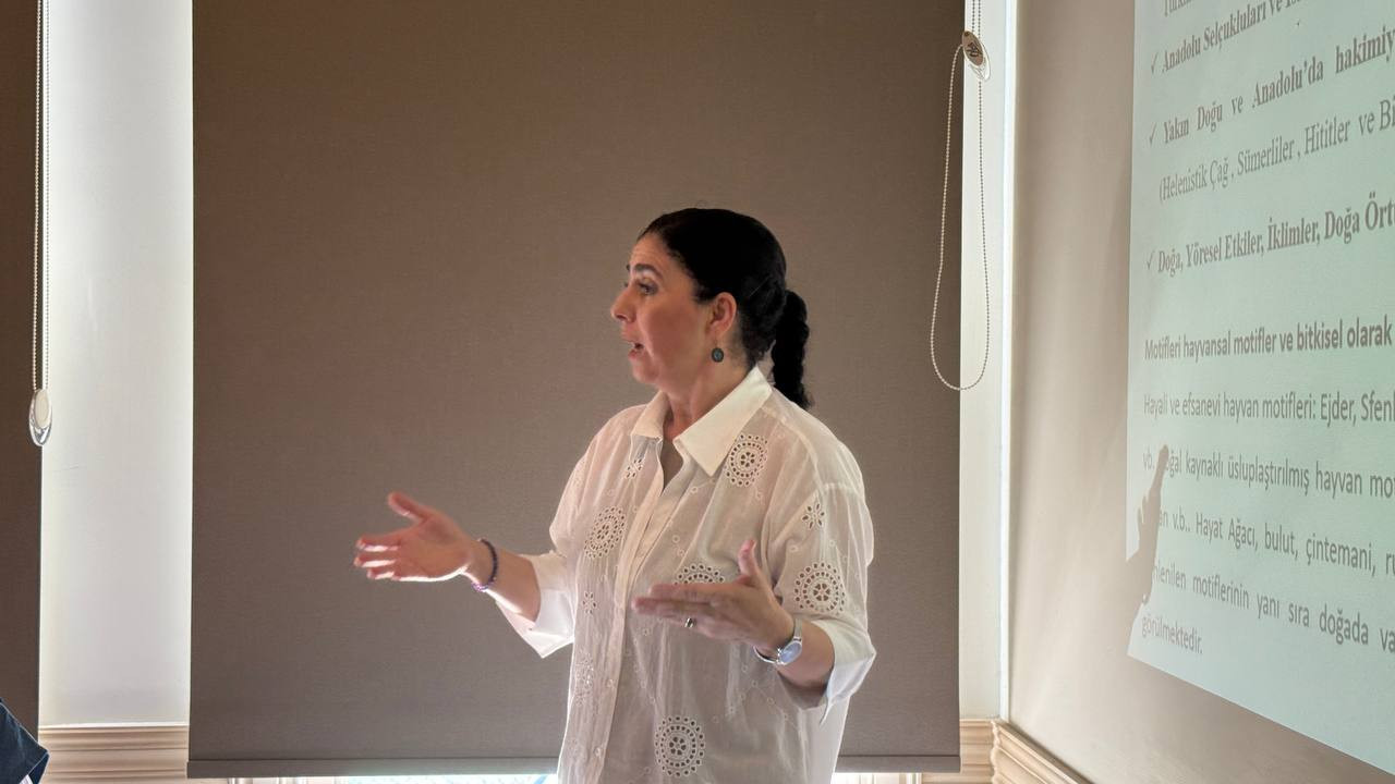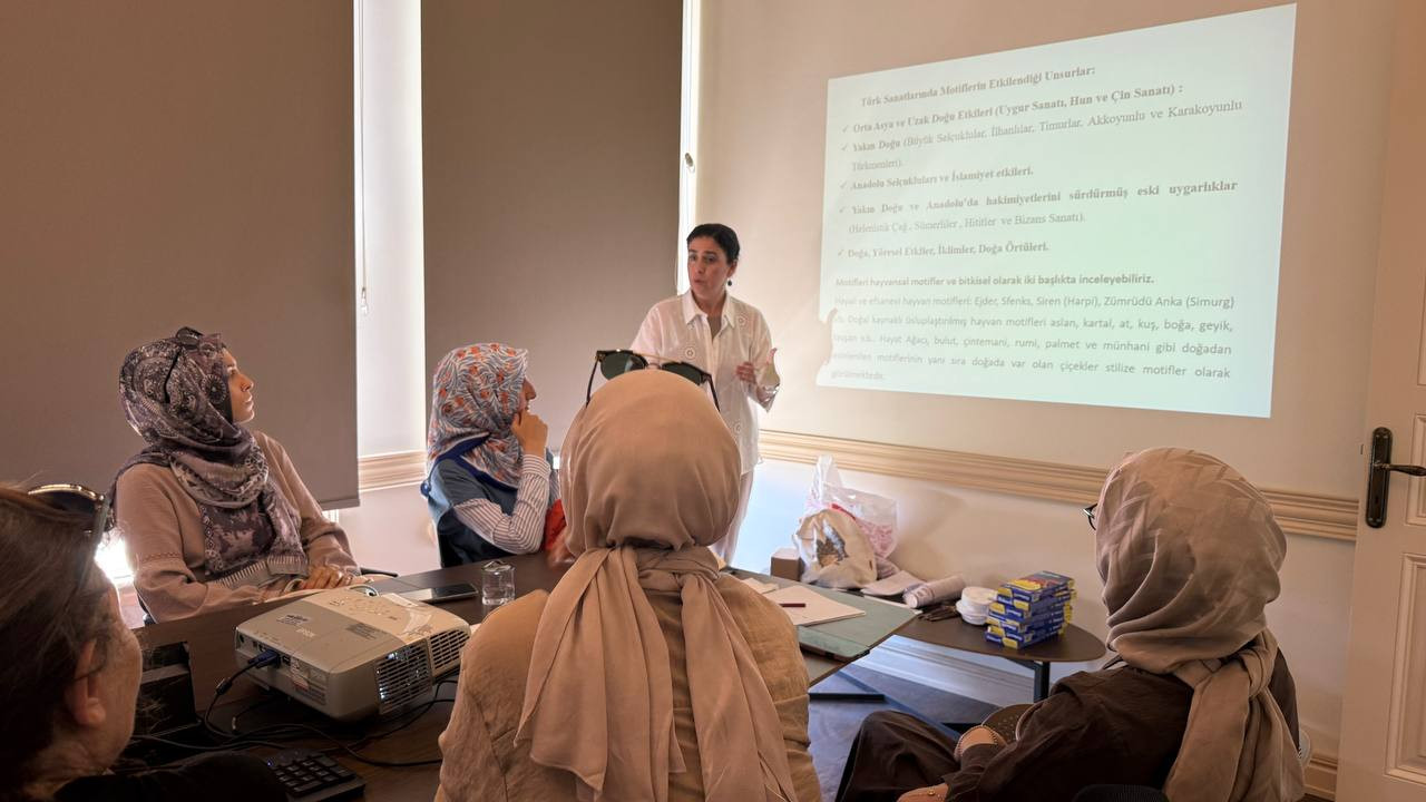 Yalnızca süsleme olarak görülen desenlerin aslında bir hafızayı, bir dili ve kimi zaman da kolektif bir kimliği taşıdığına dikkat çekilen etkinliğin ilk bölümünde motiflerin kökenleri, tarihî gelişimi ve medeniyetler arası geçiş süreçleri üzerine kapsamlı bir sohbet gerçekleştirildi. Katılımcılar Anadolu’dan Orta Asya’ya, Selçuklu’dan Osmanlı’ya uzanan kültürel çizgide motiflerin nasıl bir anlatı aracı olarak kullanıldığını dinledi. Sözlü kültürün, inançların ve toplumsal değerlerin desenlere nasıl yansıdığı; kimi motiflerin nasıl korunup kimi zaman dönüştüğü ve yeniden yorumlandığı da tartışılan başlıklar arasında yer aldı.