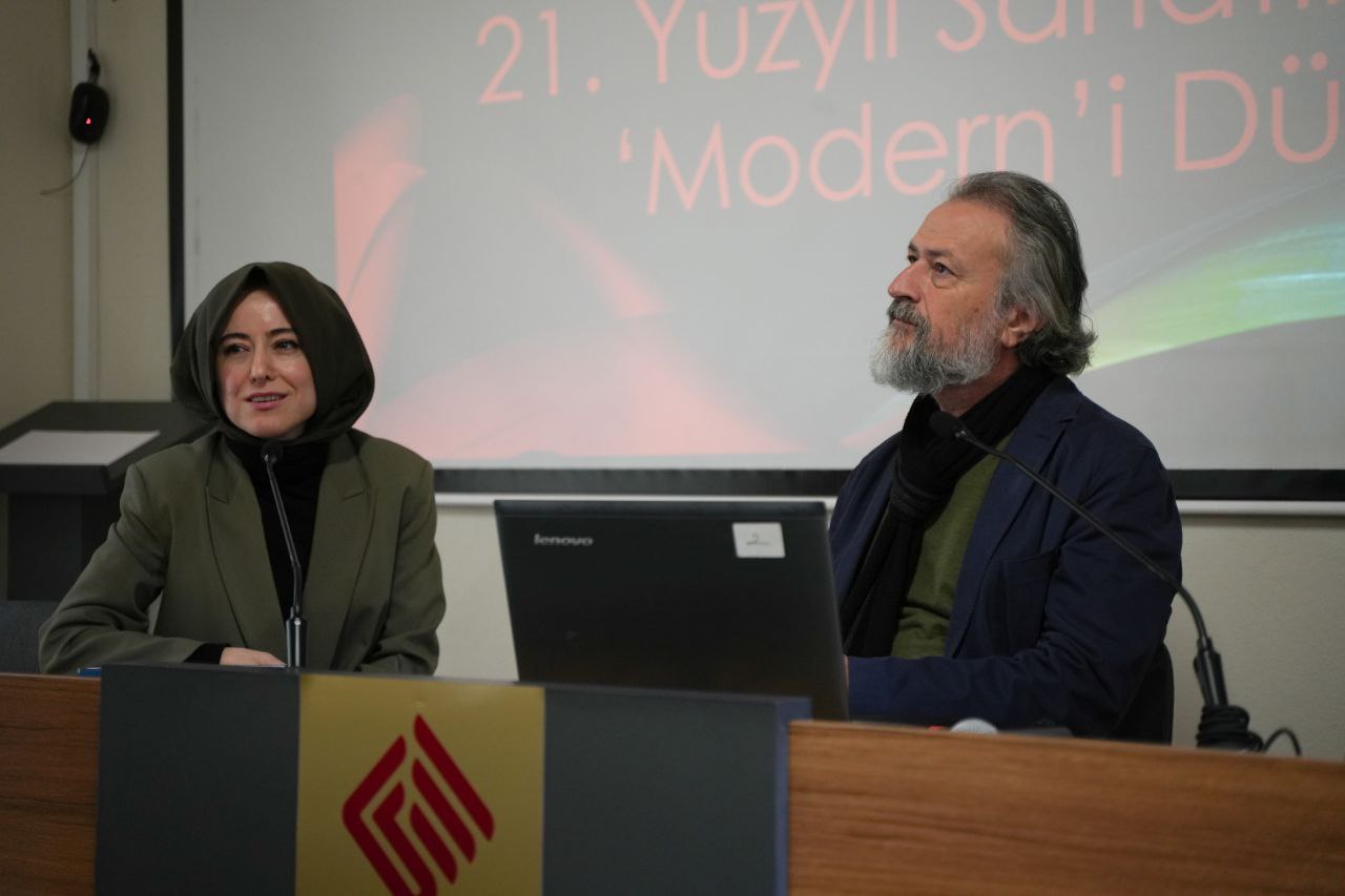 FSMVÜ Ayasofya Yerleşkesi'nde düzenlenen "Modern Sanata Ne Oldu?" başlıklı programda Doç. Dr. Oğuz Haşlakoğlu, 21. yüzyıl sanatındaki modern düşünceyi Dr. Öğr. Üyesi Emine Canlı'nın moderatörlüğünde ele aldı.