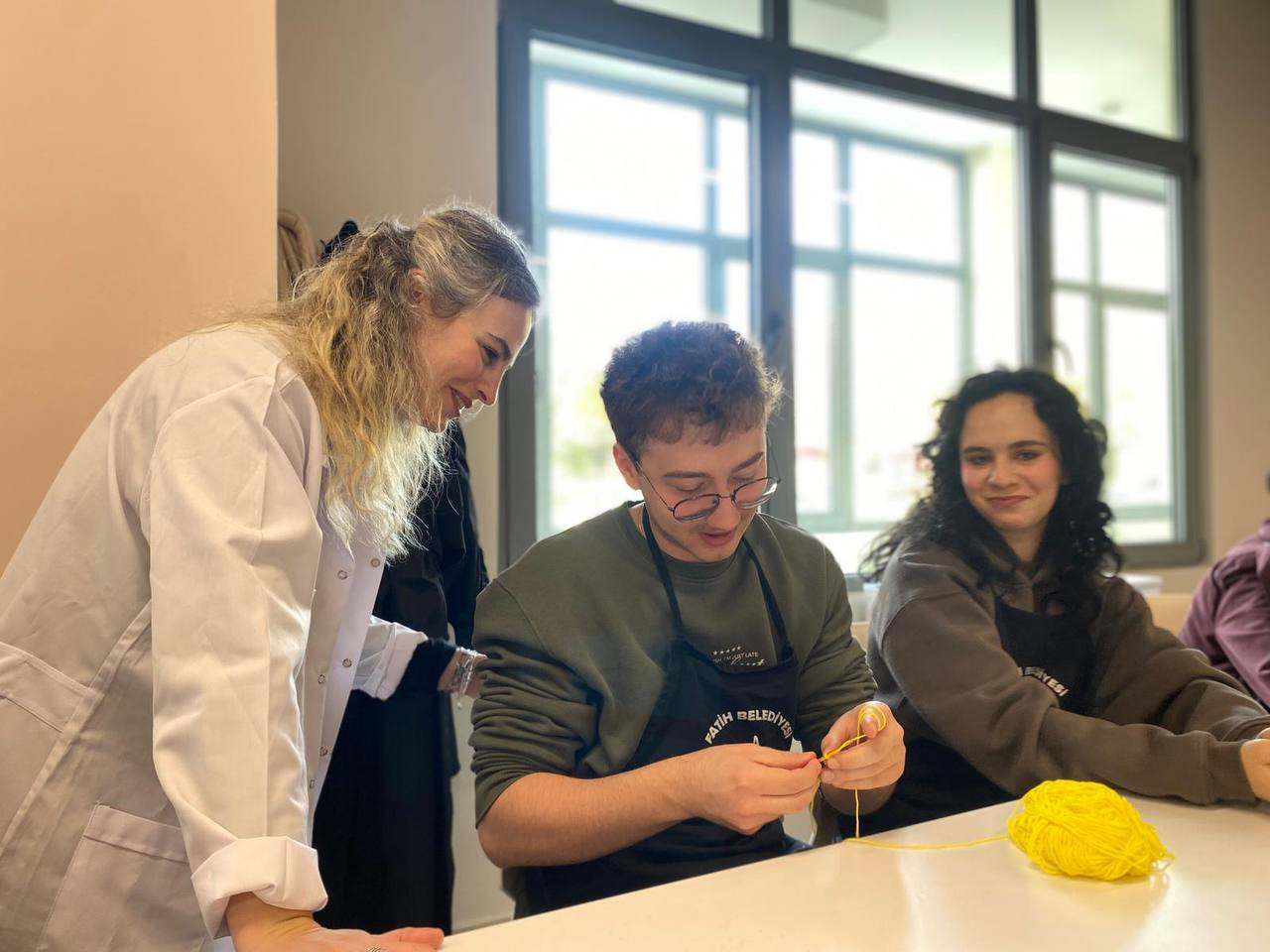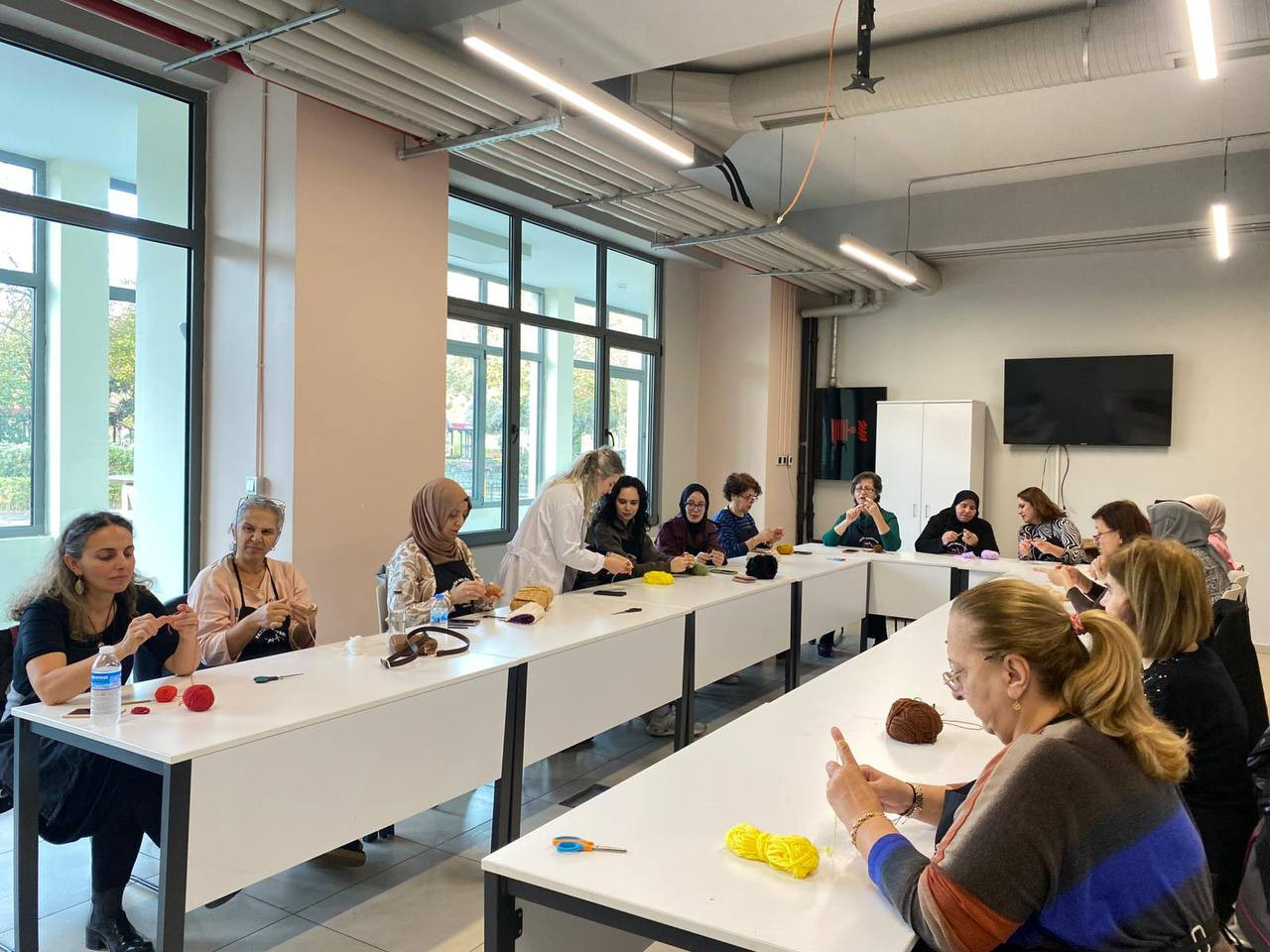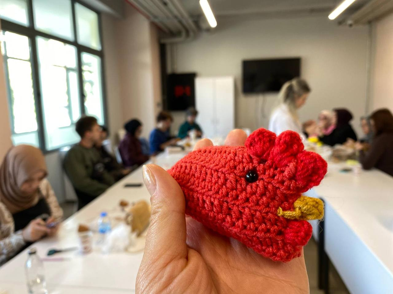 Atölyede hiç örgü bilmeyen katılımcılara yarım tırabzan, ikili tırabzan ve sık iğne teknikleri gösterilerek temel örgü bilgisi kazandırıldı. Katılımcılar öğrendikleri tekniklerle horoz desenli anahtarlık yapmayı öğrendi. Atölye, katılımcılar tarafından ilgiyle takip edildi.
