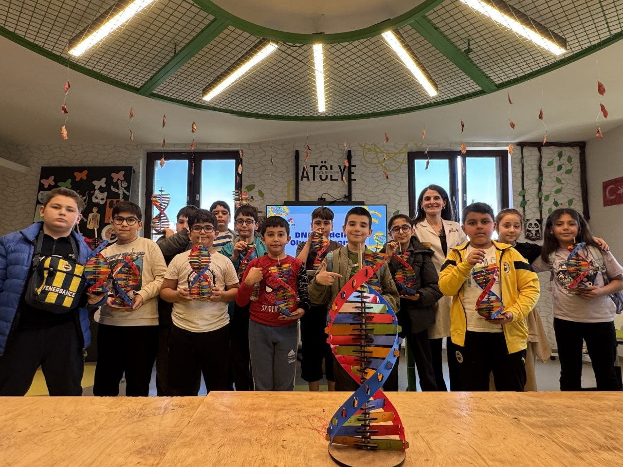 Programın ikinci bölümünde ise öğrenciler, öğrendikleri bilgileri uygulamaya aktararak üretim sürecine dahil oldu. DNA’nın çift sarmal yapısını modellemek amacıyla çeşitli materyaller kullanılarak gerçekleştirilen çalışmada, öğrenciler baz eşleşmelerini doğru şekilde kurgulayarak kendi DNA modellerini oluşturdu. Bu uygulama sayesinde öğrenciler, genetik yapının temel prensiplerini yalnızca teorik olarak değil, somut bir çalışma üzerinden deneyimleme fırsatı elde etti.
