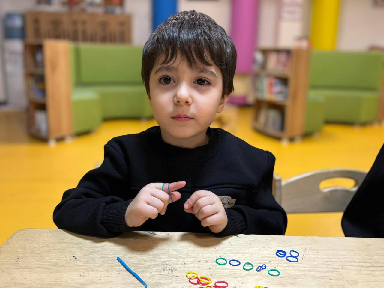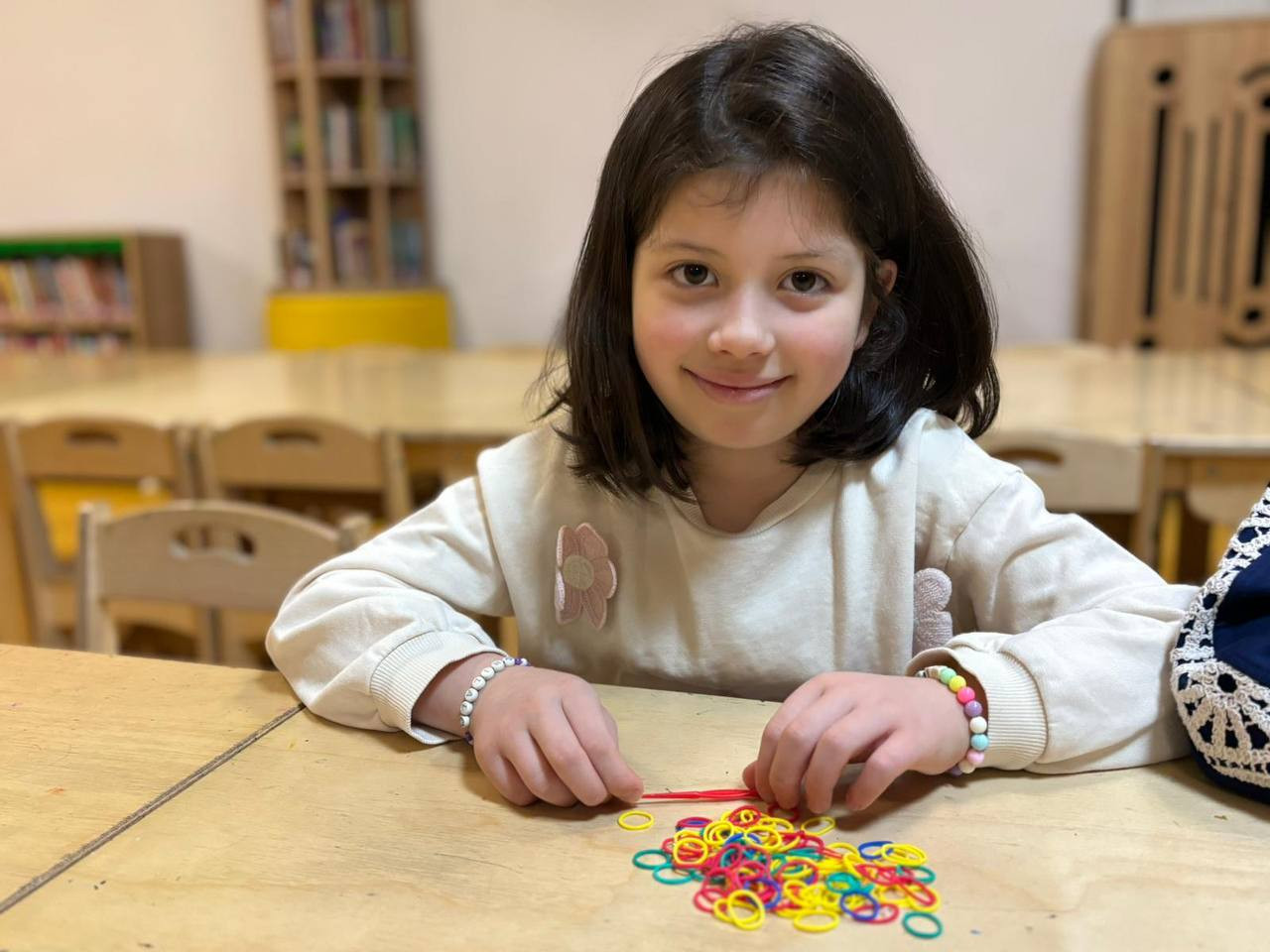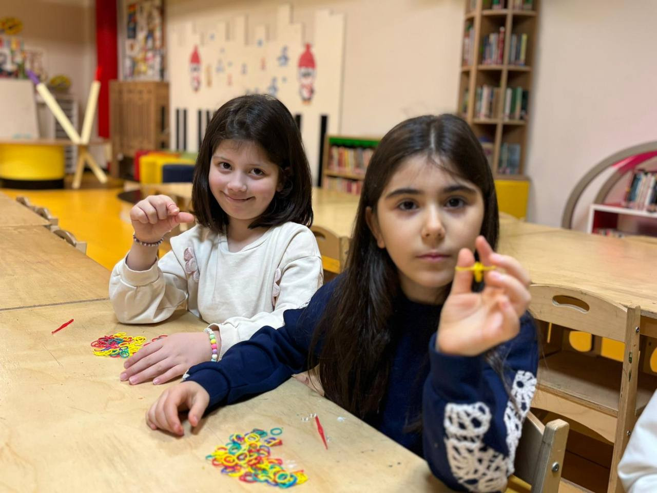 Renkli bileklik iplerinin çocukların ellerinde birer tasarıma dönüştüğü etkinlikte her çocuk kendi zevk ve tercihlerine göre malzemelerini seçerek bireysel bir tasarım sürecine katıldı. Kimi çocuk canlı renkleri tercih etti, kimi sade ve uyumlu tonlara yöneldi. Bazıları düğüm tekniklerini öğrenip uygularken bazıları renk geçişlerine odaklandı. Ortaya çıkan bileklikler sadece bir süs eşyası değil, çocukların el emeğiyle kurduğu kişisel bağın birer yansıması oldu.