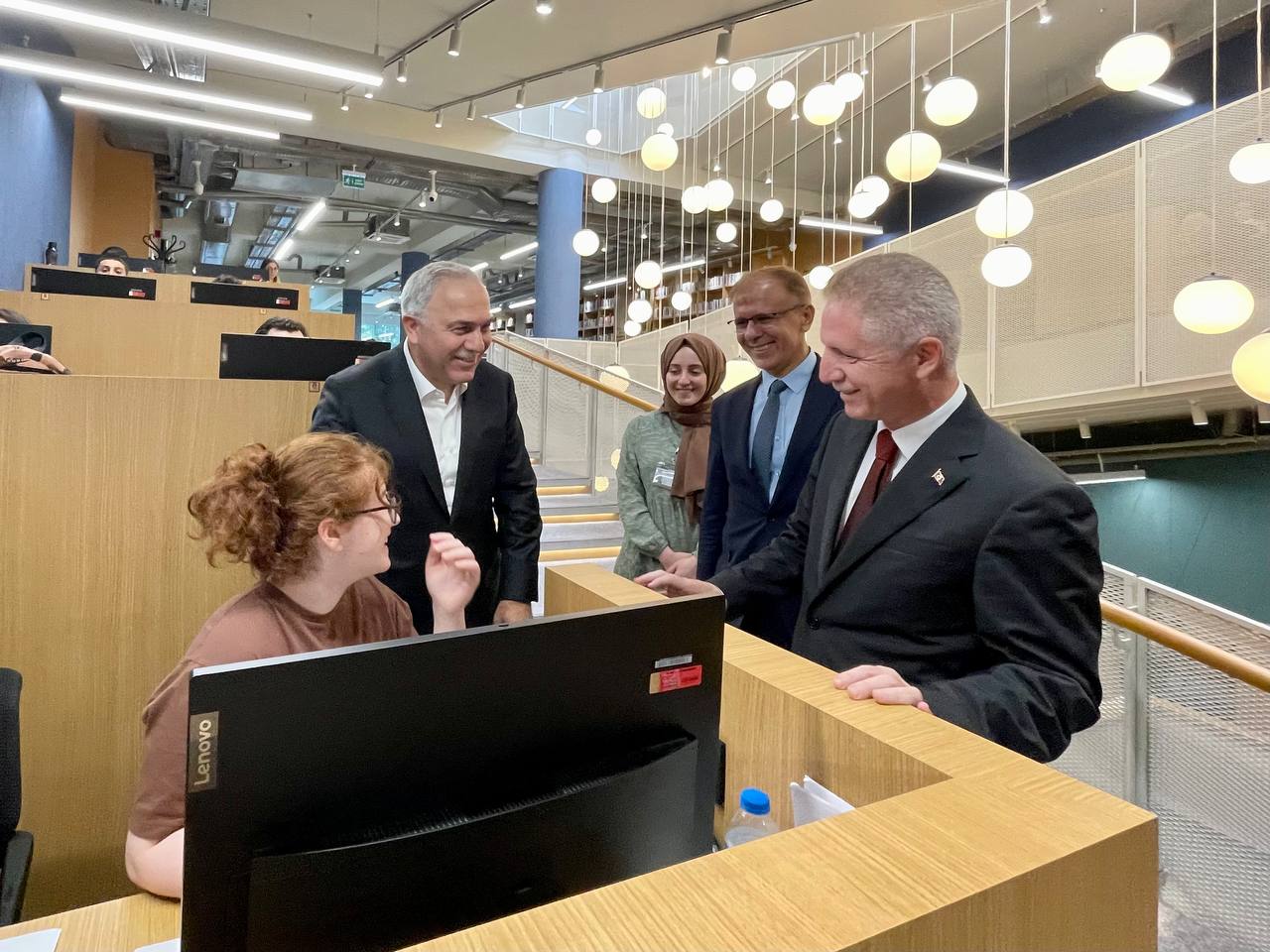 Fatih’in ilçesinin gurur kaynaklarından biri olan Vatan Kütüphanesini ziyaret eden M. Ergün Turan ve beraberindekiler, kütüphanenin modern tasarımını ve zengin koleksiyonunu hayranlıkla inceledi. Bilgiye erişimi teşvik etmek, okuma kültürünü yaymak ve toplumun entelektüel gelişimine katkıda bulunmak için önemli bir merkez haline gelen Vatan Kütüphanesi'nde çalışan öğrenciler, Vali Gül'ü ve Başkan Turan'ı karşılarında görünce memnuniyetlerini dile getirdiler.