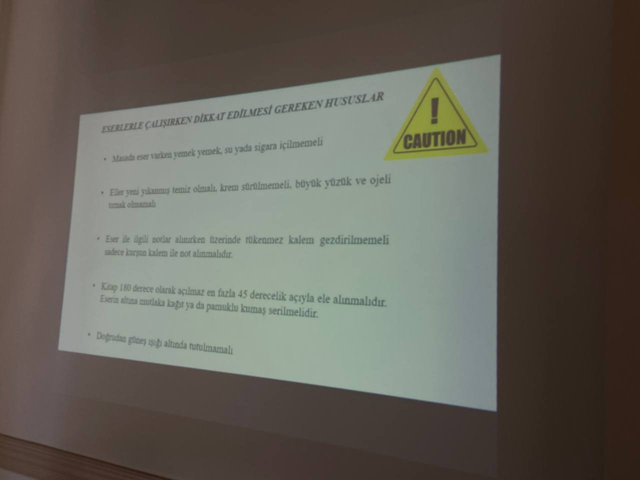 Kağıt belgelerin korunması ve restorasyonu konularına odaklanan etkinlikte öncelikle kağıt belgelerin tanımı ve taşıdıkları kültürel değerler ele alındı. Uzmanların rehberliğinde gerçekleştirilen slayt gösterisi ile kağıt belgelerde sıkça karşılaşılan tahribat türleri örnekler üzerinden detaylıca açıklandı. Her bir tahribat çeşidinin nedenleri ve nasıl önlenebileceği görseller eşliğinde katılımcılara aktarıldı. Bunun yanı sıra kitapların nasıl saklanması gerektiği, temizleme işlemlerinin doğru yöntemleri ve kullanılan malzemeler hakkında da kapsamlı bir bilgilendirme yapıldı.