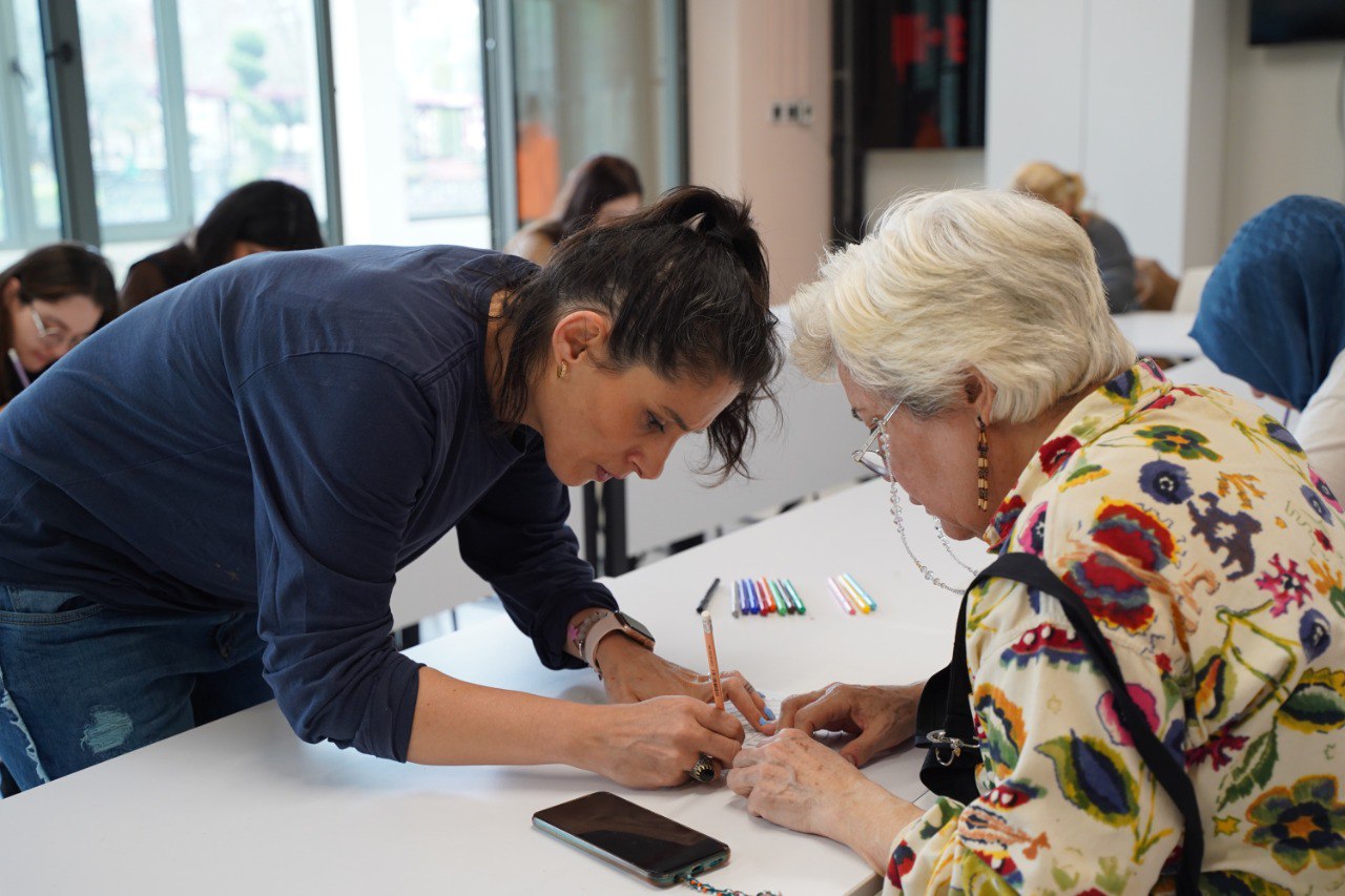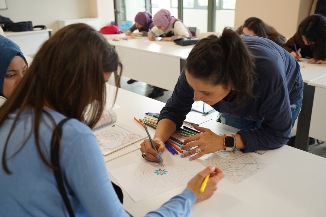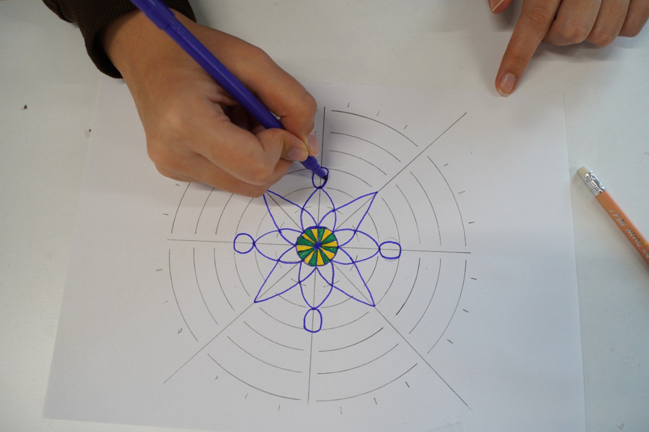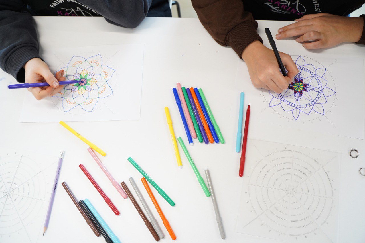 Fındıkzade KARINCA Eğitim Birimi tarafından düzenlenen Mandala Atölyesi’nde katılımcılar örnek şablonlar kullanarak mandala desenlerini oluşturuyorlar.