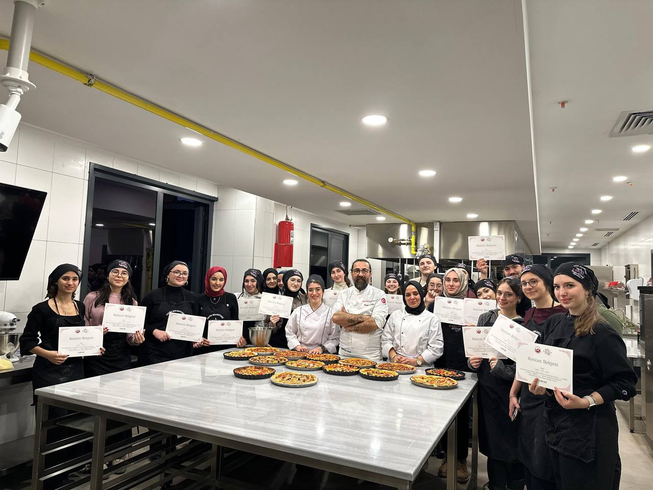 Hamurun hazır hale gelmesinin ardından pizzanın lezzetini belirleyen en önemli unsurlardan biri olan domates sosunun yapımına geçildi. Taze domateslerden hazırlanan sosun kıvamının nasıl olması gerektiği, baharatların dengeli kullanımı ve sosun pizzaya uygulanma şekli detaylandırıldı. Malzeme seçiminde ise peynir, sebze ve et ürünlerinin tazeliği, kesim teknikleri ve pizzaya dengeli şekilde yerleştirilmesi gibi konular üzerinde duruldu. Katılımcılar öğrendikleri bilgileri pratiğe dökerek kendi pizzalarını hazırladı.