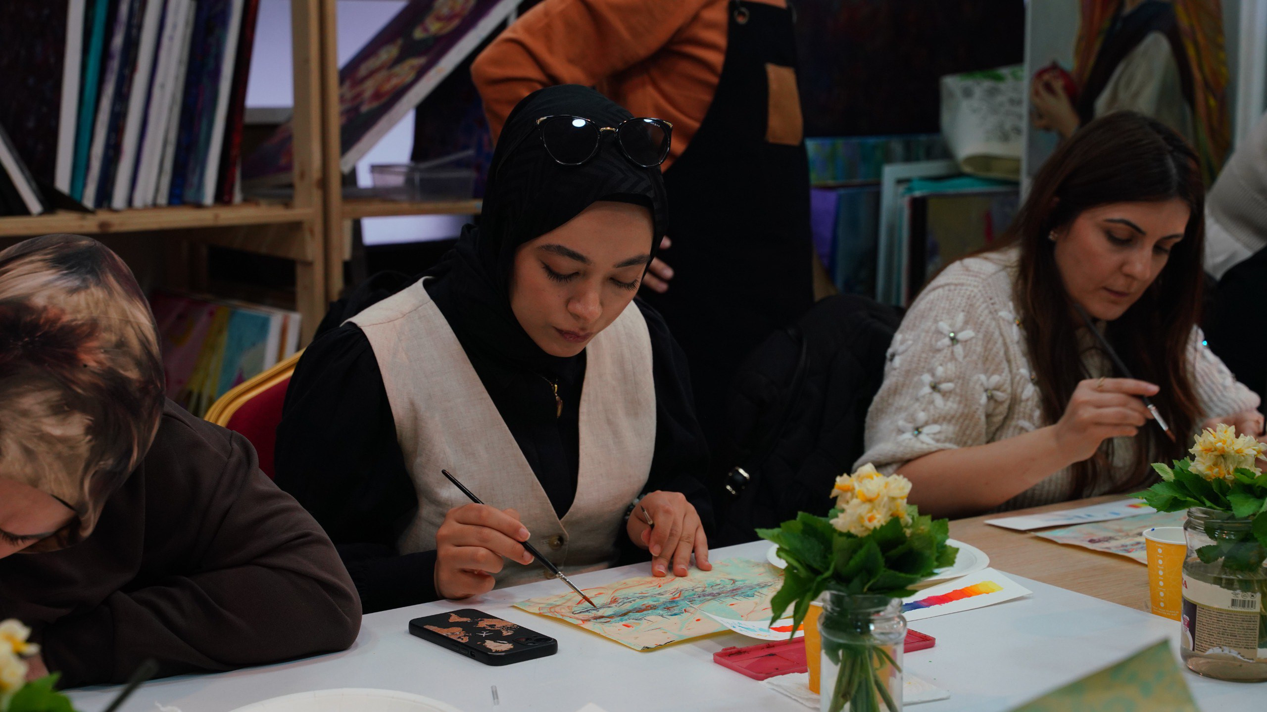 Zemin hazırlıklarının tamamlanmasının ardından çalışmaların ikinci aşamasına geçildi. Kuruyan ebru yüzeyleri üzerine ince fırça kullanılarak İstanbul silüeti çizimleri gerçekleştirildi. Bu aşamada katılımcılar, çizgi kontrolü, oran, denge ve kompozisyon bütünlüğü gibi temel sanatsal ilkeleri uygulamalı olarak deneyimledi. İstanbul’un camileri, kubbeleri, minareleri ve tarihî yapılarından oluşan silüetler, ebru yüzeyinin doğal dokusuyla bütünleşerek her katılımcının kendi yorumunu yansıtan özgün kompozisyonlara dönüştü.