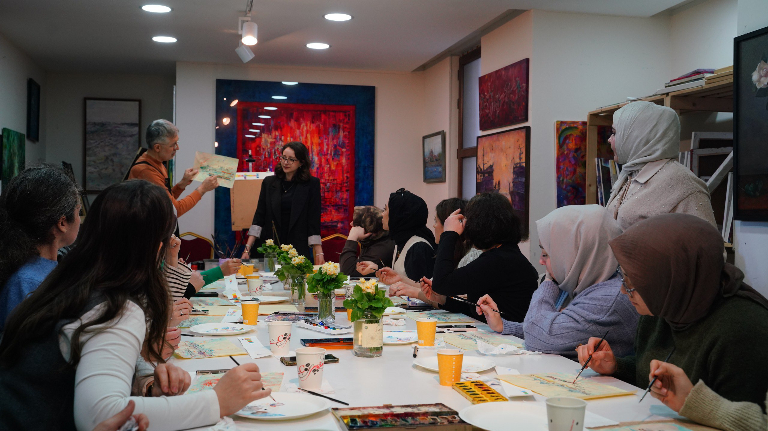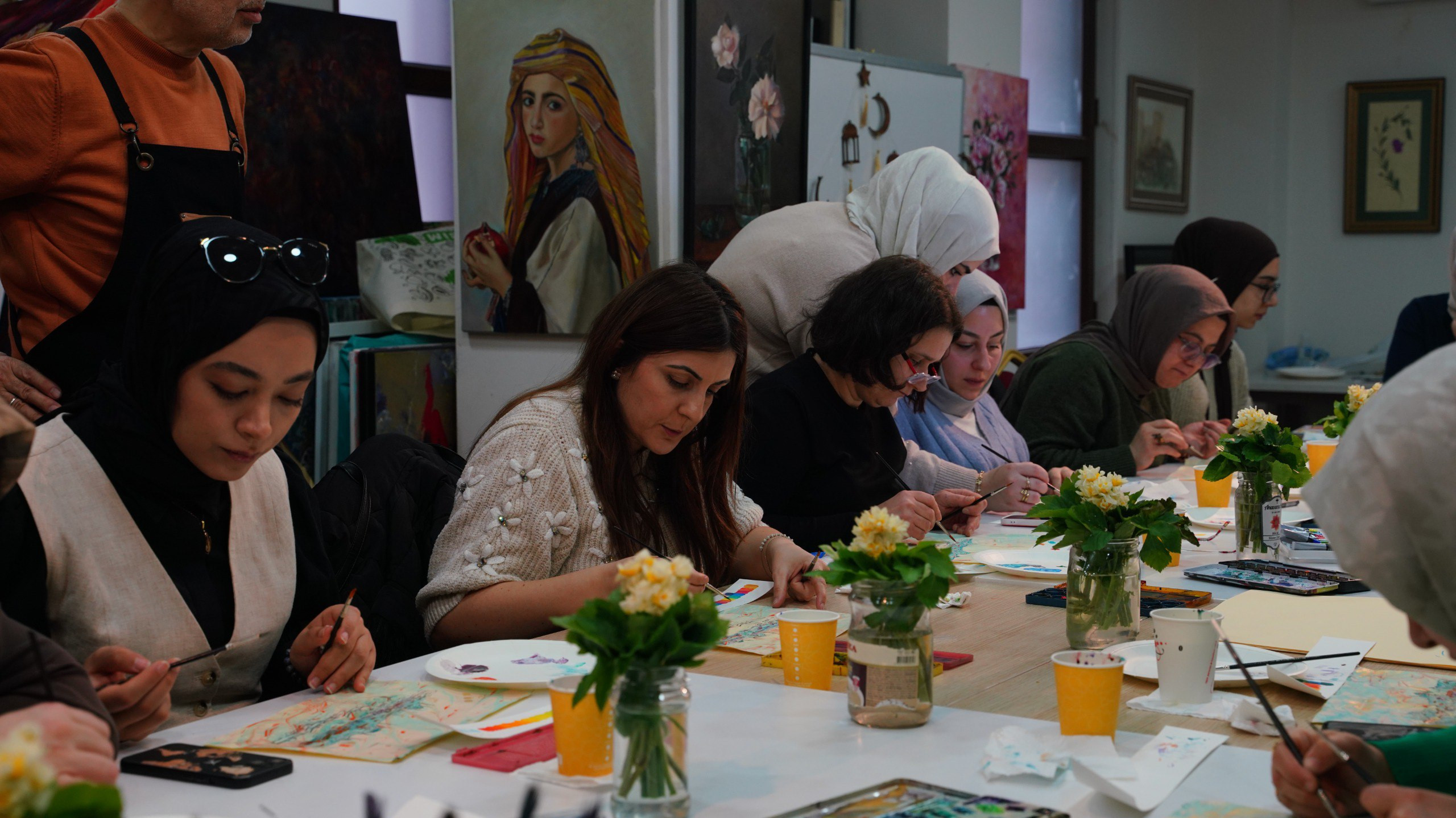 Fatih Belediyesi KARINCA El Emeği Eğitim Birimi’ne bağlı Ayvansaray Eğitim Birimi’nde gerçekleştirilen uygulamada, geleneksel ebru sanatının teknik birikimi ile İstanbul’un tarihî kimliği aynı yüzeyde buluştu. Ressam Cemal Toy ve Ebru hocası Rabia Karatay’ın rehberliğinde yürütülen çalışmada, katılımcılar ebru sanatının temel tekniklerini uygulamalı olarak öğrenirken, bu teknikleri İstanbul silüetiyle bütünleştirerek özgün çalışmalar ortaya koydu.