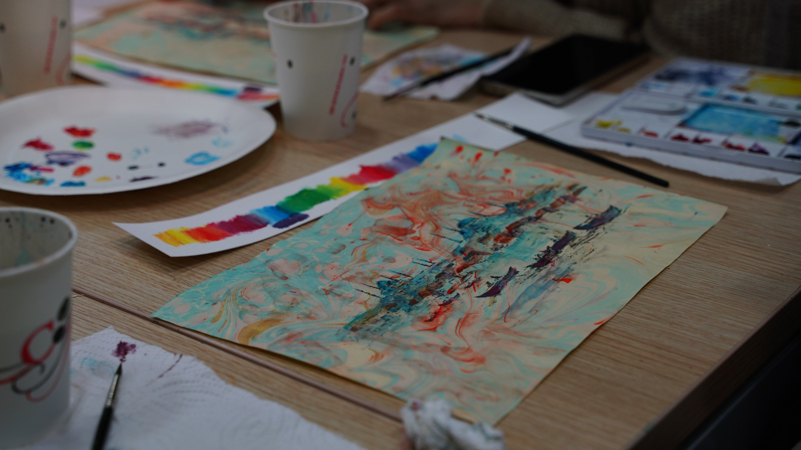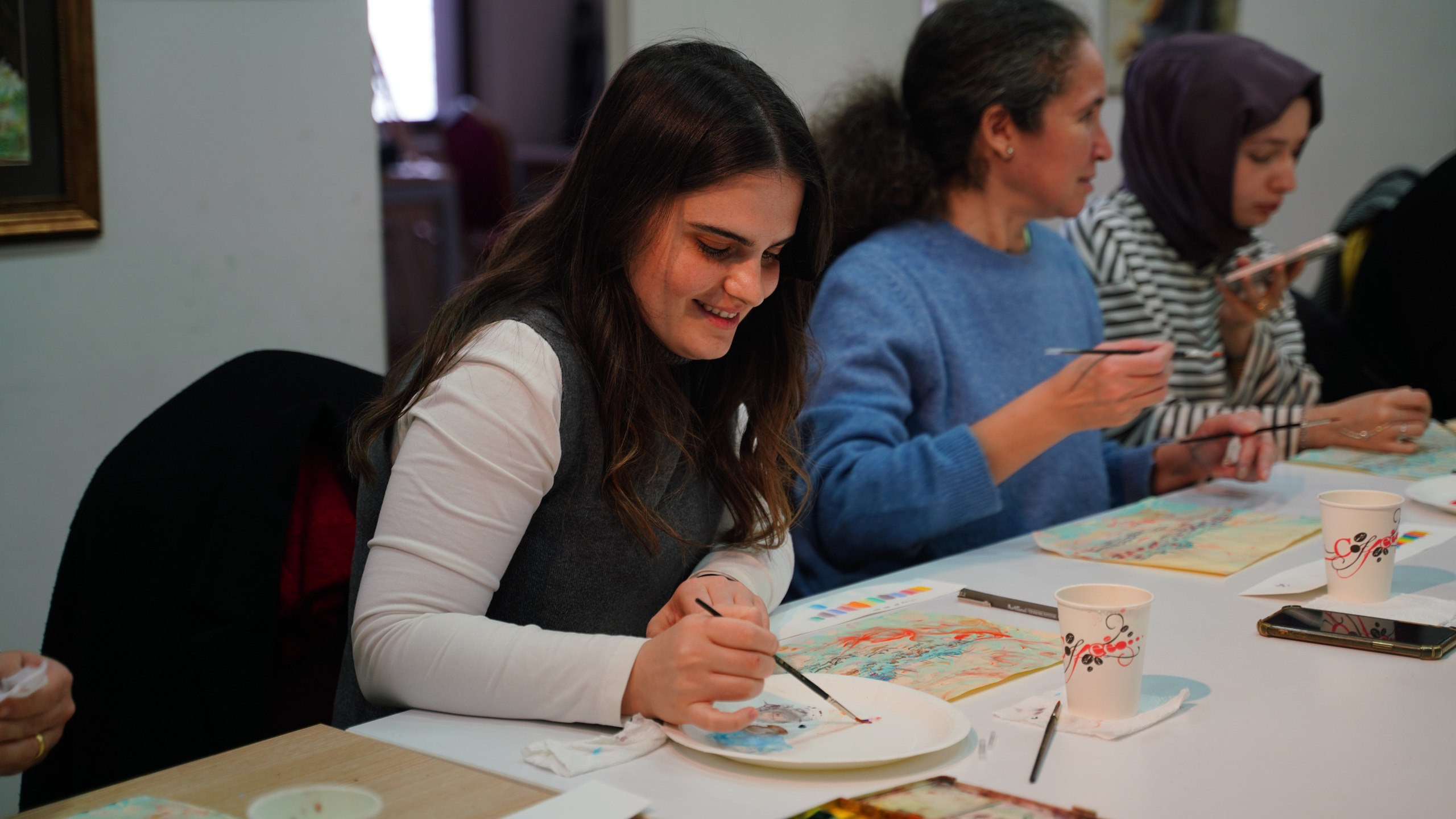 Ebru sanatının temelinde yer alan sabır, dikkat ve denge unsurları, uygulama sürecinin her aşamasında belirleyici rol oynadı. Katılımcılar, suyun yüzeyinde oluşan desenlerin kontrol edilebilir ve aynı zamanda özgür yapısını deneyimleyerek, geleneksel sanatların üretim mantığını doğrudan gözlemleme fırsatı buldu. Her bir ebru zemini, suyun akışıyla şekillenen ve tekrar edilemeyen özgün bir yüzey niteliği taşıdı.