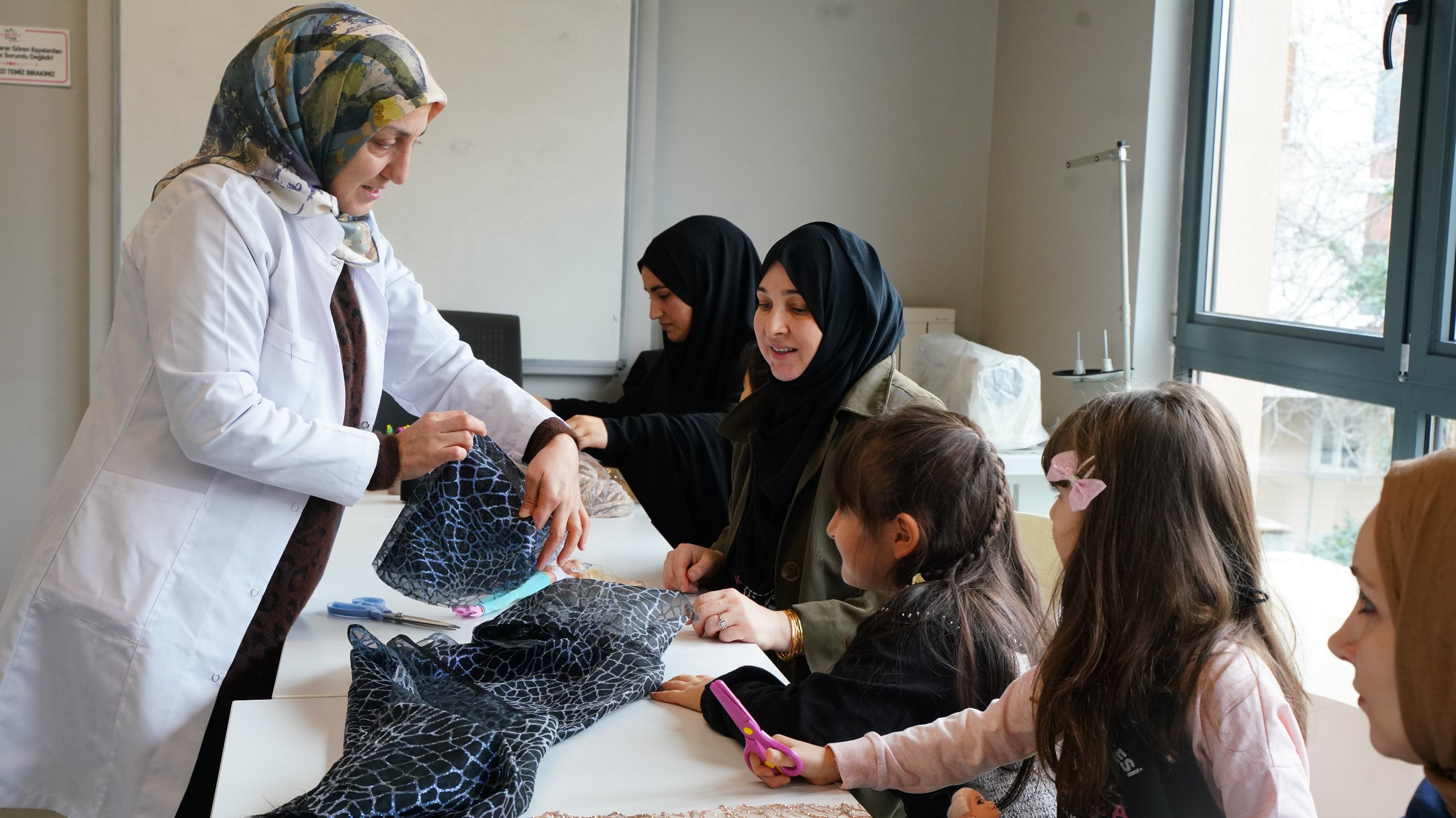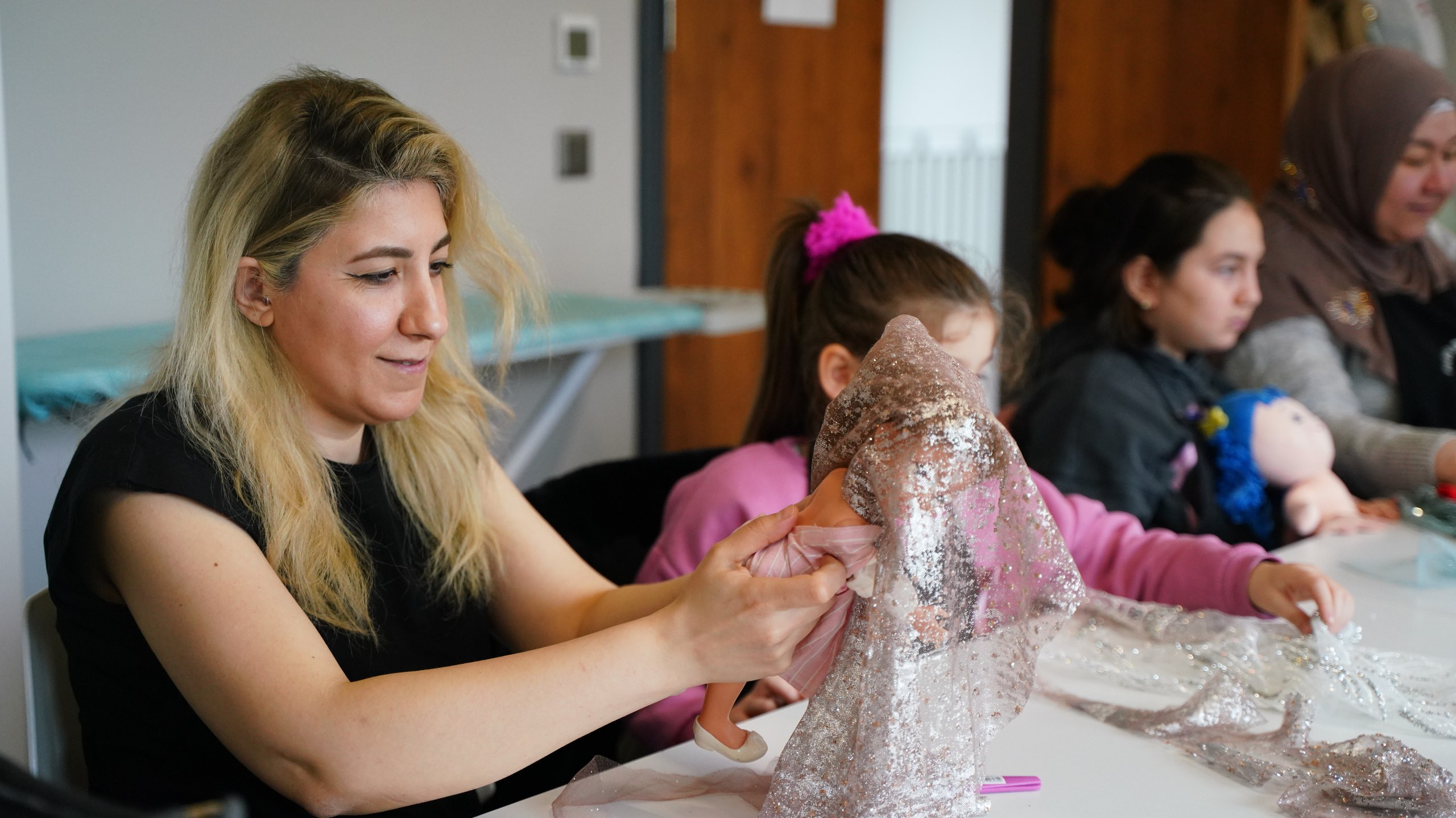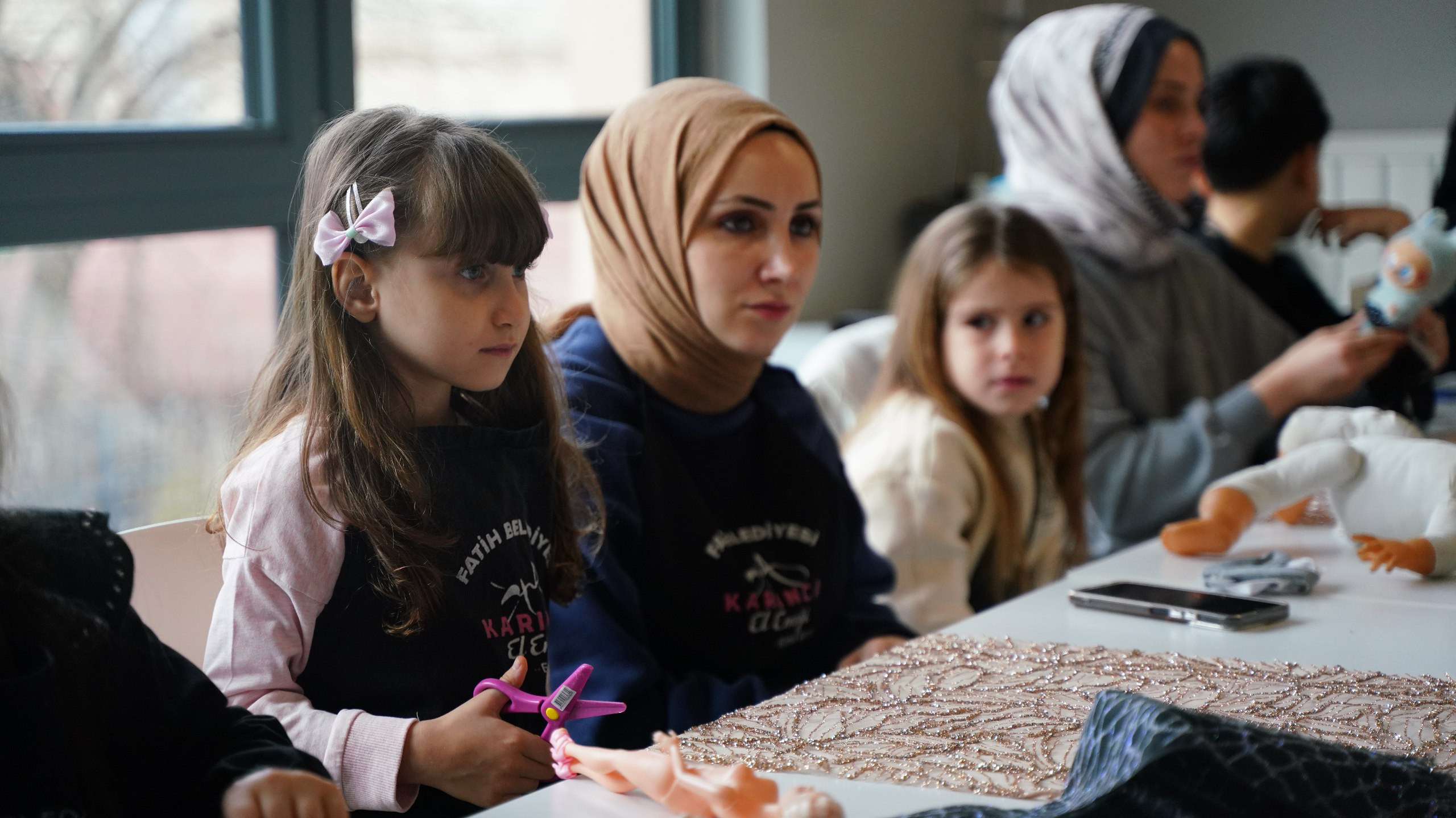 Fatih Belediyesi’nin katkılarıyla Ara Tatil boyunca düzenlenen bu çalışmada anneler ve çocukları, oyuncak bebeklerine el yapımı kıyafetler dikerek hem el becerilerini geliştiriyor hem de birlikte nitelikli zaman geçiriyor. Katılımcılar kumaş seçimi, dikim teknikleri ve süsleme yöntemleriyle yaratıcılıklarını ortaya koyma fırsatı buluyor. Anneler çocuklarıyla beraber çalışarak sürece eşlik ediyor.