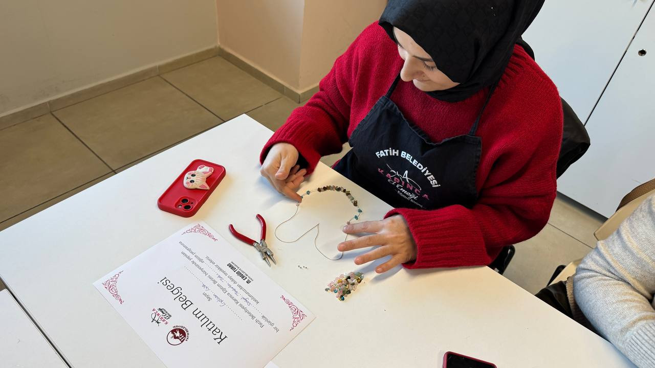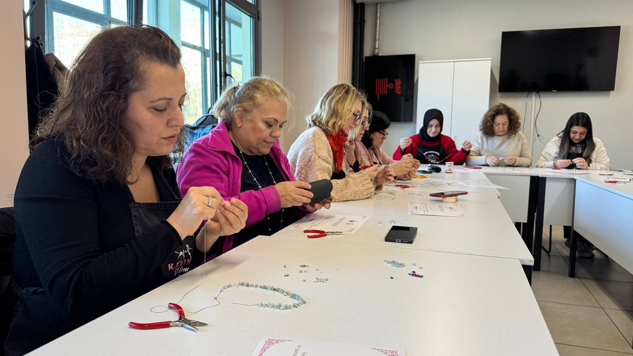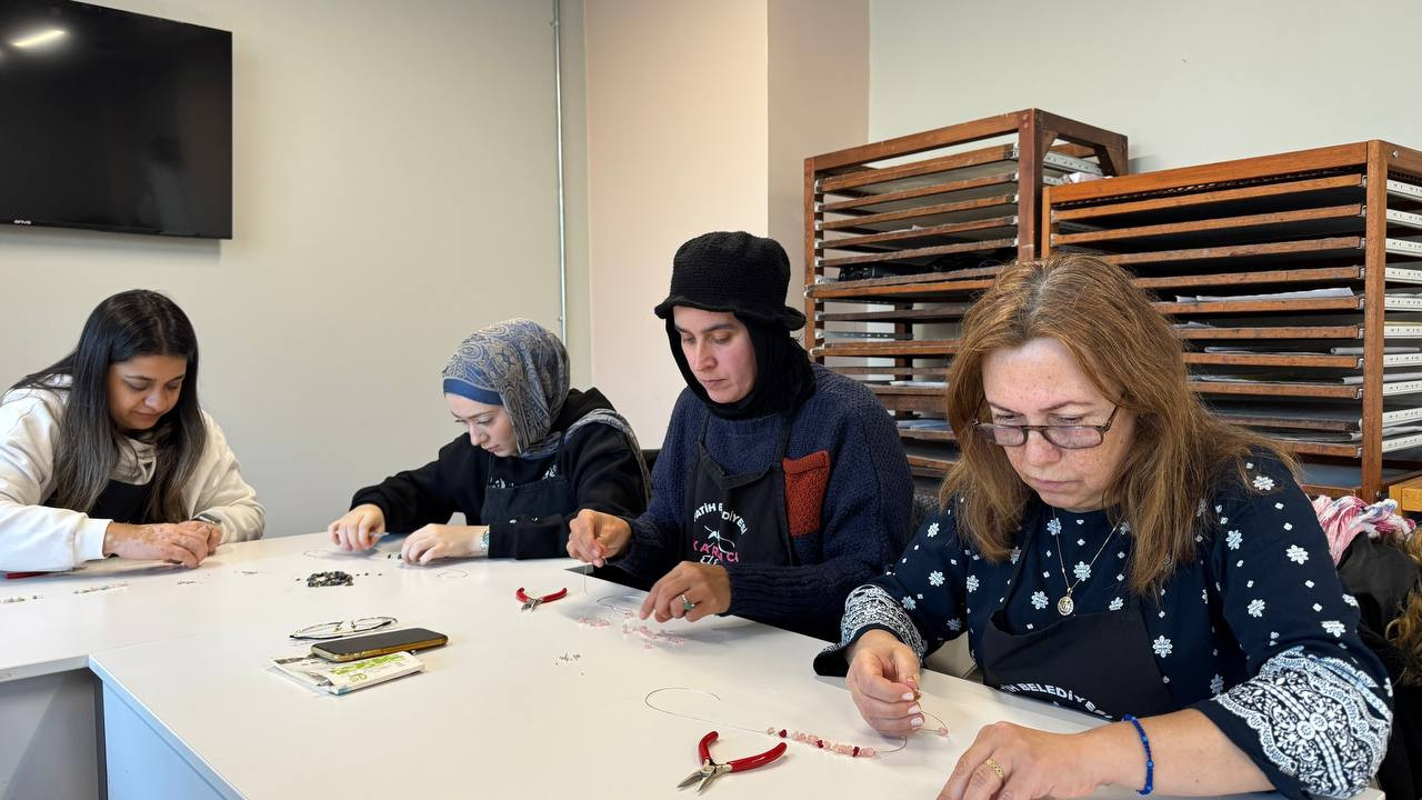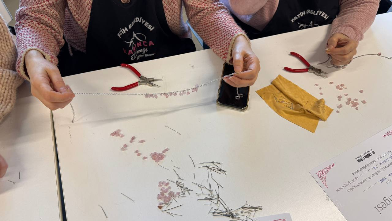 Fatih Belediyesi’nin kadınlara yönelik mahalle temelli eğitim ve üretim programlarını yürüten KARINCA El Emeği Eğitim Birimi, Fındıkzade Eğitim Birimi’nde gerçekleştirdiği “Doğal Taşlarla Takı Tasarımı” başlıklı çalışmayla bir kez daha üretimin birleştirici yönünü öne çıkardı. Kadınlara yönelik olarak düzenlenen bu eğitim programında takı yapımının hem teknik boyutuna hem de estetik ve kişisel tercihleri yansıtan yaratıcı yönüne odaklanıldı.