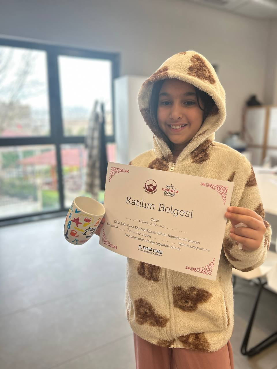 Boyama işlemi tamamlanan kupaların, ev ortamında 200 derecede 20 dakika pişirilerek kalıcı hâle getirilebileceği bilgisi katılımcılarla paylaşıldı. Bu sayede çocuklar, kendi emekleriyle hazırladıkları ürünleri uzun süre kullanma imkânı buldu.