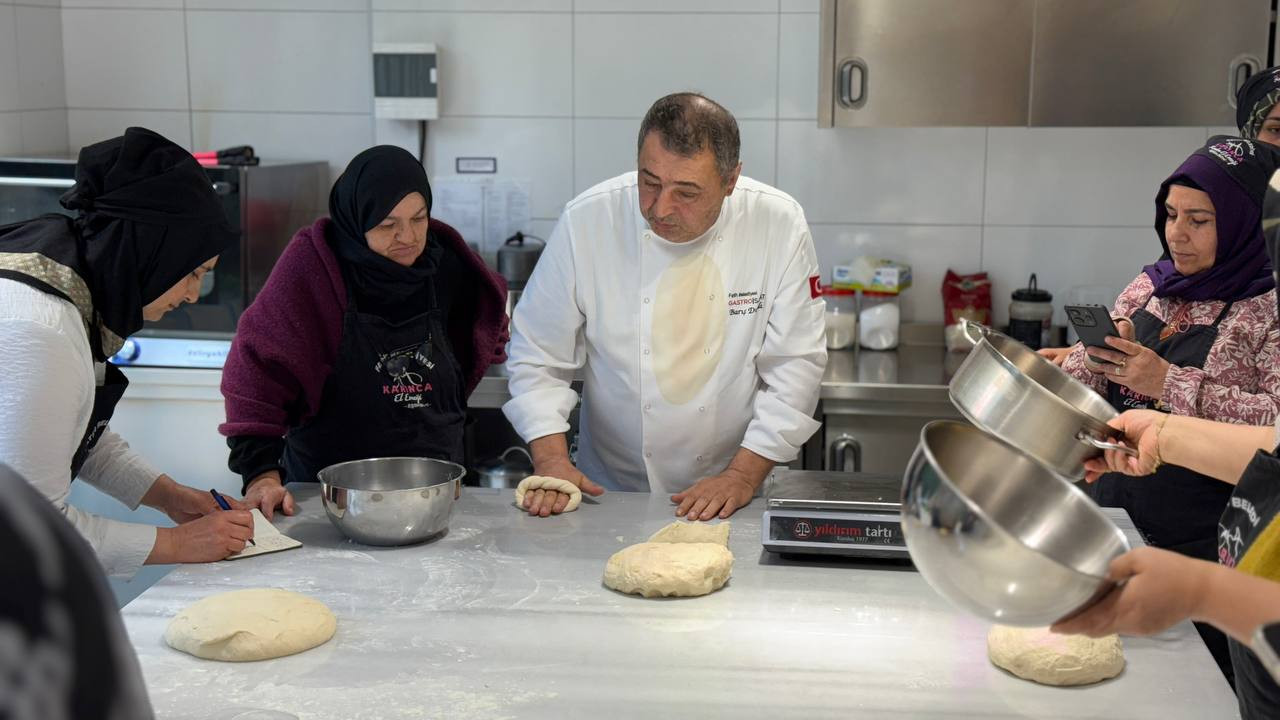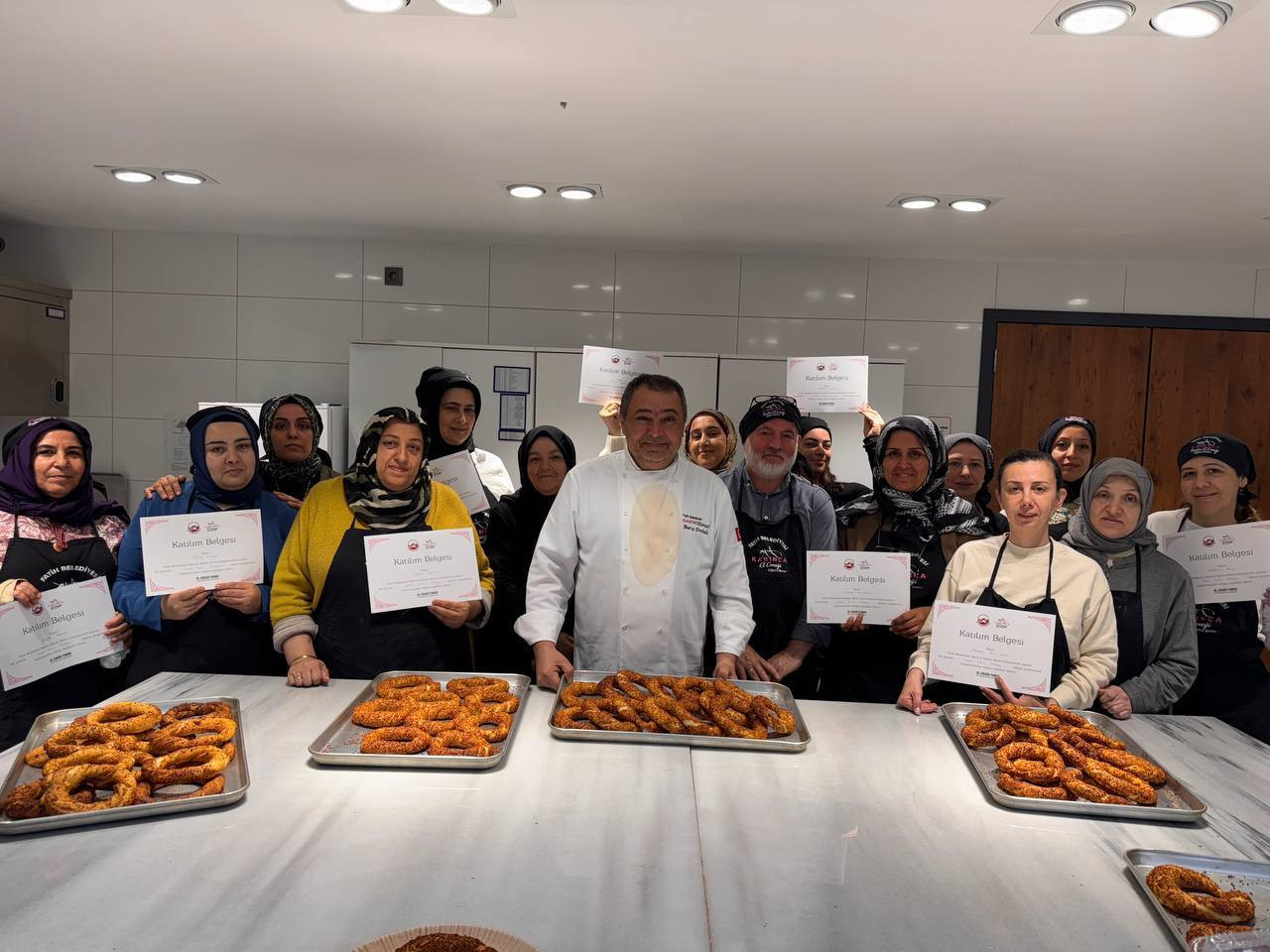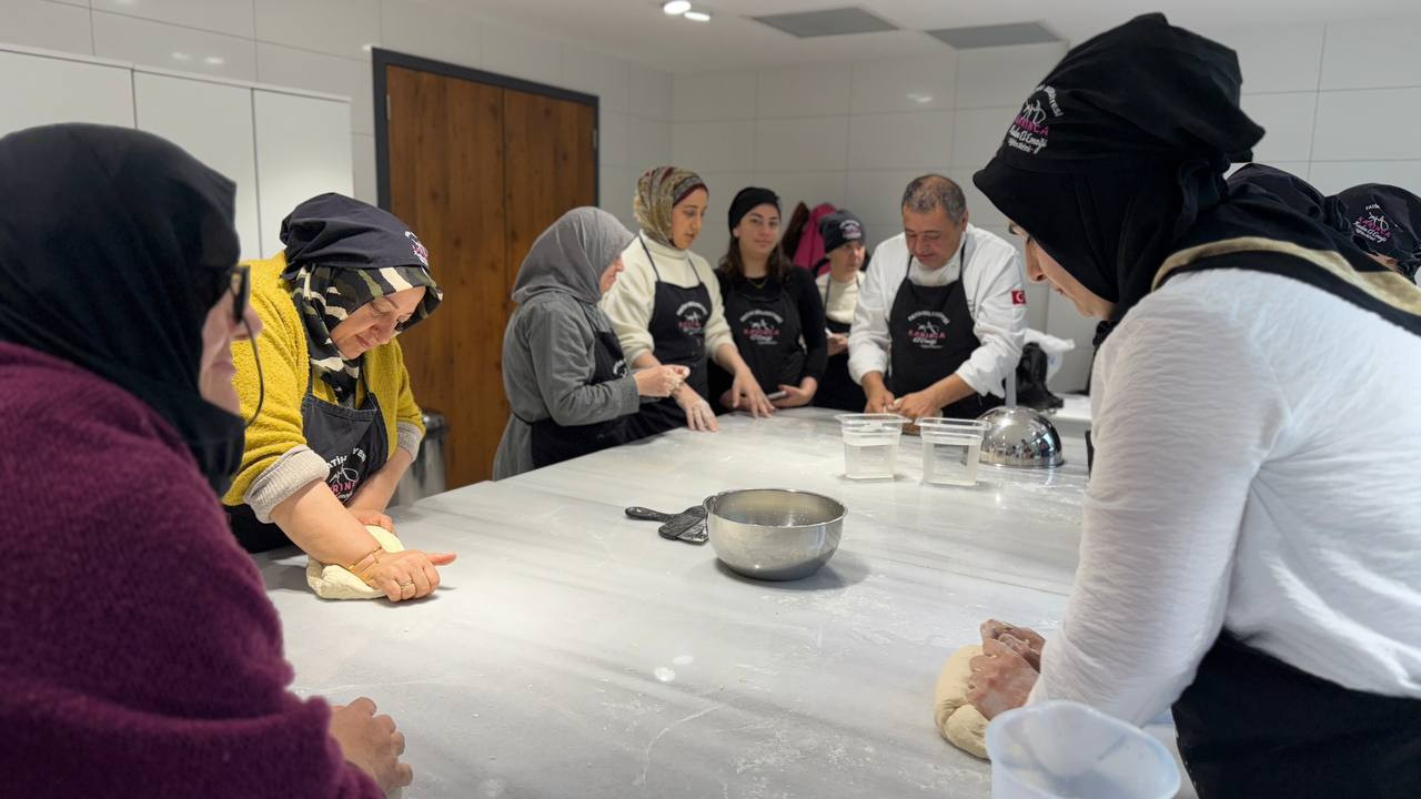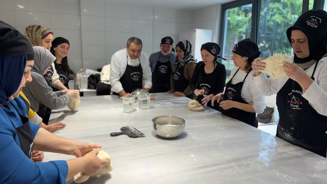 Ayrıca simidin düzgün şekillendirilmesinin pişirme sürecindeki etkisi ve fırınlama teknikleri katılımcılara detaylı şekilde gösteriliyor.
