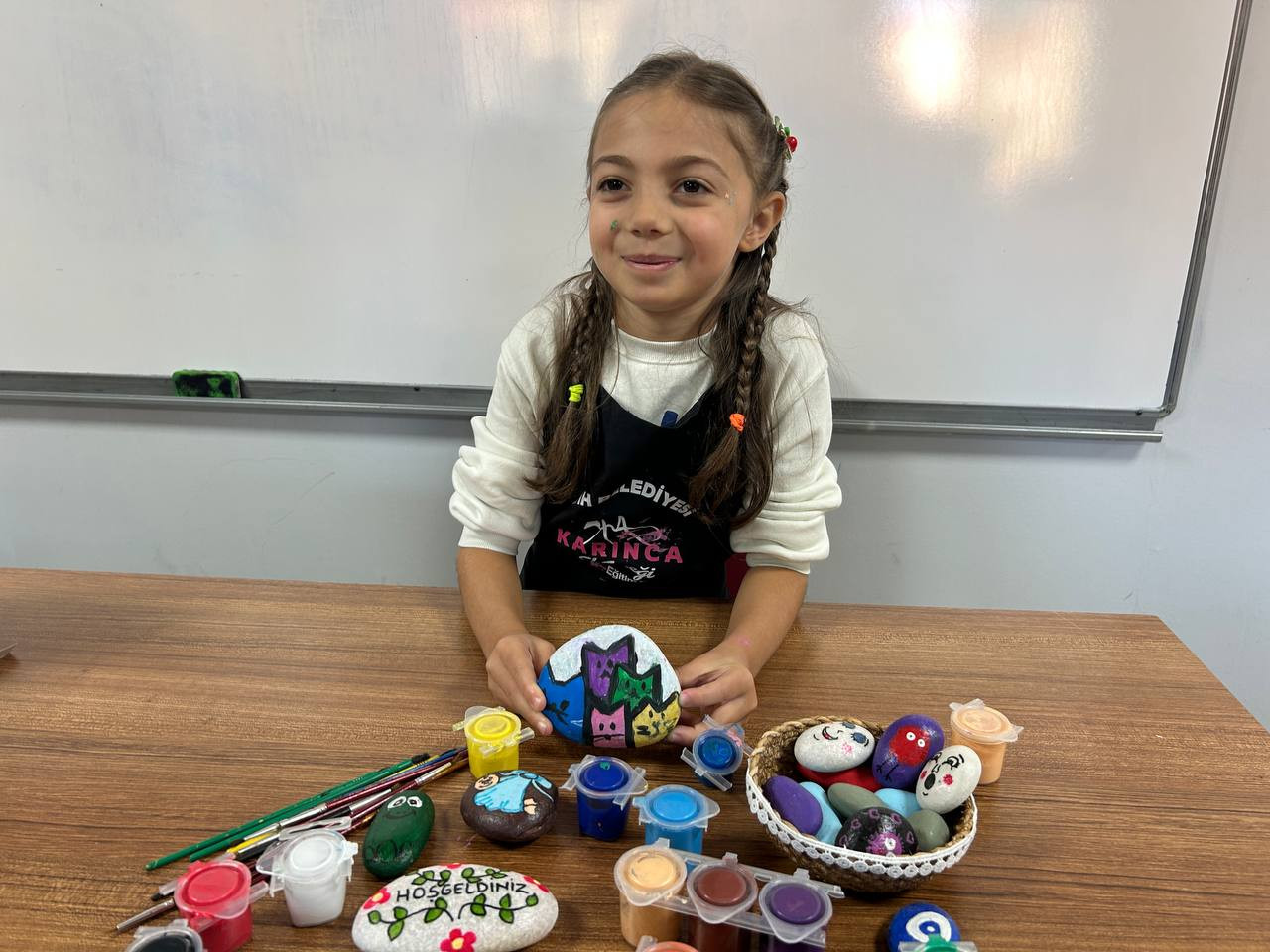 Taş boyama etkinliği, öğrencilerimizin ince motor becerilerini geliştirmenin ötesinde, yaratıcılıklarını özgürce ortaya koymalarını sağladı. Her bir öğrenci taşları kendi renkli dünyasıyla buluşturarak özgün eserler yarattı. Eğitmen, öğrencilerin sanatsal sürece olan ilgisini desteklerken her bir çocuğun bireysel yaratıcılığını açığa çıkarmasına özen gösterdi. Bu süreçte öğrenciler, her fırça darbesiyle taşları renklendirirken hayal gücünü nasıl somut hale getirebileceklerini deneyimlediler.