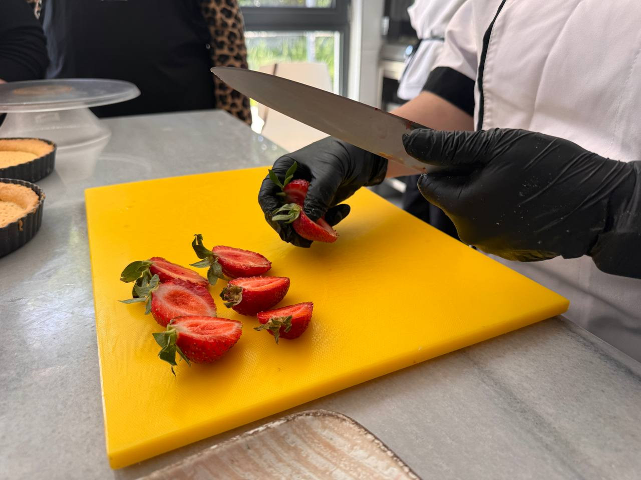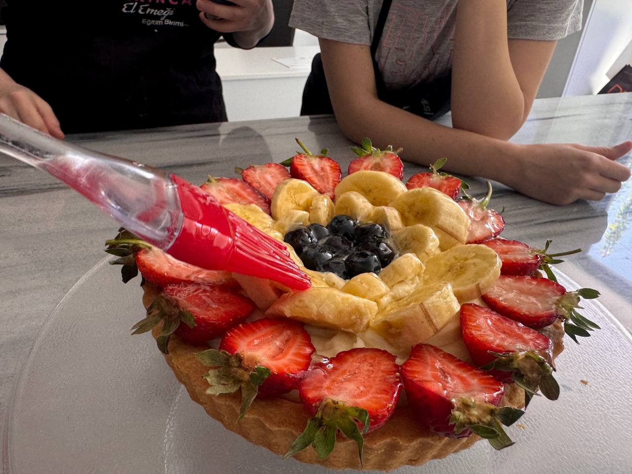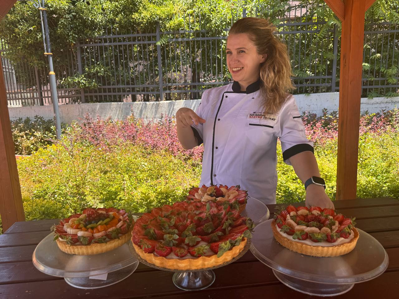 Atölyenin en renkli bölümü ise taze meyvelerle yapılan süsleme aşaması. Katılımcılar mevsimin en taze meyvelerini kullanarak tartlarını süslüyor. Meyvelerin renk uyumu ve estetik bir şekilde tartın üzerine yerleştirilmesi üzerine pratik bilgiler paylaşan eğitmenler katılımcılara her aşamada destek oluyor.