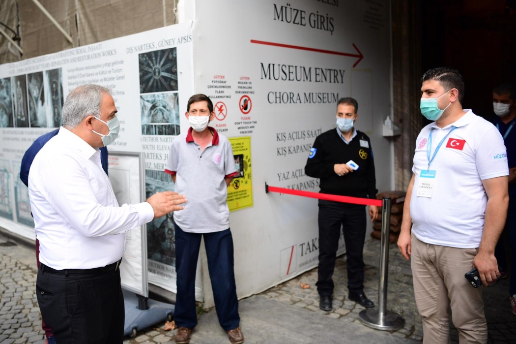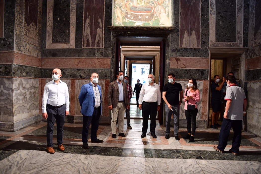Fatih Belediye Başkanı M. Ergün Turan, Cumhurbaşkanımızın imzaladığı kararnameyle ibadete açılacak olan Kariye Camii'nde sürdürülen çalışmaları inceledi.