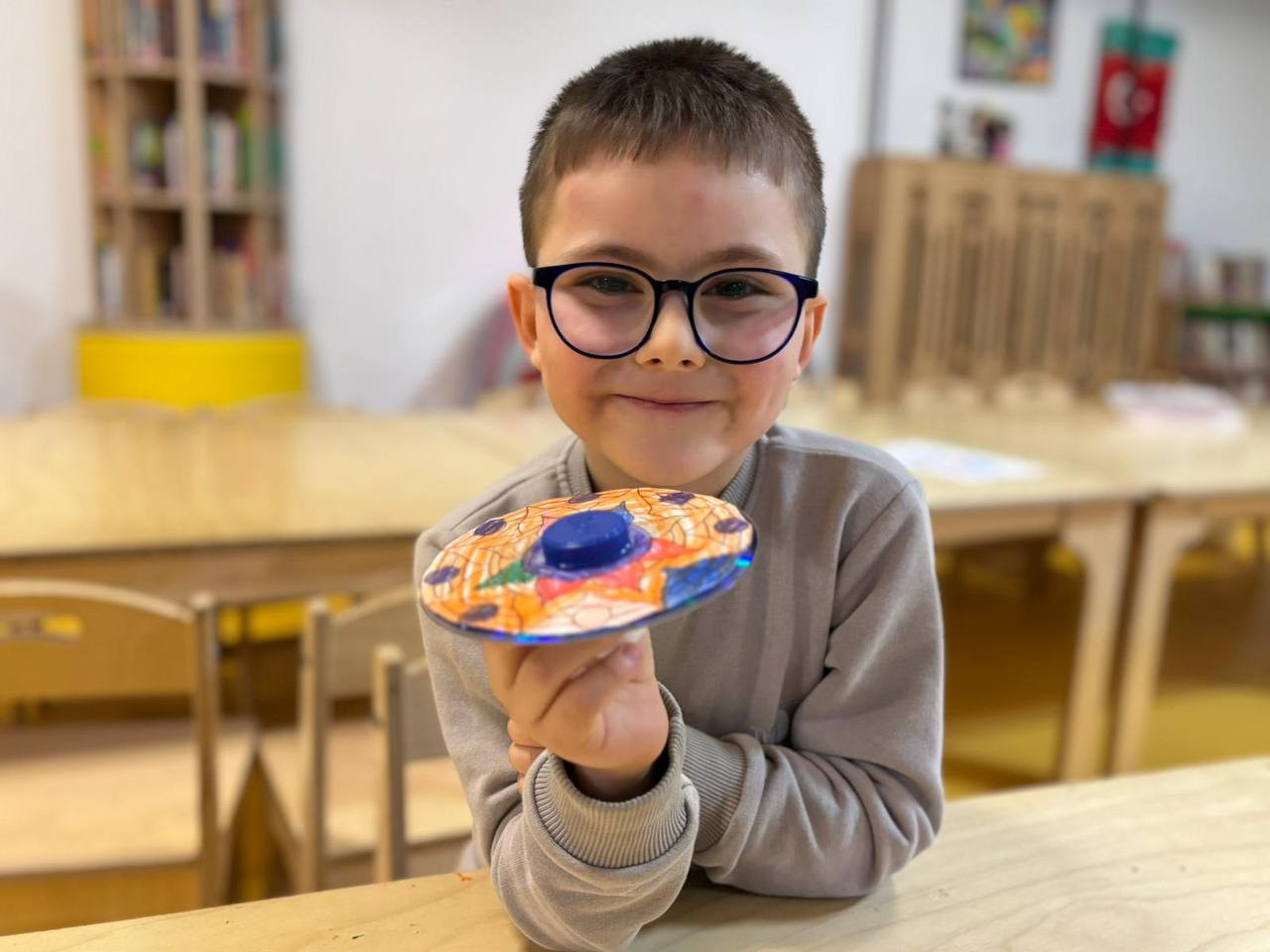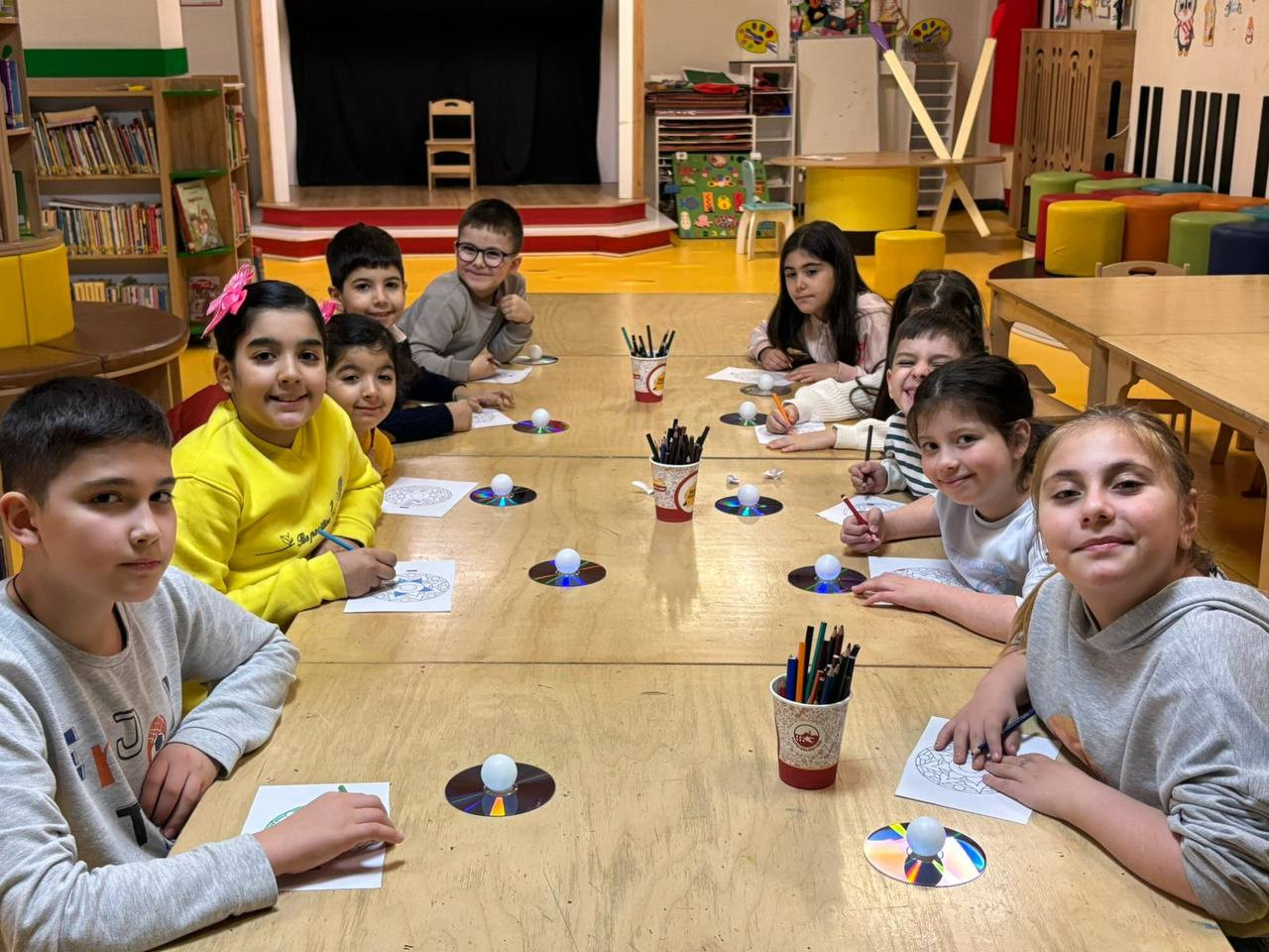 Programın devamında çocuklar, boyadıkları CD’leri ve pinpon toplarını kullanarak kendi topaçlarını tasarladı. CD’nin merkezine yerleştirilen pinpon toplarıyla hazırlanan topaçlar, dönme hareketi sırasında oluşan renk geçişleriyle görsel bir hareket ortaya çıkardı. Çocuklar tasarladıkları topaçları deneyerek hareket, denge ve dönüş prensiplerini gözlemleme fırsatı buldu. Böylece tasarım, üretim ve kullanım aşamaları bütüncül bir öğrenme süreci içinde ele alındı.