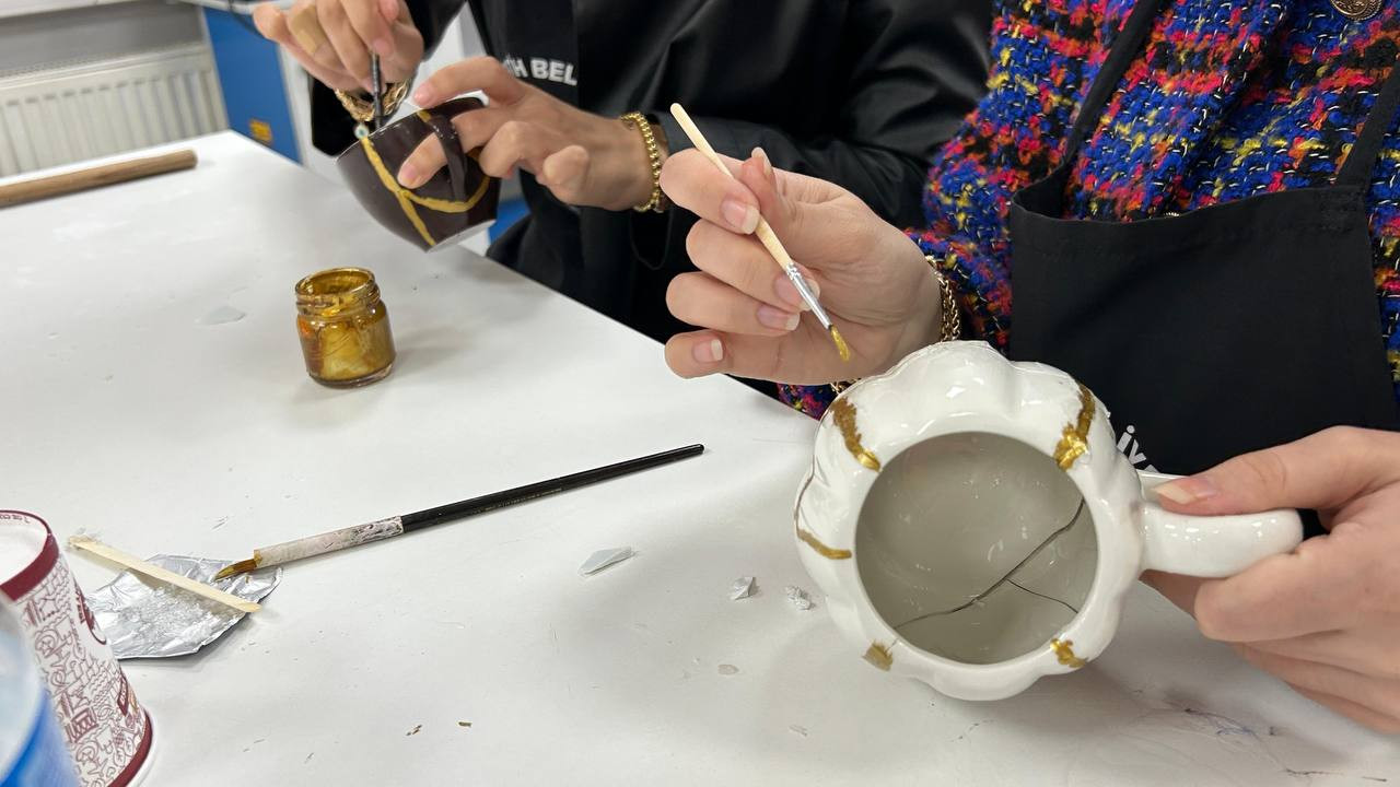 Kintsugi Japonya'nın dönüşüm felsefesine dayanan bir sanat dalıdır. Bu sanatta kırılan porselen ve seramik objeler altın tozu ile birleştirilerek yeniden kullanılabilir hale getiriliyor. Bu süreç kırıkların güzelliğini vurgularken aynı zamanda yaşanmışlıkların ve hatıraların değerini yüceltiyor. Atölyede katılımcılar getirdikleri ürünleri parçalayıp uygun yapıştırıcıları kullanarak kırılma noktalarını altın tozu ile birleştiriyorlar.