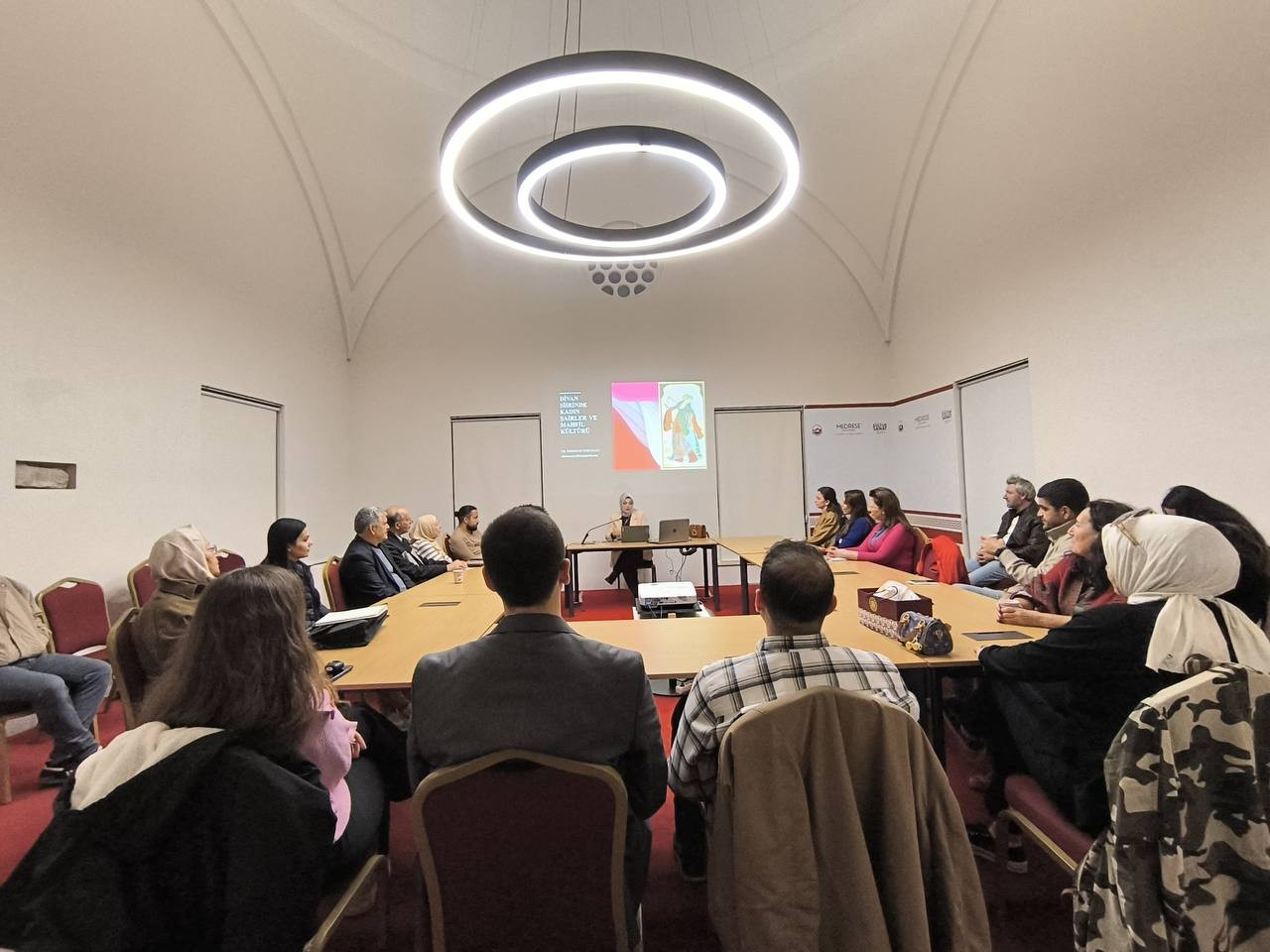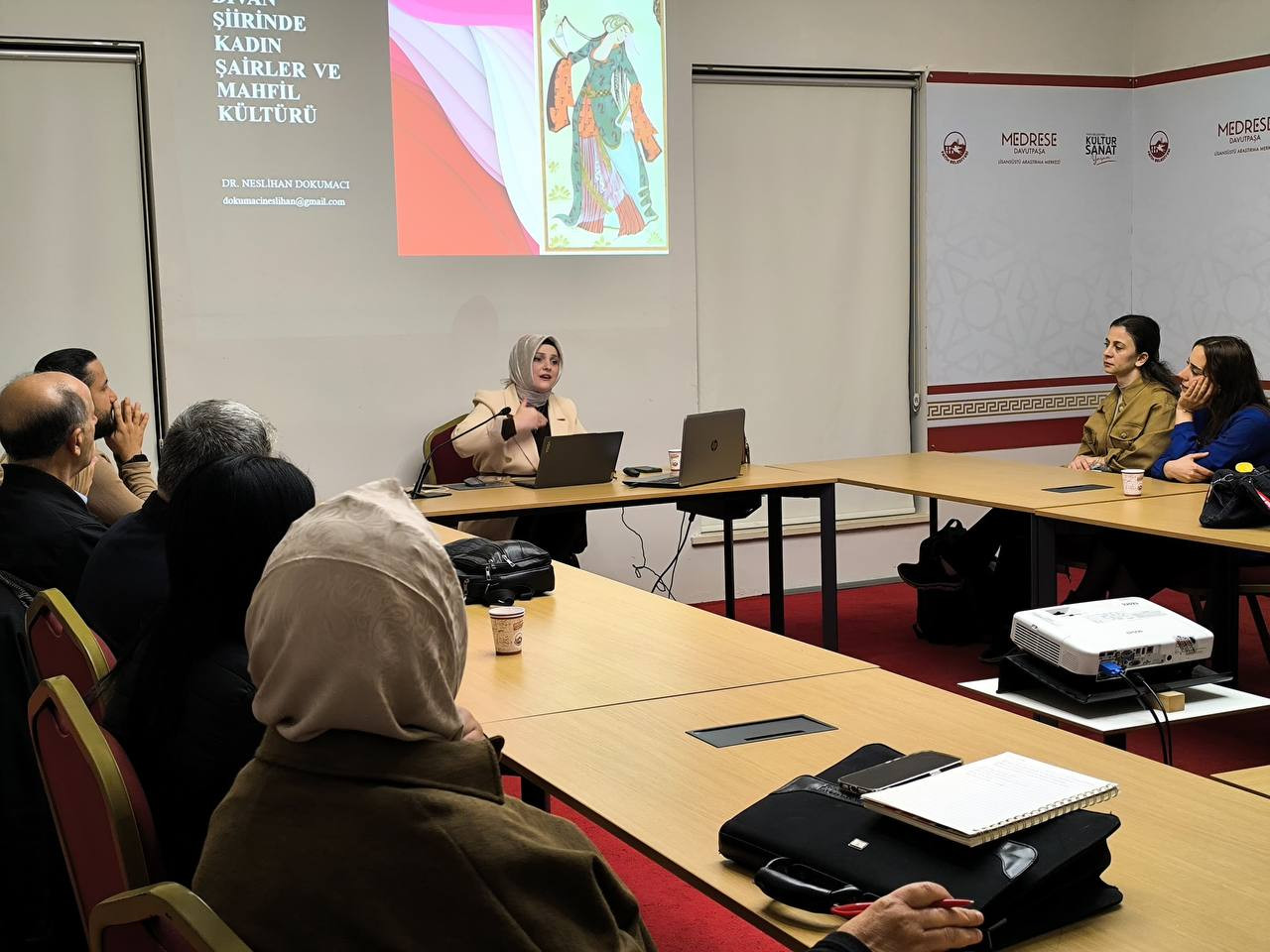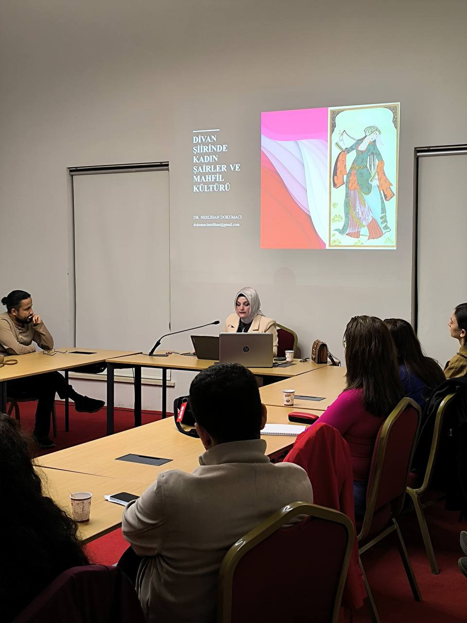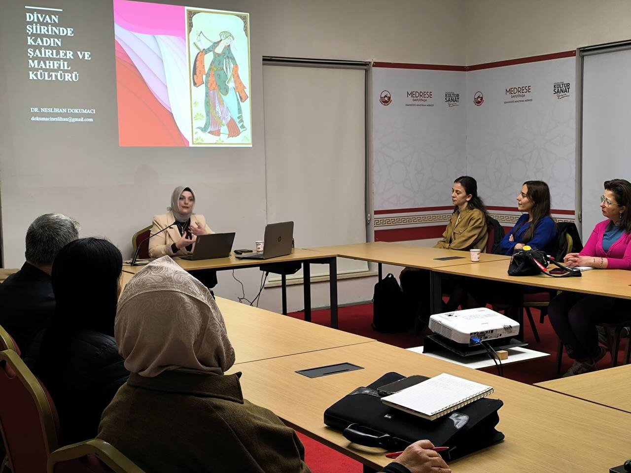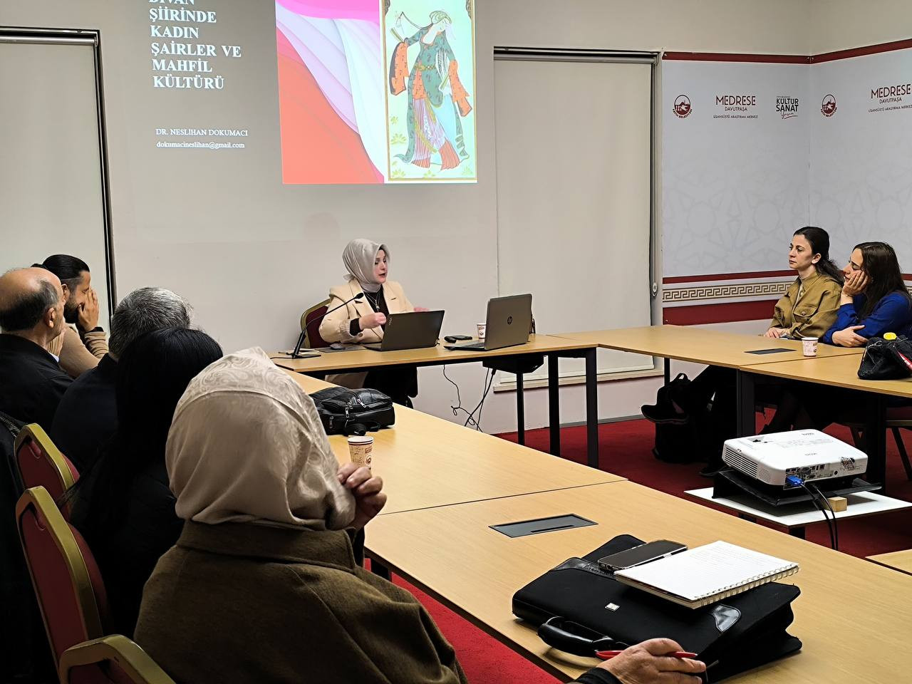 Bu çerçevede gerçekleştirilen buluşmada Dr. Neslihan Dokumacı, “Yûsufî Aşktan Yûsufî Şiire (Yûsuf ve Züleyha)” başlıklı konuşmasıyla klasik edebiyatımızda aşkın merkezî konumunu değerlendirdi. Kadın şairlerin üretim biçimleri, şiirin dolaşıma girdiği sosyal alanlar ve edebî çevrelerin kültürel dokusu üzerine yapılan giriş bölümünün ardından, Yûsuf ve Züleyha anlatısının divan şiirindeki yankıları örneklerle ele alındı.
