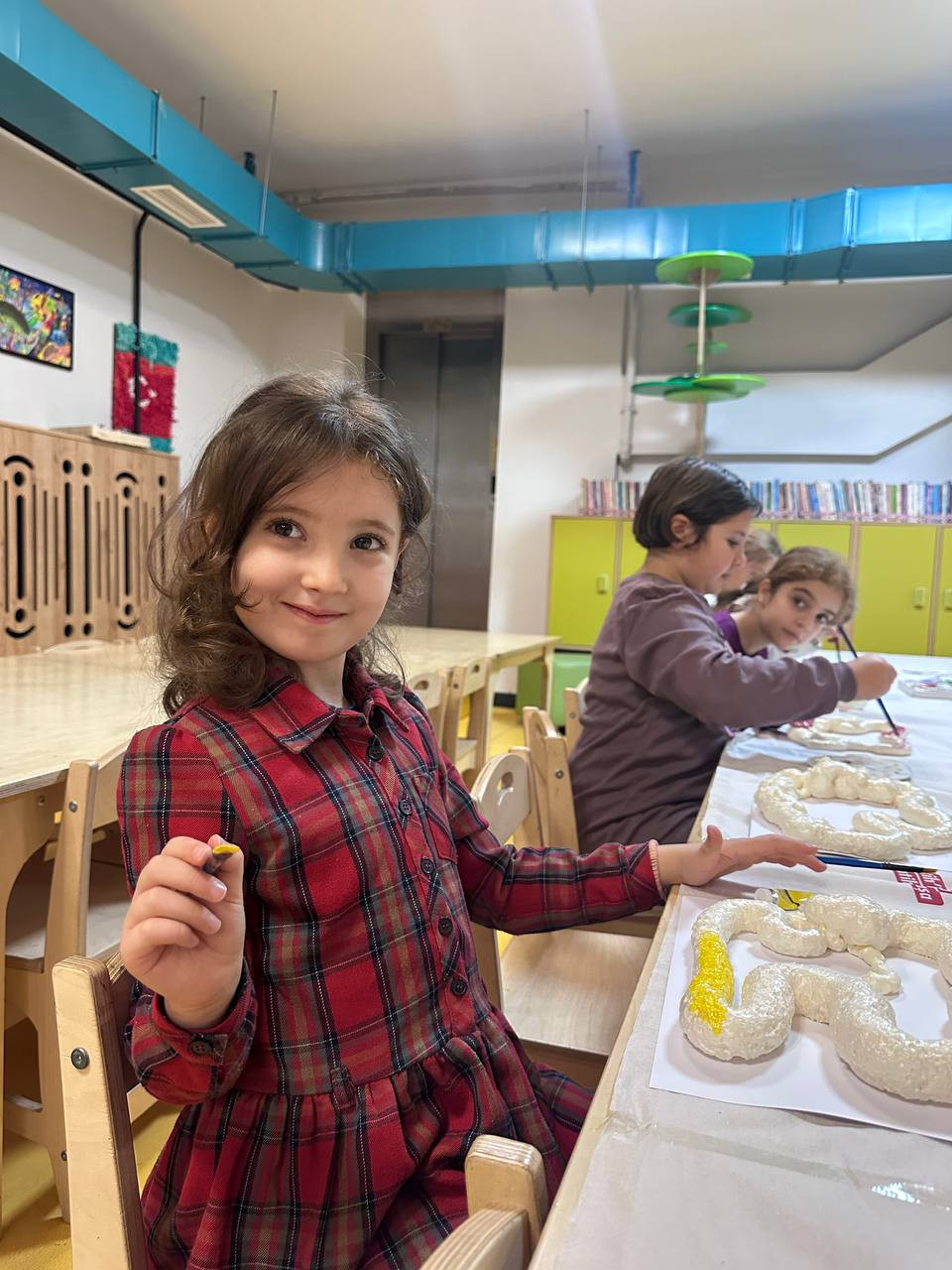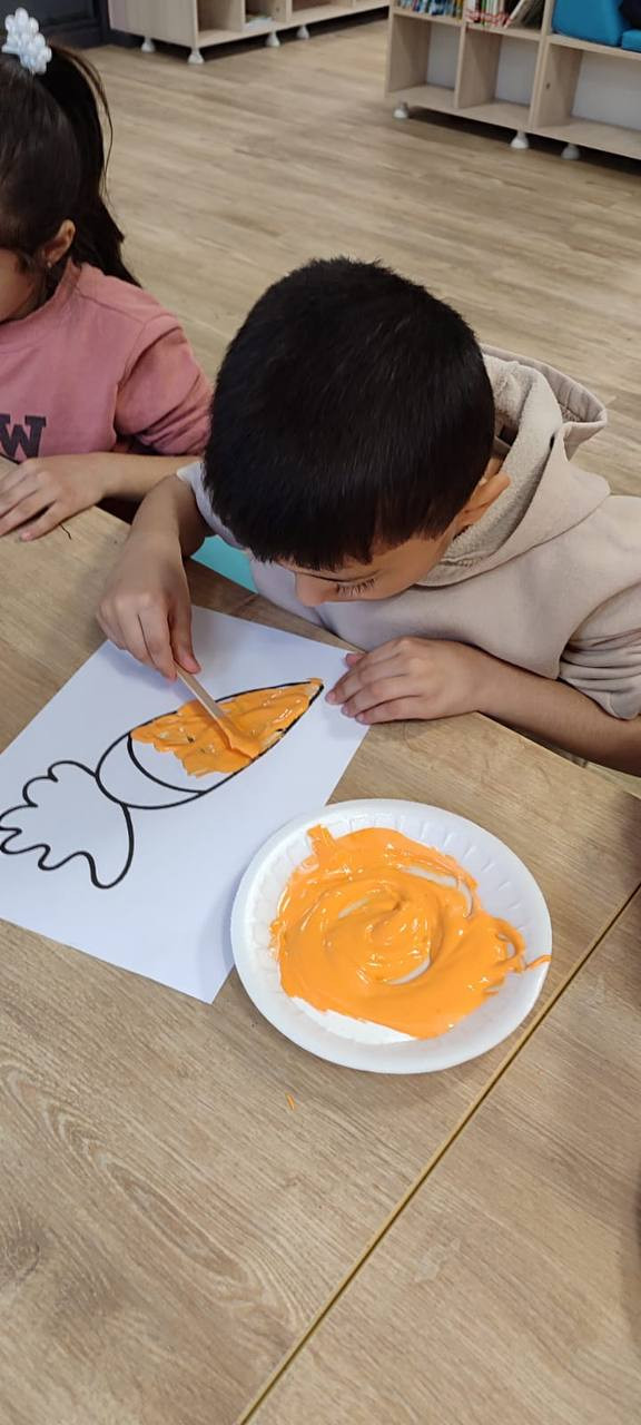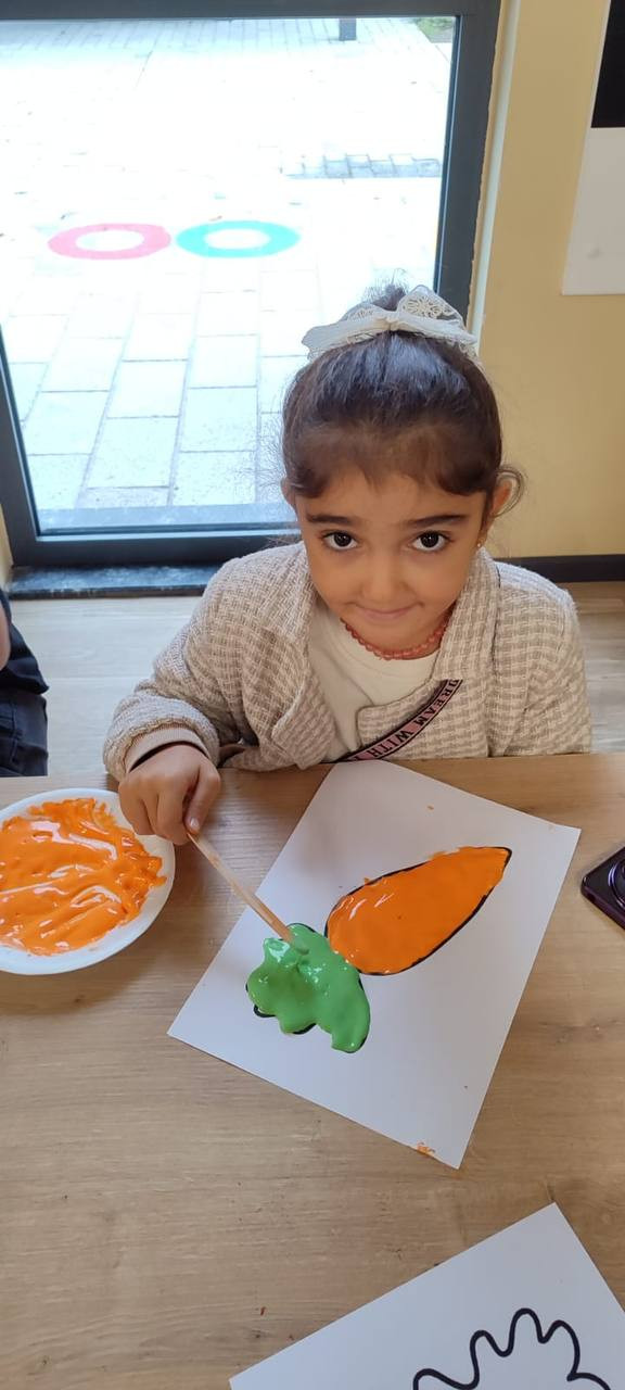 Atölye kapsamında çocuklar günlük yaşamda farklı amaçlarla kullanılan tutkal, akrilik boya ve tıraş köpüğünü bir araya getirerek özel bir karışım hazırladı. Hazırlanan bu karışım kuruma sürecinde ilginç bir dönüşüm gösterdi: Üst yüzeyi sertleşirken alt kısmı yumuşak kaldı. Bu farklılık çocuklara yalnızca boyamayı değil, aynı zamanda malzemelerin doğasını ve dokuların çeşitliliğini keşfetme fırsatı sundu.