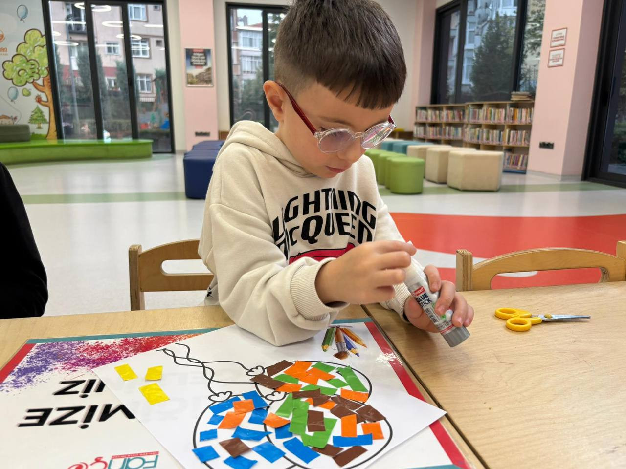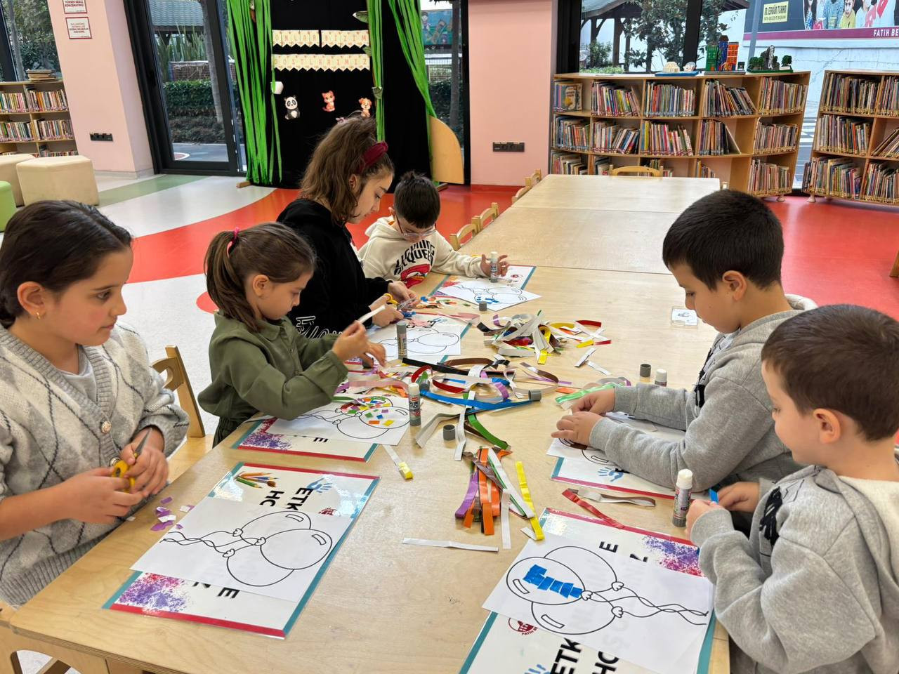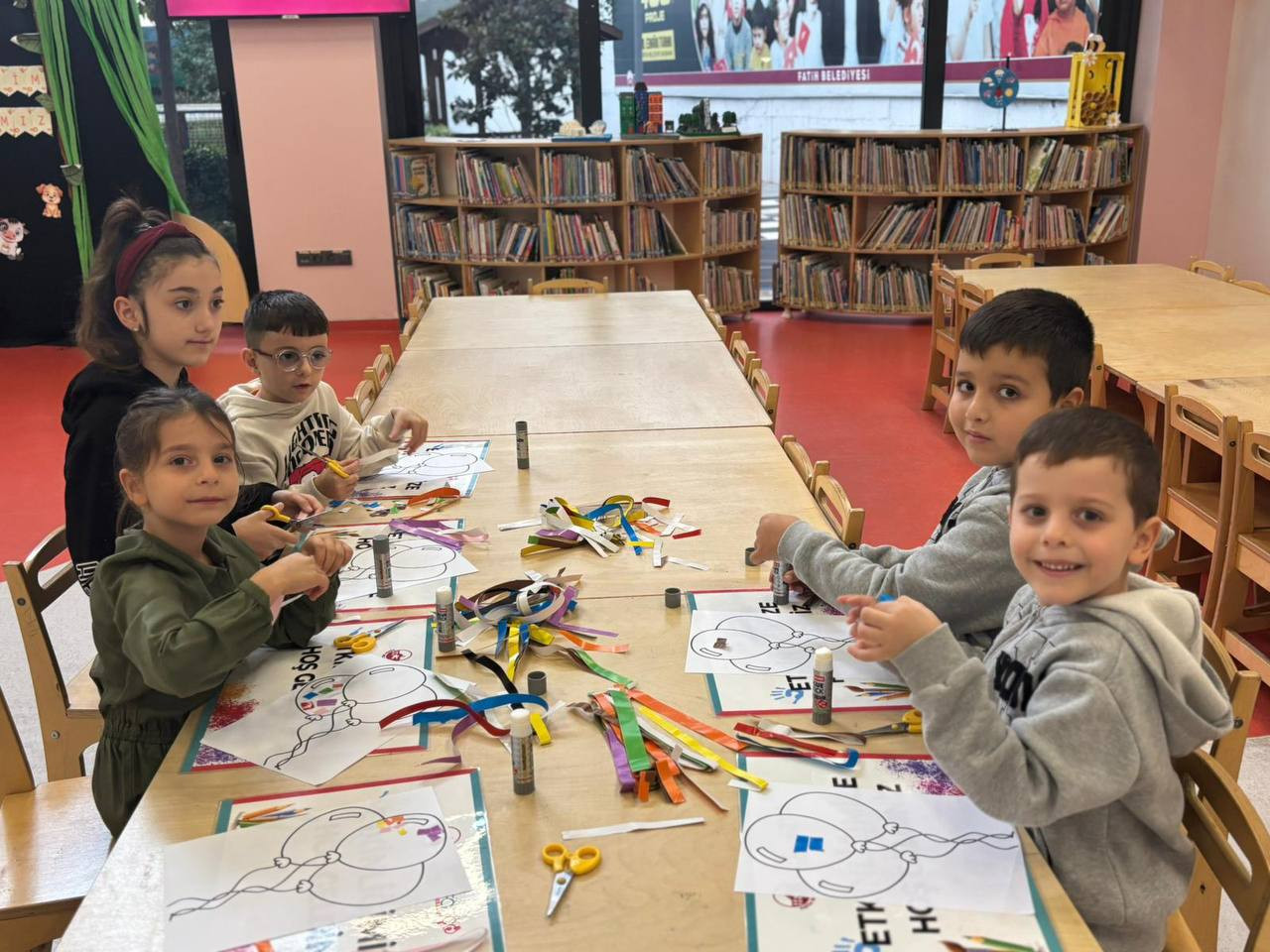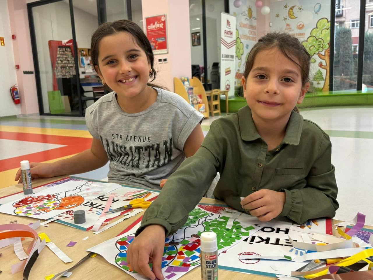 Etkinlik boyunca çocuklar yalnızca eğlenmekle kalmadı, aynı zamanda ince motor becerilerini geliştirdi, sabır ve dikkat gerektiren bir süreçten geçti. Her bir kesim, her bir yapıştırma işlemi onların küçük ellerinde adeta birer sanat hareketine dönüştü. Kâğıt parçaları birleşirken çocukların hayalleri de görünür hale geldi. Renklerin ve şekillerin uyumu kütüphaneyi canlı bir sanat galerisini andıran bir atmosfere bürüdü.