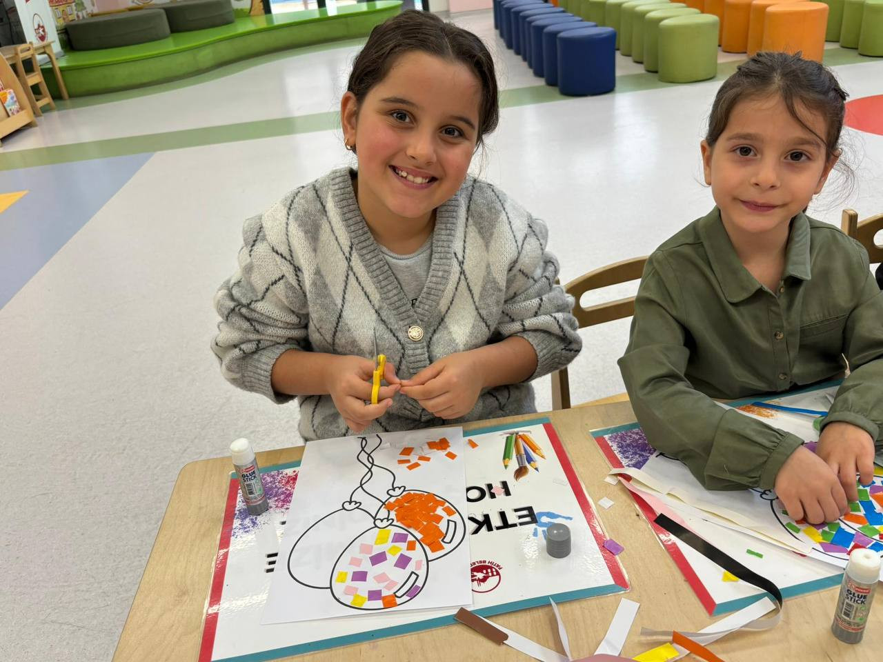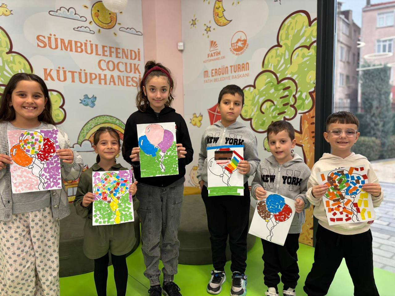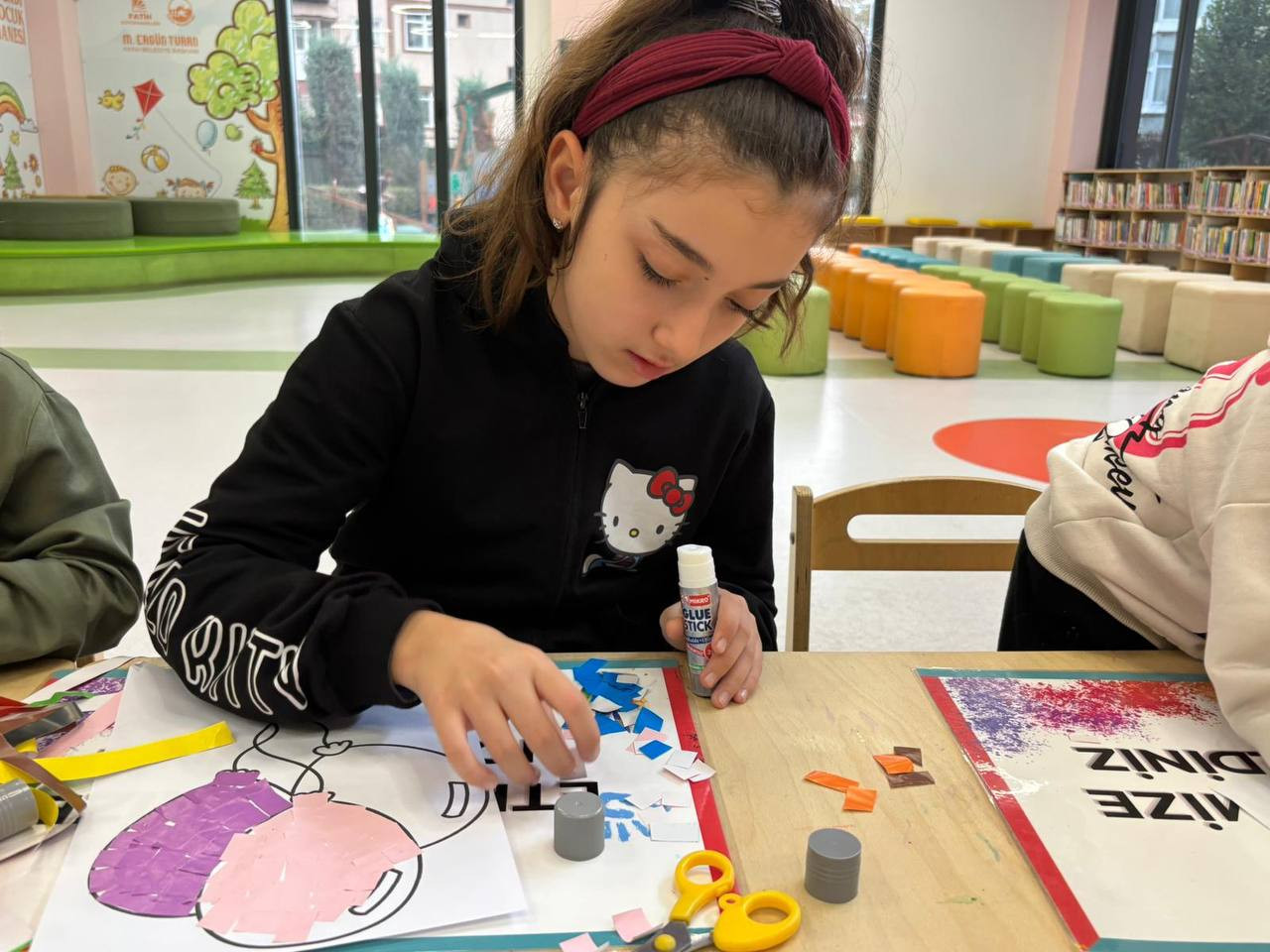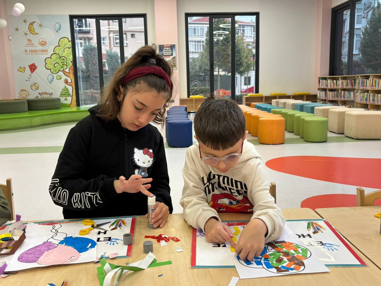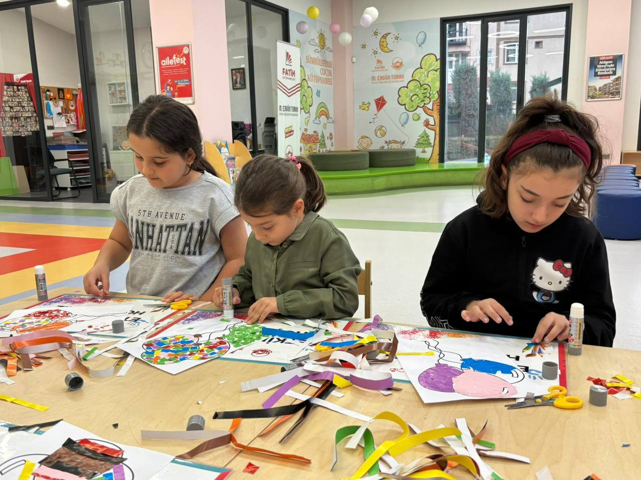 Etkinlik boyunca çocuklar yalnızca eğlenmekle kalmadı, aynı zamanda ince motor becerilerini geliştirdi, sabır ve dikkat gerektiren bir süreçten geçti. Her bir kesim, her bir yapıştırma işlemi onların küçük ellerinde adeta birer sanat hareketine dönüştü. Kâğıt parçaları birleşirken çocukların hayalleri de görünür hale geldi. Renklerin ve şekillerin uyumu kütüphaneyi canlı bir sanat galerisini andıran bir atmosfere bürüdü.