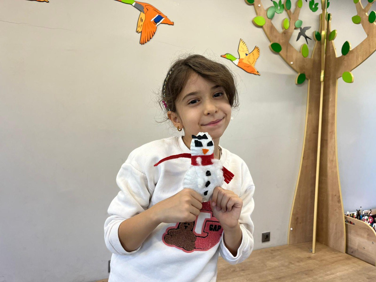 Atölye kapsamında çocuklar pinpon toplarından kardan adamlar tasarladı. Rehberlerin yönlendirmesiyle adım adım oluşturulan kardan adamlar çeşitli malzemelerle süslenerek her çocuğun hayal dünyasını yansıtan özgün eserlere dönüştü. Rengarenk şapkalar, atkılar, düğmeler ve diğer süsleme malzemeleriyle zenginleştirilen kardan adamlar çocukların bireysel dokunuşlarıyla tamamlandı.