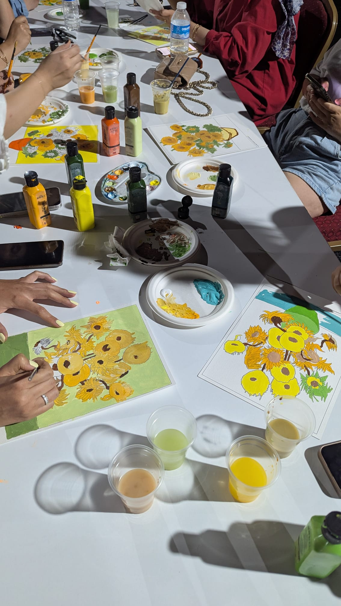 Etkinlik, sanat tarihçisi bir eğitmenin Van Gogh’un sanat hayatını ve “Ayçiçekleri” eserinin arka planını anlattığı kısa bir sunumla başladı. Eğitmen, Van Gogh’un renk kullanımı, kompozisyon anlayışı ve eserin sanat tarihindeki önemi hakkında katılımcılara değerli bilgiler sundu. Sunumun ardından vatandaşlarımız, Van Gogh Müzesi’nin web sitesinden sağlanan “Ayçiçekleri” şablonları eşliğinde akrilik boyalarla kendi eserlerini oluşturmaya başladı.