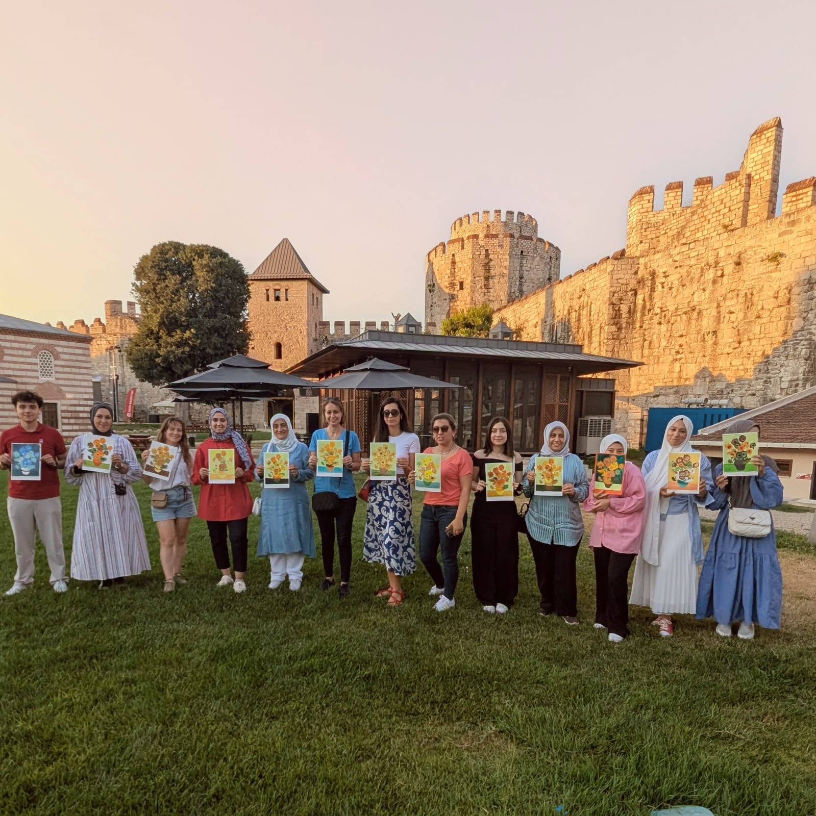 Yedikule Hisarı’ndaki etkinlikte vatandaşlarımız, Van Gogh’un “Ayçiçekleri” eserini akrilik boyalarla yeniden yorumladı. Sanat tarihçisi eğitmenin bilgilendirici sunumunun ardından katılımcılar kendi özgün eserlerini oluşturarak sanatla dolu bir gün geçirdi.