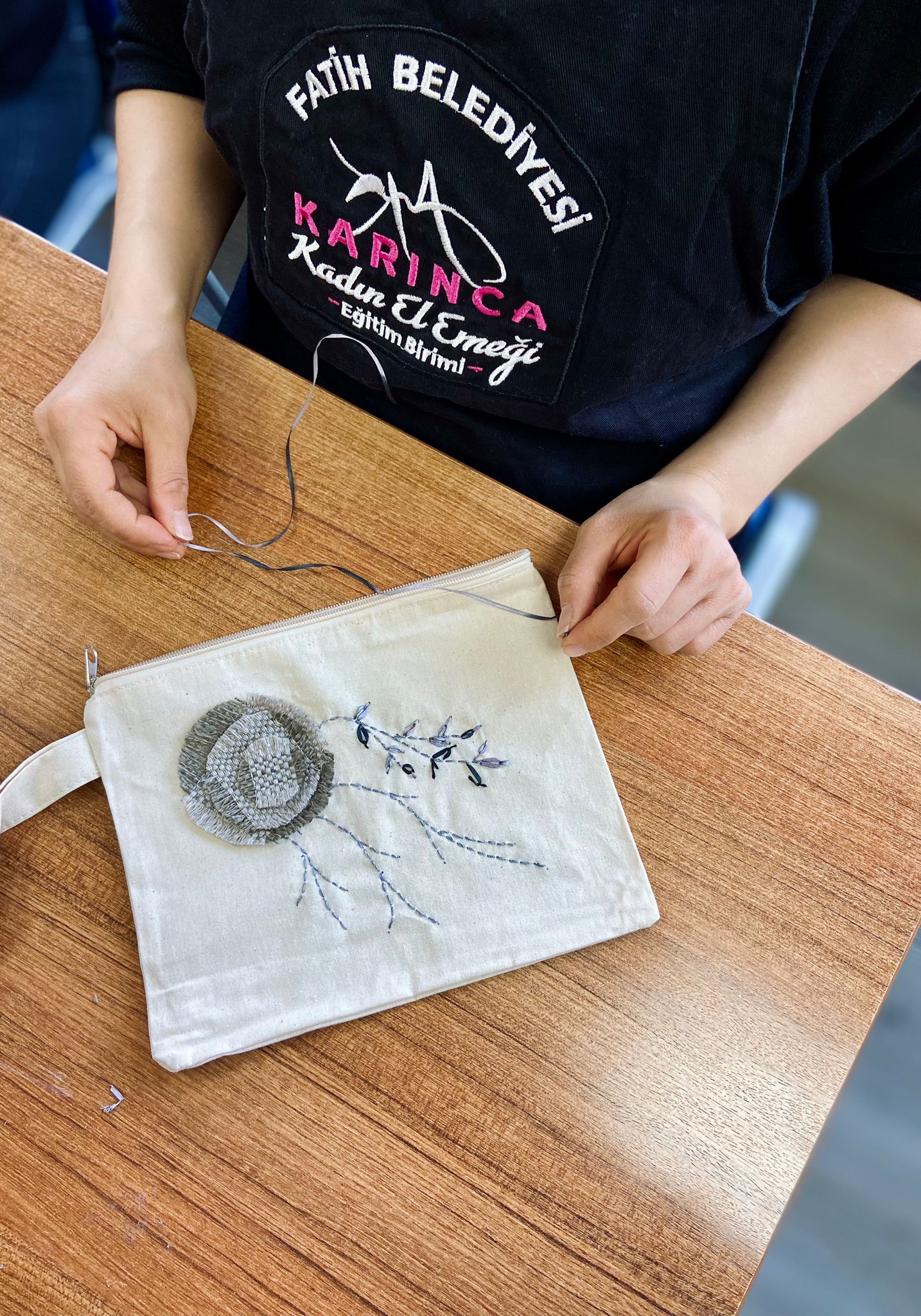 KARINCA Eğitim Birimi'nin düzenlediği Kumaş Çanta Atölyesi katılımcılara yaratıcı bir deneyim sunuyor. Katılımcılar atölyede özenle seçilmiş atık parça kumaşları belirlenen ölçülerde ve formlarda keserek, ardından tiftikleyip bu parçaları çantaya sabitleme becerilerini geliştiriyorlar. Ayrıca kurdele ve iplik kullanarak çeşitli desenler oluşturup kendi kişisel el çantalarını tasarlıyorlar. Bu atölye vatandaşların sadece el becerilerini geliştirmekle kalmıyor, aynı zamanda atık kumaşların geri dönüşümüne de katkıda bulunuyor. Sürdürülebilirlik ve yaratıcılığın buluştuğu bu keyifli etkinlik katılımcılar tarafından ilgiyle takip ediliyor.