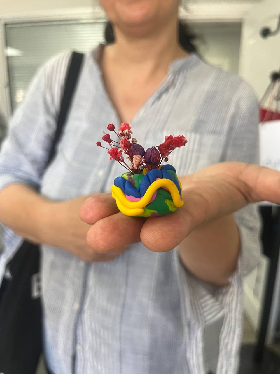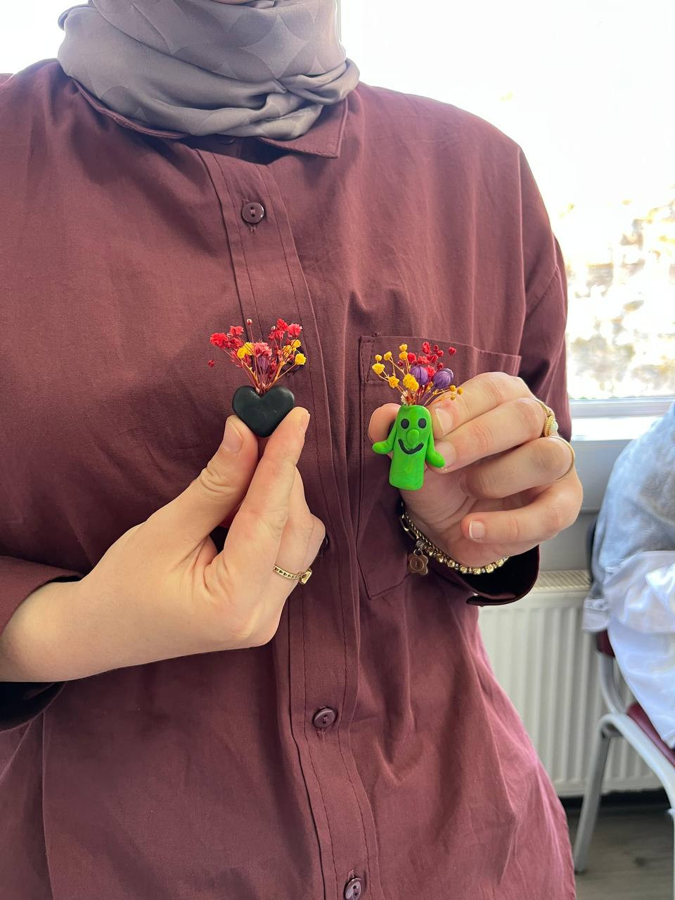 Polimer kilinmkolay şekil alabilen ve hayal gücüne geniş bir alan tanıyan bir malzeme olduğu vurgulandı. Eğitmen polimer kil ile küpe, kolye, broş, magnet, anahtarlık, kupa süslemesi ve hatta tablo gibi çeşitli objelerin yapılabileceğini belirtti. Ayrıca polimer kilin nasıl şekillendirileceği ve hangi sıcaklıkta pişirilmesi gerektiği konularında da katılımcılara rehberlik edildi.