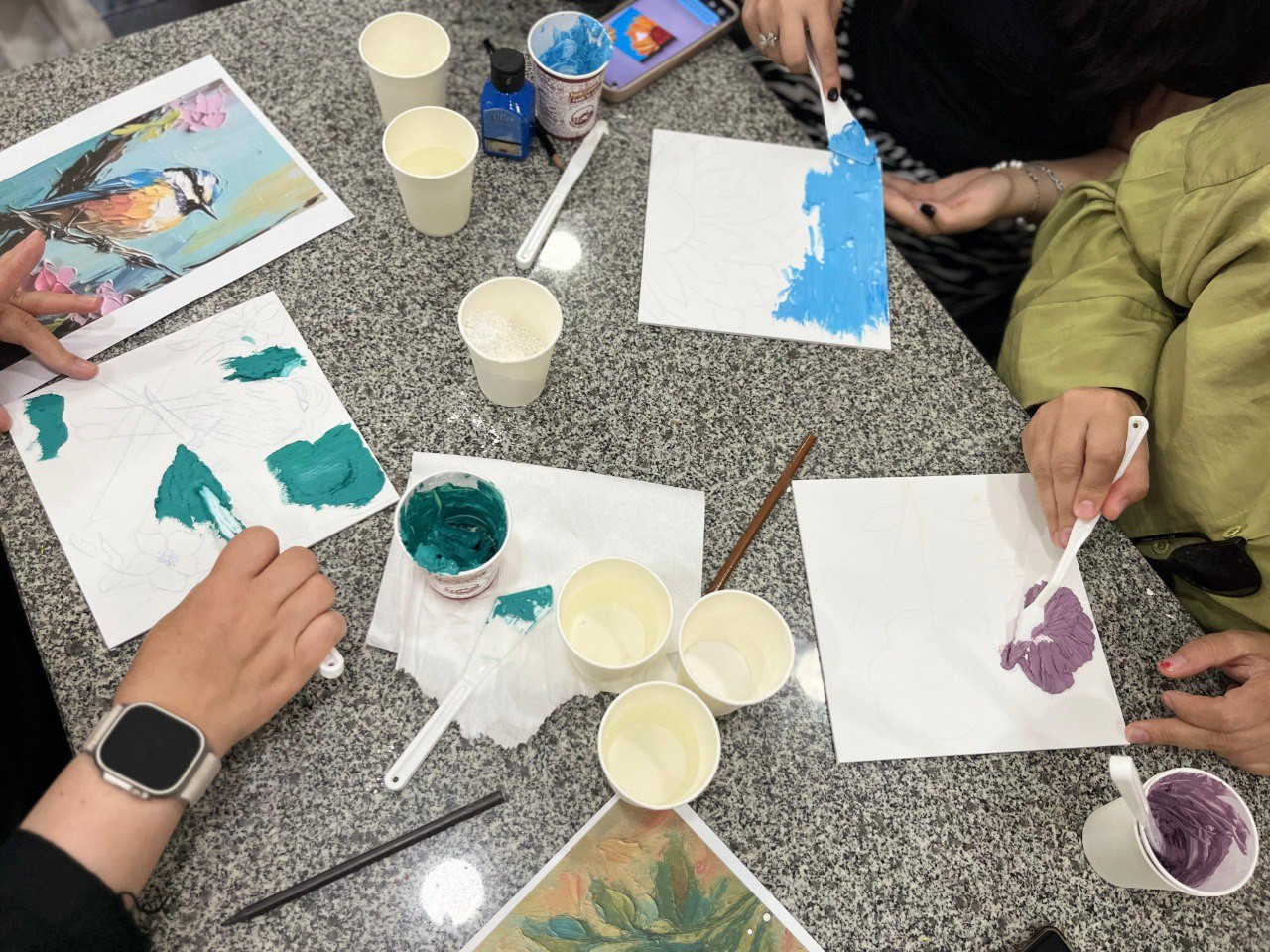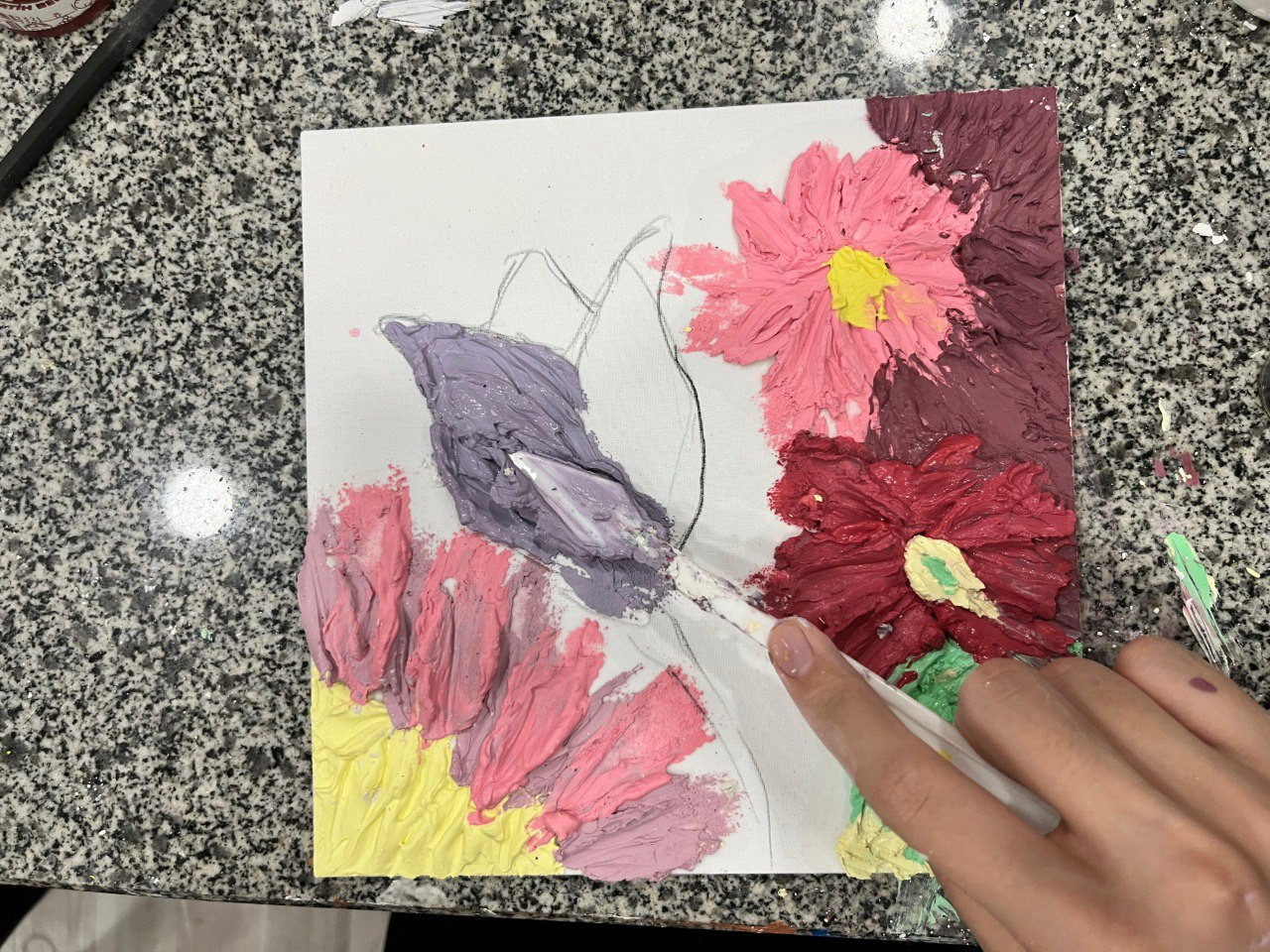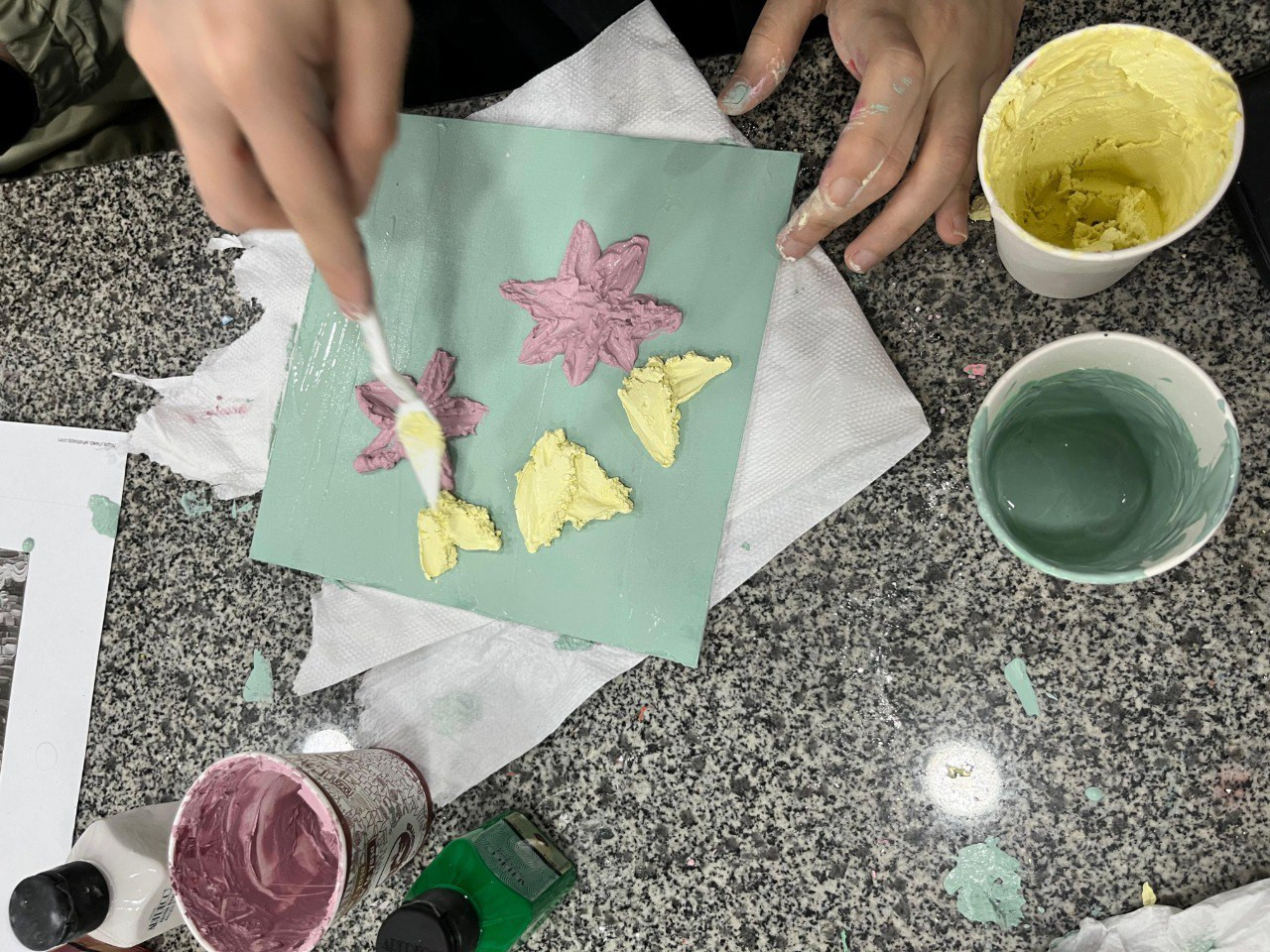 İmpasto kalın boya sürme tekniğiyle yüzeyde belirgin dokular oluşturmayı mümkün kılan özel bir yöntem. Bu teknikte fırça darbeleri ya da spatula izleri gizlenmez; aksine tuvalin dili haline gelir. Atölyeye katılan sanatseverler yüzeyle hacim arasındaki ilişkiyi yeniden düşünerek üç boyutlu etkiler elde etti. Yağlı boya ile gerçekleştirilen çalışmalarda renklerin yoğunluğu, katmanların kalınlığı ve fırça yönleriyle ortaya çıkan dokular her bir eseri özgün ve bireysel bir anlatım alanına dönüştürdü.